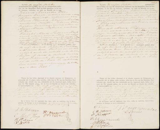 Op heden de vijfden October Achttienhonderd Drie-en-Vijftig, zijn voor ons ondergeteekende Ambtenaar van den Burgerlijken Stand der Stad Amsterdam, in het hui der Gemeente, verschenen, ten einde een Huwelijk aan te gaan Johannes Bernardus verbruggen krayen, geboren en wonende alhier oud zes en dertig jaren, weduwenaar van Maria Elisabeth Johanna Mulder meerderjarige zoon van Johannes Verbruggen Timmerman wonende alhier en Amna Maria Delman overleden ten Eenre Elizabet Maria Suzanna Hoop naaisten geboren en wonende alhier oud negen en twintig jaren, weduwe van Andries Iakes meerderjarige dochter van Justus Hoop overleden en Maria Elisabeth van der Kinderen onder bezoep, wonende alhier ten andere zijde De beide afkondiging en tot dit Huwelijk zijn onverhinderd geschied, alhier de vijf en twintigsten September laatstleden en den tweeden dezer voorts zijn aan ons over gelegd ten eersten de geboorte acten de verloofden, ten tweeden de doodacten hunnen vorige Echtgenooten, ten derden de doodeeli van den vader den Bruid. En verklaarde hare moeder voor ons tegenwoordig toe te stenmen in dezer Echt. Waarna wij hun hebben afgevraagd of zij elkander aannemen tot Echtgenooten, en getrouwelijk alle de pligten zullen vervullen, welke door de Wet aan den Huwelijken Staat verbonden zijn: hetwelk door hen, uitdrukkelijk met JA, beantwoord zijnde, hebben wij in naam der Wet uitspraak gedaan, dat zij door het Huwelijk aan elkander zijn verbonden. In tegenwoordigheid van: Hendrik Huigman wetk slijten oud drie en dertig, Pieter Diks sulemaker oud vijf en dertig, Hendrik Wijn gaarden schilder oud drie en vijftig en Si ter van den valk voermans knecht ond achten twintig jaren, wonende allen alhier En is hiervan door ons opgemaakt deze Akte, welke na voorlezing, door de Komparanten, de Getuigen en ons is onderteekend. wilgezonderd de hoeden die verklaarde niet te kunnen schryve Gnbre Achttienhonderd heden de vyfden October 1 Drie-en-Vijftig, zijn voor ons ondergeteekende Ambtenaar van den Burgerlijken Stand der Stad Amsterdam, in het huis der Gemeente, verschenen, ten einde een Huwelijk aan te gaan Gerrit Knopper kleerenmaker / milicien geboren te Breukelen Nyenrode arrondissement Utrecht wonende alhier, oud drie en twintig jaren, meerderjarige zoon van Tennis Knopper schippersknicht wonende alhier en Gerarda Maria de Bruin overleden ter Eenre Elisabeth Maria Petersen werkster geboren en wonende alhier, oud Drie en twintig jaren, meerderjarige dochter van Johannes Petersen overleden en Wendelia Antonia Gerarda van Warmels zonder beroep wonen de alhier ten andere zyde. in verklaarden de vader de Bruidegoms en de moede den Bruid voor ons tyen wond toe te stemmer in deze Echt. Debeide afkondigingen tot dit Huwelijk zijn onverhinderd geschied, alhier de vijf en twintigsten September laatstleden en der tweeden dezer voorts zyn aan ous overgelegd, ten eersten de gebooute acten den verloop den, te tweeden de doodacten van de moeder des Bruidegoms en den vader den Bruid Waarna wij hun hebben afgevraagd of zij elkander aannemen tot Echtgenooten, en getrouwelijk alle de pligten zullen vervullen, welke door de Wet aan den Huwelijken Staat verbonden zijn: hetwelk door hen, uitdrukkelijk met JA, beantwoord zijnde, hebben wij in naam der Wet uitspraak gedaan, dat zij door het Huwelijk aan elkander zijn verbonden. In tegenwoordigheid van: darmar Verharduszr zen broeder den Echtgenoo te bediende outwee en dertig Leendert Jan Delzenne schoenmaker oud zeven en veertig Jo kannes Gerardus van Rosmalen Clovoren oud vijf en vijftig en Dirk Douweswerkman oud negen en vijflij jaren, wonende allen alhier En is hiervan door ons opgemaakt deze Akte, welke na voorlezing, door de Komparanten, de Getuigen en ons is onderteekend. G: Kinopper renmde C M Petersen D Daunes J: Knopper W:A. G van Warmelo HG MEieterja J Deltgenae