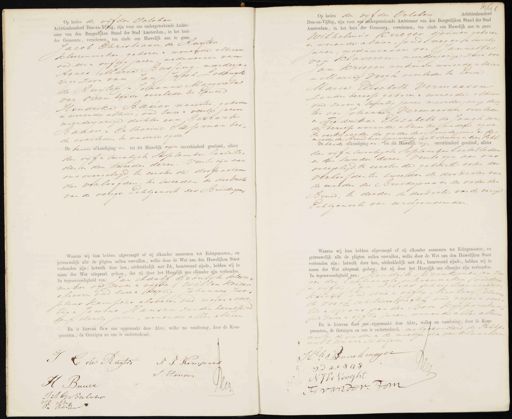 Op heden de vijfden October Achttienhonderd Drie-en-Vijftig, zijn voor ons ondergeteekende Ambte. naar van den Burgerlijken Stand der Stad Amsterdam, in het huis der Gemeente, verschenen, ten einde een Huwelijk aan te gaan Jacob Christiaan de Ruyter kleerenmaker, geboren en wonende alhier oud een en vyftig jaren, weduwenaar van — Agnes / Maria Bussing, meerderjarige zoon van Jan Jacob Lodewyk de Ruyten en Johanna Margareta van Over beide overleden ten Eenre Hendrika Bauer naaisten, gebouw en worende alhier, oud twee en veertig jaren meerderjarige dochter van Gerrard Bauer en Catharina Tiepman beide overleden ten andere zijde. De beide afkondiging en tot dit Huwelijk zijn onverhinderd geschied, alhier den vijf en twintigsten September laatstleder en den tweeden dezer. Voorts zijn aan ons overgelegd te eersten de doop acten den verloofden, ten tweeden de doodach van de vorige Echtgenoote des Bruidegoms Waarna wij hun hebben afgevraagd of zij elkander aannemen tot Echtgenooten, en getrouwelijk alle de pligten zullen vervullen, welke door de Wet aan den Huwelijken Staat verbonden zijn: hetwelk door hen, uitdrukkelijk met JA, beantwoord zijnde, hebben wij in naam der Wet uitspraak gedaan, dat zij door het Huwelijk aan elkander zijn verbonden. In tegenwoordigheid van: Jan Adolf Gronloh Kleeremaken ou zeven en vijftig, willem keizen als voren oud twee en dertig, Johannes Josephus kempers alvooeen oud negen en veertig en Jacobus Hansen zonder teralpoud eene dertig jaren, wonende allen alhier En is hiervan door ons opgemaakt deze Akte, welke na voorlezing, door de Komparanten, de Getuigen en ons is onderteekend. J. I. Kimpers E de Rugter F Hansen. H Bauer WO JA Wroulot Op heden den vijfden October Achttenhonderd Drie-en-Vijftig, zijn voor ons ondergeteekende Ambtenaar van den Burgerlijken Stand der Stad. Amsterdam, in het huis der Gemeente, verschenen, ten einde een Huwelijk aan te gaan Wil helmus Krieger sjouwer geboren en wonende alhier, oud negen en twintig jaren, weduwenaar van Jannetge. van Klaveren, meerderjarige zoon van Jan Krieger werkman wonende alhier en Maria Voog 2 overleden ten Eenre Maria Elisabeth Vermaas en zouden beroep geborenen wonende alhier oud zeven en twintig jaren meerderjarige doen ter van Johannes Vermansen overleden en Fredrika Elizabeth de Jongh zonder beroep wonende alhier ter Candere zyde En verklaarden de vader des Bruedes oms is moeder den Bruid hier tegenwoordig toe te stemmen in deze Echt. De beide afkondiging en tot dit Huwelijk zijn onverhinderd geschied, alhier den vijf en twintigsten September laatstleden en den tweeden. dezer, Voorts zyn aan ons overgelegd, te eersten de geboorte-acten den verloofden, ten tweeden de doodaaten van de moeder des Bruidegons en den vader den Bruid, ten derden de doodache van de vorige Echtgenoote van eerstgenoemden. Waarna wij hun hebben afgevraagd of zij elkander aannemen tot Echtgenooten, en getrouwelijk alle de pligten zullen vervullen, welke door de Wet aan den Huwelijken Staat verbonden zijn: hetwelk door hen, uitdrukkelijk met JA, beantwoord zijnde, hebben wij in naam der Wet uitspraak gedaan, dat zij door het Huwelijk aan elkander zijn verbonden. In tegenwoordghed van: Hendrik Brinkmerjen Zan gen des Echtgenoots schoenmaker oud drie en vijftig, Jan Delsus schoorsteenvegerskrecht oud drie en vijftig Nicolaags Johin de voogt schilderskneeht oud negen en veer tig & Frans van der Bom Kuiperskuat oeid twee en vijftig jaren, wonende allen alhier En is hiervan door ons opgemaakt deze Akte, welke na voorlezing, door de Komparanten, de Getuigen en ons is onderteekend. nitgezonderd de Echtjenooten de vader en de moehen die verklaarden niet te kunnen schrijven : Brinkenager E J De 8AD WG9 N J De Vooght 1 Som Evinder.