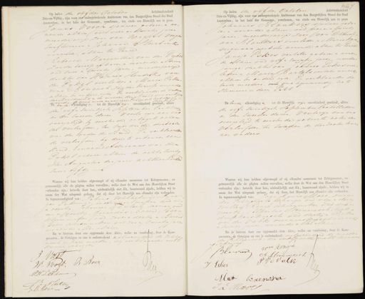 Op heden de vijfden October Achttienhonderd Drie-en-Vijftig, zijn voor ons ondergeteekende Ambtenaar van den Burgerlijken Stand der Stad. Amsterdam, in het huis der Gemeente, verschenen, ten einde een Huwelijk aan te gaan Janus Voogh sjouwer geboren en wonende alhier oud vier en twintig jaren meerderjarige zoon van Wigert voogz Zurfdragen en Johanna Heerlink wonende alhier ten Eenre Rebécca Margaretha van den Eykel zouden beroep geboren en wonende alhier oud twee en Gwintig jaren, minderjarige dochter van Hannes Hendrik van den Eykel overleden en Maria Catharina Bouquet zonder beroep wonende alhier ten andere zijde En verklaarde de vader des Bruidegoms en de moeder den Bruid voor ons tigen woordig, de eerste mede namen zyne Echtgenoote toe te deme in =deren Echt. De beide afkondiging en tot dit Huwelijk zijn onverhinderd geschied, alhier den vijfen twintigsten September laatstleden en den tweeden dezer. Voorts zyn aan vas overgelyd, ten eersten de gebogete acten de verloofden, ten tweeden de doodacle van den vader den Bruid. En verklaarden de verloofden, bij deze te erkinnen een kind, genaamd Adrianus van den Tykel geboren alhier den achten twintig sten Augustus des jaars achttien honderd twee en vijftig Waara wij hun hebben dggemaagd of zij elkander aamemen tot Echtgenooten, en getrouwelijk alle de pligten zullen vervulen, welke door de Wet aan den Huwelijken Staat erbonden zin: hetwelk door hen, uitdruakkelijk met Id, beantwoord zijnde, hebben wij in naam der Wet uitspraak gedaan, dat zij door het Huwelijk aan elkander zijn verbonden En tegenwoorddghid van: Petrus Wilhelmus Zijnst gen Eekma, instramentmaker oud vier en veertig, Johannes Glulsch zeeman oud een en veertig, Gerardus Barend Boen kleere maken oud zeven en dertig en Barens Boen schoenmaker oud zes en twintig jaren wonende allen alhier En is hiervan door ons opgemaakt deze Akte, welke na voorleting, door de Komranten, de Getuigen en ons is onderteekend. a Egezonderd de Echtje Waara wij hun hebben dggemaagd of zij elkander aamemen tot Echtgenooten, en getrouwelijk alle de pligten zullen vervulen, welke door de Wet aan den Huwelijken Staat erbonden zin: hetwelk door hen, uitdruakkelijk met Id, beantwoord zijnde, hebben wij in naam der Wet uitspraak gedaan, dat zij door het Huwelijk aan elkander zijn verbonden En tegenwoorddghid van: Petrus Wilhelmus Zijnst gen Eekma, instramentmaker oud vier en veertig, Johannes Glulsch zeeman oud een en veertig, Gerardus Barend Boen kleere maken oud zeven en dertig en Barens Boen schoenmaker oud zes en twintig jaren wonende allen alhier En is hiervan door ons opgemaakt deze Akte, welke na voorleting, door de Komparanten, de Getuigen en ons is onderteekend. a it gezondend de Echtgen noote, en hare moeden, die verklaarden mette kunnen schrijven Voogd B Boer W: Voogt. n Co P.W LEekma 7 Slutsen V.B. BoerOp heden de vijfden October Achttienhonderd Drie-en-Vijftig, zijn voor ons ondergeteekende Ambtenaar van den Burgerlijken Stand der Stad. Amsterdam, in het huis der Gemeente, verschenen, ten einde een Huwelijk aan te gaan Johannes Blankers sjouwer gebo. ren en wonende alhier, oud negen en twintig jaren, meerderjarige zoon van Christiaan Blankers overleden en Maria Kemmenaar werksten wonende alhier ter Eerre Jansje Eskes ventsten geboren en wonende alhier oud vijf en twintig jaren, meerderjarige dochter van /vannes iskes over. leden en Maria Bartelsvertsten wonende alhien ten andere zyde. in verklaarden de beide moeders, voor ons tegenwoordig, toe te stemmer in deze Echt. De beide afkondiging en tot dit Huwelijk zijn onverhinderd geschied, alhier de vijf en twintigsten September laatstleden en den tweeden dezer Voortszijn van ons overgelegd, te eersten de geboorte acten den verloofden, ten tweeden de doodacten hun nen vaders. Waarna wij hun hebben afgevraagd of zij elkander aannemen tot Echtgenooten, en getrouwelijk alle de pligten zullen vervullen, welke door de Wet aan den Huwelijken Staat verbonden zijn: hetwelk door hen, uitdrukkelijk met JA, beantwoord zijnde, hebben wij in naam der Wet uitspraak gedaan, dat zij door het Huwelijk aan elkander zijn verbonden. In tegenwoordigheid van: Jean Louis Mare, zwap des Echtgenoots behangen oud vier en dertig Willen Ronge schoenmaker oud drie en veertig, Albertus Stemmesch, boek 6 drukkers knecht oud dertigen Pieten van den Valk voermanskucht oud acht entwintig jaren, wonende allen alhier En is hiervan door ons opgemaakt deze Akte, welke na voorlezing, door de Komparanten, de Getuigen en ons is onderteekend. vilgezonderd de machtig der Echlgenoote, die verklaarde niette kannen schryvens. Wm Rong
