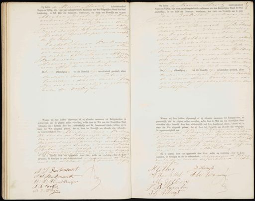Op heden de Negenden Maart Achtienhonderd Negen-en-Vijftig, zijn voor ons ondergeteekende Ambtenaar van den Burgerlijken Stand der Stad Amsterdam, in het huis der Gemeente, verschenen, ten einde een Huwelijk aan te gaan Abraham Israel Buitenkanwerkman /miliciën / geboren en wonende alhier, oud zevene dertig jarin, meerderjarige zoon van Iroel David Buitenkanten Mi Machiel Izerkoper beide overle den ter Eenre Rachel Simon Kerkmeester werkster geborene wonende alhier oud eenen dertig jaren, meerderjari ge dochter van Simon Abraham Kerkmeester overleden en Matje Haaring groen leverkoopster wonende alhier ter onderd zyde Deheide afkondiging & tot dit Huwelijk zijn onverhinderd geschied, alhier den zeven en twintigsten ebruary laatstleden en zesden dezer. voor zyn aan vas overgelegd de geboorteacten der verloofden. Waarna wij hun hebben afgevraagd of zij elkander aannemen tot Echtgenooten, en getrouwelijk alle de pligten zullen vervullen, welke door de Wet aan den Huwelijken Staat verbonden zijn: hetwelk door hen, uitdrukkelijk met JA, beantwoord zijnde, hebben wij in naam der Wet uitspraak gedaan, dat zij door het Huwelijk aan elkander zijn verbonden. In tegenwoordighed van Abraham Simon Verkmas ter broeder der Echtgenoote diamants vij der oud viere dertig Arend wols vlusen kruyer zwoger derzelve dirmanklij per oud vier en dertig Samvel Lucas Sarlus zouden beroep oud een en tachtig Moses Isaad Fortuyn zouder beroep oodnen bor ate jaren, wonende allen alhier Een en zevgenaakt deze Akte, welke na voorlezing, door de Komparanten, de Getuigen en ons is onderteekend. en gehonderd de Echtgenoote, die verklaarde niett te kunnen schrijven A S Ruitenrant A.S Kormeester lig B: W: Vleischkruyer T. L. Sarbel M. J. Tortuys Op heden de Negenden Maart Achttienhonderd N Negen-en-Vijftig, zijn voor ons ondergeteekende Ambtenaar van den Burgerlijken Stand der Stad 1 Amsterdam, in het huis der Gemeente, verschenen, ten einde een Huwelijk aan te gaan Jan Boekstal werkman /milo cien / geborene wonende alhier, oud vier en twintig jaren, meerderjarige zoon van Hendrick Boekster schoenmaker en Johanua Christina van Engelen wovende alhier ter Een Maria Gilbers, werkster geboren en wozerde alhier, oud achttien jaren, minderjarige nataarlyke erkende dochter van Maria Gilberg urfvulster, wonende alhier ter an. dere zyde. En verklaarden de ouder denBruidegoms en de moeder der Brui voor ons tegenwoordig toe te stemmen in den, Debeide afkondiging, tot dit Huwelijk zijn onverhinderd geschied, alhier den zeven en twintigsten February laatste den en Zesden dezer. voorts zyn aan ons overgelegd de geboortacten der verloofden. Waarna wij hun hebben afgevraagd of zij elkander aannemen tot Echtgenooten, en getrouwelijk alle de pligten zullen vervullen, welke door de Wet aan den Huwelijken Staat verbonden zijn: hetwelk door hen, uitdrukkelijk met JA, beantwoord zijnde, hebben wij in naam der Wet uitspraak gedaan, dat zij door het Huwelijk aan elkander zijn verbonden In tegenwoordigheid van: Johonnes Bernordus Harina zwager des Echtgenoots Kastemaker on drie en dertig Johan Gottlub Albreg sjouwer oud negen en veerti Jacobus Kruyk tursurager oud vijf en veertig en Antin Willem wanner beharger oud vijfen twin tig jaren worende allen alhier En is hiervan door ons opgemaakt deze Akte, welke na voorlezing, door de Komparanten, de Getuigen en ons is onderteekend. uitgezonderd de Cihtje noos is zijne moeder die verklaarde niet tek ven schryve J Kruyk H Gilbers A W Wanne H Bolk Stut M GMen 1 41g J B Humsen JG Albregt