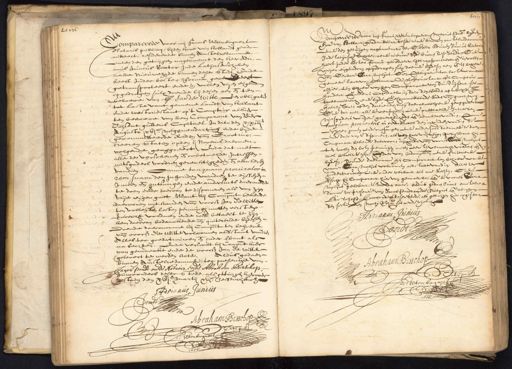 Compareerde voor mij Frans Wtenbogaert Notaris pub: bij den hove van Hollant geadmitteert residerende binnen amstelredamme ende den getuijgen nagenoemt, den E: Heer Adriaen Junius Rector Inde latijnsche Scholen, aende nieuwe sijde binnen dese Stadt, Ende heeft inder bester forma gecedeert getransporteert ende in vollen vrijen eijgendom opgedragen sulx doende bij desen aen ende ten behoeve vande Eerbare Sara molijns, Een Obligatie tot laste vant gemeene lant van Hollant ende westvrieslant opt Comptoir alhier, ten behoeve van hem Comparant van drie duijsent ses hondert Guldens capitael, in dato den elffden april xvi tweenveertich ende bijde Gecommitteerde Raden vande groot mog: Heeren Staten op den dartienden maij daeraenvolgende geaggreert Ende dat met alle de verschenen ende onbetaelde Intressen mitsgaders vordere gerechticheden ende aencleven vandien, Omme tanquam procuratie in rem suam den inhouden vandien te eijsschen innen ende ontfangen ende andersints daermede te doen ende daervan te disponeren, als van haer vrij eijgen goet, want hij Comparant bekende daervooren uijthanden vande voorss. Molijns ten vollen den lesten penningh metten eersten vernoecht voldaen ende haer wel betaelt te zijn, daer van bedanckende ende quiterende bij desen, doende daeromme hij comparant ten behoeve vande voorss. Sara Molijns volcomen affstaet vandien, alles ter goedertrouwen ende onder verbant als nae Rechten, Ende versocht hij Comparant hier van gemaeckt ende de voorss. Sara molijns gelevert te werden acte, aldus gedaen binnen amstelre¬ damme ter presentie van Jacob Pondt mede Notaris ende Abraham Bisschop, Inwoonders deser Stede, als getuijgen hier opgestaen den sestienden martij xvjc. ses ende vijftich Adrianus Junius JPondt