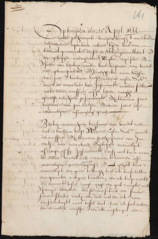 ƒ Op huijden den 15 April 1661 hebbe jck hendrick bruijnen burgh 't amsteldam resideerende, openbaer notaris: bijden hoore van hollandt genominatie derselver steede geadmitteert ende den getuggen naergenoemt, Mijter, requisitie ende versoeke van beatrix, vanden hove, huijsvrou van barent melij getraneporteert, ende verweg J ten woon huijsen van iff: I barbara brest weduwe wijlen Salr. daniel des morssires haer insinuantes moeders sieter welke voorn. massices in sijn leeren vooght i geweest over haer insinuante ende Cathrina Jans huijsvrouw van Jan Aertsen: ende aenden selve dese naervolgende afcragentge gedaen datrix vanden hoven huijsvrou van barent mel¬ doet in barbana brest Weduwe wijlen Salr. daniel des massires ende Catharina Jans huijsvrou van Jan aertse, door onsnotaris ende getuijgen miendelijck affsiggen, of sij Insumante eersij met haer man de voorn. barent wel is comen te trouwen dese ^ niet naervolgende goederen geerft ende niet gehadt heeft namenlijck een goude kettingh, twee dito braseletten van gronaten met goue sraelen, een dito haijrnaelt een diamante tafel ringh, nogh een gout ringetie met verscheijde steenties, een silvere schael een swaere silvere sleutel raekx vier dick met een dito riem een silver taght cant tafel bort, twee dito sout vaten een dito melck meijtsie, een dito mosterpot, een