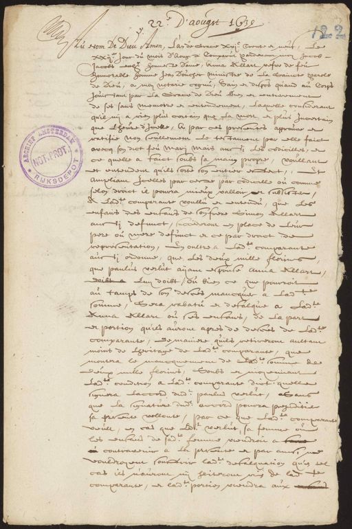 22: D' aougst 165. hussom De Duu Amen, Las de Craco xvic. Cronte e nout, Le xxije. Jour du mois d'kongst Comparut pardenam moij Jacob Jacobs eoth. honneste Dame, Anna Allart vefvo de feu Honnorable zomme Jean Doucher ministre de La Saincte parole de dieu, a moy notarie coguu, Sam en dispos quand au Corps Jouissant par La Grace de Dieu ien en ontrerement de ses sans memoire en ontendement, Laquelle considerant quil mij a rien plus cortain que la mort en plus Incortain que Lheure d'scelle, k par ces presentes aprouwe en ratisie noy seullemem te testament par elle faict avecq son dict feu Marij Mais austi Les codicilles, en ce quelle a faict soubs sa manen propre, voullant et ontendent quils sorte son eutier effect, Et ampliam Icelles par ceste par codicille ou comme selven dract il pourra mieux valloir et subsister ALadt. comparante voullu en entendu, que ses enfans des enfans de son frere Simon Allart austi defuict, succederont en place de leur pere ou mere defunct en ce par dract de representation, En oultrea sadt. comparante austi ordonne, que, ses deux mille florius que paulus verlut aijam esponse Anna Allart drkta Luy doibt (ou bien ce que pourroit au tauys de soy desces mancquer a lad somme, Seta rabatu en detalque a Ladt. Anna Allart ou ses enfans, de la part en portion quis anront apres de desees de Ladt. comparante, De maniere quils retiverou aultani mans de Llvitage de Lad. comparante, que montra le mancquement de Sade: somme de Deux mille florius, Soubs et moyenmant tad. condition a tad. comparante dict quelle signera saccord oud. paulus verlat, Sans que La signature dudr. accord pouora prejuditie sa presente vollonte, par ce que Lad. comparant peult, en cas que Let. verlut, sa femme om les ensaus de sad. femme viendrou a f contraveuir a la persente en par amstne vouldroyent souffoir ladt. desalquation quen tel te cas iss nanront nij serteront vn de lad comparante, en ladt. portion viendra amp