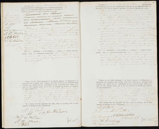 De doorhaling van vier en twintig woorden goedgekeurd P Hoed JCE Een Hoosen P: Eer Hoorer COM 1 C.J. Van Veerder 1 de tronwg Op heden den zeven en twintigsten Maart Achttienhonderd Twee-en-Zeventig, zijn voor ons ondergeteekende Ambtenaar van den Burgerlijken Stand van Amsterdam, in het huis der Gemeente, verschenen, ten einde een Huwelijk aan te gaan H vik ter He 1ng gcbore en woeerde b intig Jaren wed den id zeven Elees, id Aln Ioh ten Hoost denarigen zo Petrus Hoed sjouwerman geR boren en wonende alhier, oud vyfen vier Ten vietig jaren, meerderjarige nataarlyke zoon van Catharina Hoed werkster wonende C alhier ter Eene erder Aagje Al zonder beroep geboren te Laandsen arrondissement Haarlem wonende alhier, oud een en veertig jaren min derjarige dochter van Hendrik Al en Vienwertje Rol beide overleden ter andere zyde De aeide afkondiging en tot dit huwelijk zijn, blijkens zer daarvan hiernevens gevoegd bewij, onverhinderd geschied alhier den eventienden en vier en twintigsten dezer Voorts zin aan ons overgelygd de gevoorte acten den Verloofden: Waarna wij hun hebben afgevraagd of zij elkander aannemen tot Echtgenooten, en getrouwelijk alle de pligten zullen vervullen, welke door de Wet aan den Huwelijken Staat verbonden zijn: hetwelk door hen, uitdrukkelijk met JA, beantwoord zijnde, hebben wij in naam der Wet uitspraak gedaan, dat zij door het Huwelijk aan elkander zijn verbonden. In tegenwoordigheid van: Hendrik Valentin ten Hooven sjouwerman oud eenen vijftig Pieter ten Hooven metselaar oud acht en veertig Johannes Georgins Stakl werkmag oud zevenen zestig en Corveli. Johannes van weerder alsvoren oad vier en veertig jaren, wonende allen alhier En is hiervan door ons opgemaakt deze Akte, welke na voorlezing, door de Komparanten, de Getuigen en ons is onderteekend. P 1 tee Van Warden J C . AC v ten Hoosen de Koning ter Hoorlem 8 O Att Op heden den Zeven en twintigsten Maart Achttienhonderd Twee-en-Zeventig, zijn voor ons ondergeteekende Ambtenaar van den Burgerlijken Stand van Amsterdam, in het huis der Gemeente, verschenen, ten einde een Huwelijk aan te gaan Hendrik ter Horst bediende geboren en wonende alhier, oud zeven en twintig jaren, weduwevaar van Johan na Maria Klees, meerderjarige zoon van Tenuis ter Horst overleden en Jacoba Gezina Huisman zonder beroep wonende alhier ter C oanna Clasina van der Putten zonder beroep geboren en wonende alhier oud vier en twintig jaren, meerderjarig edochter van Matthys van der Putten overleden en Wilhelmina Margaretha euning zonder beroep wonende alhier ter ouder zyde. En verklaarden de beide moeders voor ons tegenwoordig toe te stemmeen in deze Echt De beide afkondigingen, tot dit huwelijk zin, blijkens zs daarvan hiernevens gevoegd bewij 3, onverhinderd geschied alhier den Leventienden en vier en twintigsten dezer Voorts zyn aan ons overgelegd ten eersten de gevoortoele der Verloofden ten tweeden de dood acten vao de beide vaders ten derden de dood acte van de vorige Echtgenoote des Broedegome Waarna wij hun hebben afgevraagd of zij elkander aannemen tot Echtgenooten, en getrouwelijk alle de pligten zullen vervullen, welke door de Wet aan den Huwelijken Staat verbonden zijn: hetwelk door hen, uitdrukkelijk met JA, beantwoord zijnde, hebben wij in naam der Wet uitspraak gedaan, dat zij door het Huwelijk aan elkander zijn verbonden. In tegenwoordigheid van: Barthaloureus Shaarwalir Koorndrage oud achten vijftig wilhel Rozeman winkelier opd twee en veertig jaren beide ooers der Echtgenoote Chris tiaan weygel Bienkelaar Jakhuis kneekt oud vier en zeventig en Iohannes Herbold alsvoren oud twee en zestig jaren een alhie Oost ra vd En is hiervan door ons opgemaakt deze Akte, welke na voorlezing, door de Komparanten, de Getuigen en ons is onderteekend. en geronderd de tweede getuigen die verklaarde niet te konnen schryven 7 H: ter Hout 1 utters J. C: ve. d.C JGhuisman E W Brukelaar J Herbold de Vrouing W M Leuning B Spaar water