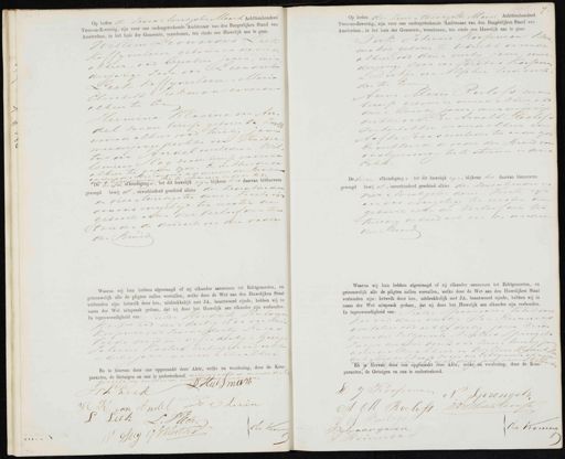 Op heden de Zeven en twintigsten Maart Achtttienhonderd Twee-en-Zeventig, zijn voor ons ondergeteekende Ambtenaar van den Burgerlijken Stand van Amsterdam, in het huis der Gemeente, verschenen, ten einde een Huwelijk aan te gaan1 Willem Leonardus Leek Kaffyverlezer geboren en wonen de alhier, oud negentien jaren, min derjarige zoon van Leendert Leek koffyverlezer en Maria Elisabeth Tickman wonende alhier ter Cent Hermina Klasina van An. del zouder beroep geboren te zaale 12 wonende alhier, oud twintig jaren minderjarige dochter van Huiber tus van Andel overleden e Wit. lemicna Sag zonder beroep wonende alhier ter audere zyde. tn verklaarden de — ouders des Bruidegans en de moeder dee Bruidvaar ns tegenwoordig toe te stemmen in dere leke De aerde afkondigingen tot dit huwelijk zin blijkens her daarvan hiernevens gevoegd bewij , onverhinderd geschied alhier den Zeventienden en vier en twintigsten dezer Voorts zyn aan ons overgelegd ten eersten de geboorte acten der verloofden ten tweeden de doodalle van den vader der Bruid Waarna wij hun hebben afgevraagd of zij elkander aannemen tot Echtgenooten, en getrouwelijk alle de pligten zullen vervullen, welke door de Wet aan den Huwelijken Staat verbonden zijn: hetwelk door hen, uitdrukkelijk met JA, beantwoord zijnde, hebben wij in naam der Wet uitspraak gedaan, dat zij door het Huwelijk aan elkander zijn verbonden. In tegenwoordigheid van: Pieter Hendrik Hulsman Kuiper oud een en dertig Las van Luin Koopman oud zevenen dertig Jucas Viede sinid oud vyfen dertig en Geargi Johannes Kosters herberger oud acht en dertig jaren, wonende allen alhier En is hiervan door ons opgemaakt deze Akte, welke na voorlezing, door de Komparanten, de Getuigen en ons is onderteekend. antgezonderd de moeder diren verklaarde met tersjaan schrijven. genoots. Sma 10 & NW f0 2 LLeek Oderen 21 van Andel CG Leek L. Ede. de Kronen G J Kosters 5 GJdo 17 Op heden den Zeven en twintigsten Maart Achttienhonderd Twee-en-Zeventig, zijn voor ons ondergeteekende Ambtenaar van den Burgerlijken Stand van Amsterdam, in het huis der Gemeente, verschenen, ten einde een Huwelijk aan te gaan Dirk Johannes Koopman Klei p maker geboren te Utrecht wonende alhier, oud drie en veertig jaren, meer derjarige zoon vry acobus Koopman en Dirkje van Alphen beide overle den ter Eenu Anna Maria Roelofs zouder beroep geboren en vovend alhier ou drie en twintig jaren, meerderjarige dochter van Jan Arnolt Roelofs teterbatver wonende alhier en Aaf te Joaas overleden ter ander zyde En verklaarde de vader, der Brui voor ons tegenwoordig toe te stummen in dezen Ectbt. De beide afkondiging e tot dit huwelijk zin, blijkens zis daarvan hiernevens gevoegd bewij 3, onverhinderd geschied alhier den zeventienden vier en twintigsten dezer Voorts zyn aan ons overgelegd ten eersten de gehoorte acten dee Verlootden ten tweeden de dood acte van de moeder der Broed Waarna wij hun hebben afgevraagd of zij elkander aannemen tot Echtgenooten, en getrouwelijk alle de pligten zullen vervullen, welke door de Wet aan den Huwelijken Staat verbonden zijn: hetwelk door hen, uitdrukkelijk met JA, beantwoord zijnde, hebben wij in naam der Wet uitspraak gedaan, dat zij door het Huwelijk aan elkander zijn verbonden In tegenwoordigheid van: Pieter Spaargaren lahekswer ker oud drieen veertig Jan Reinners winkelier oud achte dertig jaren beide voms der Echtgenoote Nicolaas Brengels Zwaser derzelve muid oud zeven en twintig jar wonende allen alhier en Willem Frderik Zo drik Middelkoop zwager des Echtgenoots op regsen Vicatien oud achten dertig jaren wonende te i vn f4r En is hiervan door ons opgemaakt deze Akte, welke na voorlezing, door de Kom-vi paranten, de Getuigen en ons is onderteekend. 2 Koopman 1 Sprengels. 2y Wd HHiddelkoose H M Roeloff Roelop de Koning P Spaarganen J Reinmer