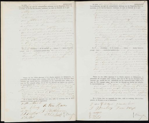Op heden den vijftienden Mei Achttienhonderd Twee-en-Zeventig, zijn voor ons ondergeteekende Ambtenaar van den Burgerlijken Stand van Amsterdam, in het huis der Gemeente, verschenen, ten einde een Huwelijk aan te gaan Mijne Stoel schuilevoerder geboren en wonende alhier, oud zeven en twintig jaren, meerderjarige zoon van Albert Soel schipper en Surriana Johanna Koster vonen de alhier ter Een lij meij zou. Machteldje der beroep geboren te Loordrecht arrondissement utrecht wonende alhier oud dertig jaren, meerderjarige doch ter van Poost Klymeij overleden amme zonder beroep wo- en Octje nende te Loeven ter andere zyde ten verklaren den de ouders des Bruidejoms voor ons tegenwoord De aeide afkondiging en tot dit huwelijkn, blijkens hes daarvan hiernevens te stermen gevoegd bewij , onverhinderd geschied alhier den achten twin tigsten April laatstleden en vyfden dezer Voorts zyn oor ons overgelyd de geboorte acten dee Verloofden: Waarna wij hun hebben afgevraagd of zij elkander aannemen tot Echtgenooten, en getrouwelijk alle de pligten zullen vervullen, welke door de Wet aan den Huwelijken Staat verbonden zijn: hetwelk door hen, uitdrukkelijk met JA, beantwoord zijnde, hebben wij in naam der Wet uitspraak gedaan, dat zij door het Huwelijk aan elkander zijn verbonden. In tegenwoordigheid van: Cierlaas Hijno Stoel broedw des Echtgenoots Koetsier oud een en dertig jaren wonende alhier, Klaas ten Hare koeper oud vieren twintig jaren wonende alsvoren Jacob Wittereen molenaa oud zeven twintig jaren wonende te Wuesj beide neven van denzelven en Willem Helmen zonder beroep oud zesen zestig Jaren wonende als En is hiervan door' ons opgemaakt deze Akte, welke na voorlezing, door de Kom- paranten, de Getuigen en ons is onderteekend. M Stoel K ten Have kleimij M A Hoel Bitteveed J Koster Driessen H Helntraat N M Stoes Op heden den vijftienden Mei Achttienhonderd Twee-en-Zeventig, zijn voor ons ondergeteekende Ambtenaar van den Burgerlijken Stand van Amsterdam, in het huis der Gemeente, verschenen, ten einde een Huwelijk aan te gaan Johannes van Dieken steenhouwer geboren en laatst gewoond hebbende te Grovingen, wonende thans alhier oud achten twintig jaren meerderjarige zoon van Peterus Haringkarssel van Dieke overleden in Grietje Mleyer zonder beroep wonende te Groningen te Eene Johanna Frederika Weinberg zonder beroep geboren te Gildehaar Haunover) wonende alhier, oud twee en twintig jaren, minderjarige dochter 8 van Hrederich Eveinberg en Arnol dinn Herwelink beide overleden ter andere zyde. En verklaarde de moeden des Broedegons voor ons tegenwoordig toe te stemmer in deze Eckt De Lude afkondiging, tot dit huwelijk zn, blijkens de daarvan hiernevens gevoegd e bewijzen, onverhinderd geschied alhier en te Groning en de een en twintigstenn acht en twintigsten April laatstleden. Voorts zyn von on overgelegd ten eersten de gehoorte acten de Verloofden ten tweeden de doodaelen va den vader des Bruidegams en d orders der Bruid ten derden geregtelyke verkle ring dat zij volgens de in het voorwalig Kouwsgryk Hannover thans nog geleege wellen meerderjarig is en geene toestemmin tot haar huwelyk vereischt wordt Waarna wij hun hebben afgevraagd of zij elkander aannemen tot Echtgenooten, en getrouwelijk alle de pligten zullen vervullen, welke door de Wet aan den Huwelijken Staat verbonden zijn: hetwelk door hen, uitdrukkelijk met JA, beantwoord zijnde, hebben wij in naam der Wet uitspraak gedaan, dat zij door het Huwelijk aan elkander zijn verbonden. In tegenwoordigheid van: Casper Jak Hienhouwer oud negen en twintig Coenraad Vastruk alsouren oud vieren twintig Johannes ve den Eude alsvoren oud vyfentwintig in