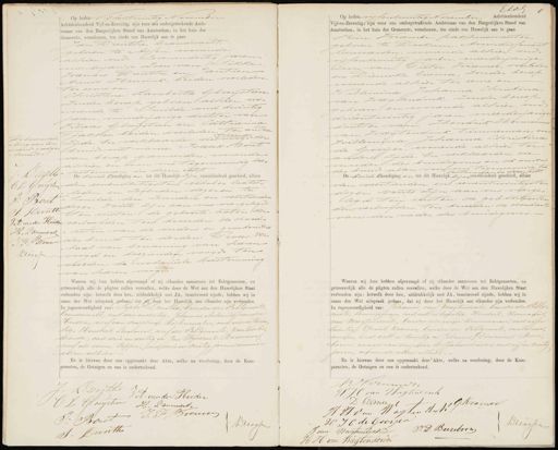 De bovenstel„ „ling van één woord goedge¬ „keurd.- Duntt E L Gloeysteen J: Bout Hout J. Jsenth JA van der Heiden H. Lummers. J. v Brouwe 70 Driessen Dy heden Vijfentwintig November Achttienhonderd Vijf-en-Zeventig, zijn voor ons ondergeteekende Amb- tenaar van den Burgerlijken Stand van Amsterdam, in het huis der Gemeente, verschenen, ten einde een Huwelijk aan te gaan Jan Dreuthe, brandwacht. geboren te Assen, wonende alhier, ouds Zevenendertig jaren. meerderjarige zoon van Tikke Warners Drenthe en Jantien trends Heurink, beiden overleden, Ter eenre en Christine Lamberta Gloeijsteen. zonder beroep, geboren alhier, wo¬ „nende te Smilde, oud twintig jaren, minderjarige dochter van Klaas Gloeijsteen en Catharina N Tjakkes, beiden overleden, ter andere toeziende n Zijde. En verklaarde. de voogd der 9e bruids met name Isaat Bout van beroep gameerder, wonende alhier en voor ons tegenwoordig toe¬ H. „ testemmen in dezen echt De beide afkondiging en tot dit Huwelijk zijn onverhinderd geschied, alhier tig den eenendertigsten October laatst„ leden en zevenden dezer en te- ¶ Smilde den zevenden en veertienden „ dezer voorts zijn aan ons overgelegd en eersten: de geboorte- acten der ade verloofden ten tweeden: de dood„ is. „ acten van de ouders en grootouders wder bruid ten derden: Proces- Ver¬ „baal van benoeming van haren voogd en toezienden voogds ten vierden de notarieele toestemming van haren voogd. Waarna wij hun hebben afgevraagd of zij elkander aannemen tot Echtgenooten, en getrouwelijk alle de pligten zullen vervullen, welke door de Wet aan den Huwelijken Staat verbonden zijn: hetwelk door hen, uitdrukkelijk met JA, beantwoord zijnde, hebben wij in naam der Wet uitspraak gedaan, dat zij door het Huwelijk aan elkander zijn verbonden. In tegenwoordigheid van Sipke Drinthe, broeder des Echtgenoots, brandwacht, oud drie en dertig, Johannes, Antonius vander Heiden, neef van denzelven, kistenmaker, oud vier en twin„ tig, Hendrik Lammers, neef der Echtgenoote, Kantoorbe„ diende, oud drie en dertig en Jan Frederik Brouwer, neef als voren, tapper, oud drie en veertig jaren, wonende allen alhier. En is hiervan door ons opgemaakt deze Akte, welke na voorlezing, door de Kom- paranten, de Getuigen en ons is onderteekend. „.... . . . . . . . . . . . . . . . . . . . . . . . . . . . . . . . . . . . . . . . . . . . . . . . . . . . . . Dientt t Op heden vijfentwintig November Achttienhonderd Vijf-en-Zeventig,zijn voor ons ondergeteekende Ambtenaar van den Burgerlijken Stand van Amsterdam, in het huis der Gemeente, verschenen, ten einde een Huwelijk aan te gaan Rein Kramer, pakhuismeester geboren te Dockum, Arrondissemen Leeuwarden, wonende alhier, oud. vijfentwintig jaren, meerderjarige zoon van Pieter Kramer, overlede en Dienwke Eisma, zonder beroep. wonende alhier ter eenre en Willemina Johanna Christina van Zagtendonk, zonder beroep. geboren en wonende alsvier, oud drieentwintig jaren, meerderjarige dochter van Hendrik Hermanus van Zagtendonk, Timmerman en Willemina Johanna Christina de Gooijer, wonende alhier ser- andere zijde. En verklaarden de moeder des bruidegoms en de ouvers der bruid allen voor ons tegenwoordig, toe Testommen in dezen echt. De beide afkondiging en tot dit Huwelijk zijn onverhinderd geschied, alhier den veertienden en eenentwintigsten dezer voorts zijn aan ons overge¬ 5 legd ten eersten: de geboorteassen der verloofden ten tweeden: de doodaste van den vader des bruidegoms. Waarna wij hun hebben afgevraagd of zij elkander aannemen tot Echtgenooten, en getrouwelijk alle de pligten zullen vervullen, welke door de Wet aan den Huwelijken Staat verbonden zijn: hetwelk door hen, uitdrukkelijk met JA, beantwoord zijnde, hebben wij in naam der Wet uitspraak gedaan, dat zij door het Huwelijk aan elkander zijn verbonden. In tegenwoordigheid van: Johannes, van Eagtendonk, broeder der Echtge„ noote, timmerman, oud acht en twintig, Hendrik, Hermanus van Wagtendonk, broeder als voren timmerman, oud vijfen twintig, Gerrit Kramer, broeder des Echtgenoots, zaakwaar„ nemer, oud acht en twintig en Johannes, Diedericus Beere, boom, zwager van denzelven, koffiehuishouder, oud vijf en veertig jaren, wonende allen alhier. En is hiervan door ons opgemaakt deze" Akte, welke na voorlezing, door de Kom- paranten, de Getuigen en ons is onderteekend. 1........ .. . . . . . . Vorumer C van Wugtendonk WJ D Esma H H dan Waster du Gkramer W J C de Gooyjer Driessen J.D. Beereboom van Wagtendonk
