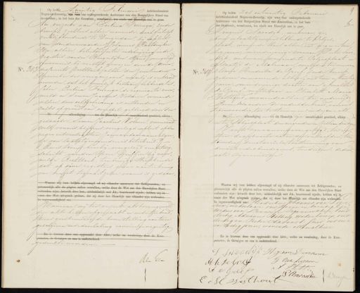 Op heden twintig Februari Achttienhonderd Negen-en-Zeventig, zijn vaor ons ondergeteekende Ambtenaar van den Burgerlijken Stand van Amsterdam, in het huis der Gemeente, vergeheven, ten einde een Huwelijk aan te gaan ten verzoeke van Evelina Fenenga, zonder beroep, rechtens alhier wonende, doch feitelijk verblijfhoudende te Durgerdam, bij exploiti van den deurwaarder Johannes Hartsuijker Hrw: alhier, beteekendfenter inschrijving in de registers van den Burgerlijken stand overgelegd eenvonnis bij verstek gewegen door de arronIdissements rechtbank alhier den zeventienden December des vorigenjaars, waarbij is verklaard geworden, dat het huwelijk bestaan hebbende tus schen Evelina Fenenga de requirante voor meld en Simon Jacobus Volmer, wonende alhier, door echtscheiding is onthonden en zulks op grond van overspel, gepleegd door den 0 aekondiging tot dit Nundhijk ouverhinderd geschied alhier gedaagde: Simon Jacobus Volmer, voornoemd. welk vonnis blijkens overgelegd exploit op den negen entwintigsten Januaridaaraanvolgen de aan laatstgenoemden is beteekend.A En is teven hierbij overgelegd een getuig schrift van den Heer Griffier by voor melde Rechtbank, ten bewijze strekkende dat op zijne registers geene aanteekening van verzet tegen hetzelve vonnis is gedaan. Waarna wij hun hebben algevraagd of zij ekander aannemen tot achtgenooten, en getreuwelijk alle de pligten zullen vervullen, welke door de Wet aan den Huwelijken Staat verbonden zijn: hetwelk door hen, uitdrukkelijk met JA, beantwoord zijnde, hebben wij in naam der Wet uitspraak gedaan, dat zij door het Huwelijk aan elkander zijn verbonden Hn tegenwoordigheid van Waarvan wij ten verzoeke als bovengemeld deze akte hebben opgemaakt en onderteekend, Devens goedkeurende de bovenstelling van twee geschieven ende doorhaling van vierennegentig En is hiere deze vate welk „door de Komparanten, ie Getuigen en ons is onderteekend. gedrukte woorden Aan den No. 304 Op heden Zes entwintig Februari Achttienhonderd Negen-en-Zeventig, zijn voor ons ondergeteekende Ambtenaar van den Burgerlijken Stand van Amsterdam, in het huis Jder Gemeente, verschenen, ten einde een Hluwelijk aan te gaan Dingenis Snoodik, werkman, geboven en laatstgewoond hebbende te Colijns plaat, wonende thans alhier, oud negen en twin tig jaren, meerderjarige zoon van Pieter Snoo dijk, werkman, wonende te Colijnsplaat en Aaatje de Molenaar, overleden, ter eenroen 04 Aaria Hendrika de Greef, zonder beroep, geboren en wonende alhier, oud twee en twintig jaren, minderjarige dochter van Arnoldus de Greef, metselaar en Elisabeth Maria Westhoud, wonende alhier, ter andere zyde En verklaarden de oudersderbruid voor ons tegenwoordig, toe te stemmen in dezen echt Debeide afkondiging en tot dit Huwelijk zijn onverhinderd geschied, alhier en te Colijnsplaat den negenden en Zestienden dezer Voorts zijn aanons overgelegd, ten eer sten: de geboorte acten der verloofden, ten tweeden de notariëele toestemming van denvaderdesbundegoms, tenderden: de door acte zijnermoeder. Waarna wij hun hebben afgevraagd of zij elkander aannemen tot Echtgenooten, en (getrouwelijk alle de pligten zullen vervullen, welke door de Wet aan den Huwelijken Staat verbonden zijn: hetwelk door hen, uitdrukkelijk met JA, beantwoord zijnde, hebben wij in naam der Wet uitspraak gedaan, dat zij door het Huwelijk aan elkander zijn verbonden. In tegenwoordigheid van Hendrikus Johannes van Leer suw, metselaar oud Zeven en twintig, Gerardus van LeersumSigarenmaker oud dertig, Adrianus Retting, zonder beroep, oud dertig en Pieter Chadanot Cmid oud vier en zestig jaren, wonende allen alhier. En is hiervan door ons opgemaakt deze Akte, welke na voorlezing, door de Komparanten, de Getuigen en ons is onderteekend. J Mnvadijk Haaan Leersum G van Leeruum A L Delve D SGrest A Plett J Eervande H Ves Chout