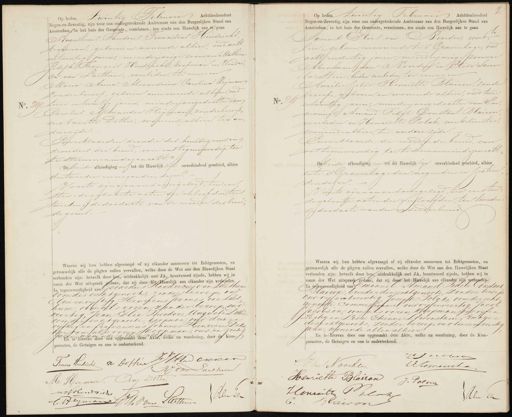No. 290 Februari Achttienhonderd Op heden Twintig Negen-en-Zeventig, zijn voor ons ondergeteekende Ambtenaar van den Burgerlijken Stand van Amsterdam in het huis der Gemeente, verschenen, ten einde een Huwelijk aan te gaan Augustinus Theodorus Franciscus Hendrichs, koopman, geboren en wonende alhier, oud acht entwintig jaren, meerderjarige zoon van Mathieu Joseph François Hendrichs, koopman en Hendri„ ca van Laethum, overleden, ter eenreen Maria Anna Alexandrina Carolina Heijman zonder beroep; geboren en wonende alhier, oud twee entwintig jaren, minderjarige dochter van Carolus Alexander Heijman, zonder beroep, en Nanette Dothee, wonende alhier, ter an„ dere zijde. Enverklaarden devader des bruidegomsen deouders der bruid, voor ons tegenwoordig, toe te stemmen in dezen echt. d. Oe beide afkondiging en tot dit Huwelijk zijn onverhindend geschied, alhier. den tweeden ennegenden dezer. Voorts zijn aan onsovergelegd, ten eer„ sten: de geboorte acten der verloofden, ten tweeden, de doodacte van de moeder des brun„ de goms. Waarna wij hun hebben afgevraagd of zij elkander aannemen tot Echtgenooten, en getrouwelijk alle de pligten zullen vervullen, welke door de Wet aan den Huwelijken Staat. verbonden zijn: hetwelk door het, uitdrukkelijk met JA, beantwoord zijnde, hebben wij in naam der Wet uitspraak gedaan, dat zij door het Huwelijk aan elkander zijn verbonden. In tegenwoordigheid aan t Geraraus Renaricus van Laetham Oom des echtgenoot, zonder beroep, oud drie envyftig Henricus Jounnes van Laet hum oven als voren, zonder beroep, oud veertig, Jean Elie Theodore Auguste Dothée oom der echtgenoote, koopman oud drie en vyftig en tranciscus Joannes Henricus Dek, ker om als vorenkoopman, oud en zestig jaren, wonend An is hiervan door ons ongemaakt deze Ka, Gelke na voorleting, door de Kon- paranten, de Getuigen en ons is onderteekend. V ... . . . . . . „ . . . . . . . . . . . . n Dotpie MHn exser Frans Hendricht HJ van Prethum An Dothei A. Heyman. welkonderct Alli Weyman tettiien No 25 Op heden twintig Februari Achttienhonderd Negen-en-Zeventig, zijn voor ons ondergeteekende Ambtenaar van den Burgerlijken Stand van Amsterdam, in het huis der Gemeente, verschenen, ten einde een luwelijk aan te gaan 2 Samuel Elias van Noorden, winke lier, geboren en wonende te 's Gravenhage, oud acht endertig jaren, meerderjarige zoonvan Abraham van Noorden en Elise Samue Ela stein, beiden overleden, ter eenre en Aurélie Jelie Henriëtte Blairon, zonder beroep, geboren en wonende alhier, oud twee 91 entwintig jaren, minderjarige dochter van Em„ manuel Amand Fidel Constant Blairon overleden en Henrictte Polak, winkelierster, wonende alhier, ter andere zyde. En verklaarde de moederderbruid, voor ons tegenwoordig, toe te stemmen indezen echt. debeide afkondiging en tot dit Huwdlijk zijn onverhinderd geschied, alhier. ente 's Gravenhage den negenden en sestien dendeGer: Voorts zijn aan ons overgelegd ten eersten de geboorte acten der verloofden, ten tweeden de doodacte van den vaderderbruid. Waarna wij hun hebben afgevraagd of zij elkander aannemen tot Echtgenooten, en getrouwelijk alle de pligten zullen vervullen, welke door de Wet aan den Iuwelijken Staat verbonden zijn: hetwelk door hen, uitdrukkelijk met JA, beantwoord zijnde, hebben wij in naam der Wet uitspraak gedaan, dat zij door het Huwelijk aan elkander zijn verbouden. En bgenwoordigheid van tmanuel Amand Tidele Constant Slairon, broeder der echtgenoote zonder beroep oud vijf entwintig Joseph Polak, oom der echt genoote, commisssiohair oud vyfenveertig, Jacob Jacobzon, oom als voren koopman oodvijfen zestig en Lien Etienne Lomenstam, zwager desechtgenoots, zonder beroep, oud twee en veertig jaren, wonende allen alhier. En is hiervan door ons opgemaakt deze Akte, welke na voorlezing, door de Kom- paranten, de Getuigen en ons is onderteekend.