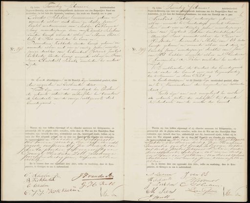 No. 298 Op heden Twintig februari Achttienhonderd Negen-en-Zeventig, zijn voor ons ondergeteekende Ambtenaar van den Burgerlijken Stand van Amsterdam, in het huis der Gemeente verschenen, ten einde een Huwelijk aan te gaan Cornelis Schalm timmerman geboren en wonende alhier oud zeven en dertig jaren laatst weduwenaar van Aaltje Cathanna Senij meerderjarige zoon van Cornelis Schalm zouden beroep wonende alhier en Maria Elisa= beth te Bos overleden ter Eenre en Berendina Kokkede zonder beroep geboren en wonende alhier oud vier en veertig jaren meerder. jarige dochter van Kolumbus Josevus Jacobus kokkede zonder beroep wonende alhier en Fran Siena Eliesabeth Schutz overleden ter andere Zijde De beide afkondigingen tot dit Huwelijk zin ouverninderd geschied, alhier den negenden en Zestienden dezer Voorts zin aan ons overgelegd ten Eersten de geboorte - acten der verloofden ten tweeden de doodacte van de vorige / echtgenoote des bruidegoms. Waarna wij hun hebben afgevraagd of zij elkander aannemen tot Echtgenooten, en getrouwelijk alle de pligten zullen vervullen, welke door de Wet aan den Huwelijken Staat verbonden zijn: hetwelk door hen, uitdrukkelijk met JA, beantwoord zijnde, hebben wij in naam der Wet uitspraak gedaan, dat zij door het ILuwelijk adn elkander zijn verbonden. In tegenwoordigheid van: den vader des Echtgenoots oud twee en zeventig, den vader der echtgenoote oud zeventig, Jan Frederik van der Aa, poortier, oud een envijftig en Gosewin Hendrik Zoll zandvormer Couovyf en dertig jaren, worende allen alhier En is hiervan door ons opgemaakt deze Akte, welke na voorlezing, door de Kom(paranten, de Getuigen en ons is onderteekend „.. JF van der Ae C Schalm Kr 6 Kokkedel H Zoll C: Schalm J:de Vak Beluer GO P Alm M No. 290 Op heden Twintig februari Achttienhonderd Negen-en-Zeventig, zijn voor ons ontergeteekende Ambtenaar van den Burgerlijken Stand van Amsterdam, in het huis der Gemeente verschenen, ten einde een luwelijk aan te gaan t Nicolaas Zubsen onderwyzer geboren alhier wonende te Sunderdorp gemeente Nieuwen dam oud vier en twintig jaren meerderjarige zoon van Jacobus Subsen kantoorbediende en Marritje Tiers wonende alhier ter Eenre en Hendrika Amerentia Aletta van Os zonder beroep geboren en wonende alhier oud drie en twintig jaren meerderjarige dochter van Jan van Os bakker wonende alhier en Hendrica Amerentia de Pater overleden ter andere Zijde En verklaarden de Ouders des bruidegomb en de vader der bruid voor ons tegenwoordig toe te stemmen in dezen Echt De beide afkondigingen tot dit Huwelijk Zin onverhinderd geschied, alhier Nieuwendam den negenden en zestienden en te dezer Voorts zijn aan ons overgelegd ten eersten de geboorte - acten der verloofden ten tweeden de dood acte van de moeder der bruid Waarna wij hun hebben afgevraagd of zij elkander aannemen tot Echtgenooten, en getrouwelijk alle de pligten zullen vervullen, welke door de Wet aan den IIuwelijken Staat verbonden zijn: hetwelk door hen, uitdrukkelijk met JA, beantwoord zijnde, hebben wij in naam der Wet uitspraak gedaan, dat zij door het Huwelijk aan elkander zijn verbonden. in tegenwoordigheid van Jan van s broeder der echtgenoote akker oud drie en dertig, Jan Henricus merentia van Os broeder als voren bakker oud dertig, Jacobus Johannes Pubsen broeder des echtgenoots, makelaar, oud een en dertig en Huis van Gelderen, oom des echtgenoots Ambtenaar, oud veertig jaren, wonende Callen alhier En is hiervan door ons opgemaakt deze Akte, welke na voorlezing, door de Komparanten, de Getuigen en ons is onderteekend. .. N. Lubsen van Os
