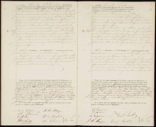 No. 309 Op heden twintig Februari Achtienhonderd Negen-en-Zeventig, zijn voor ons ondergeteekende Ambtenaar van den Burgerlijken Stand van Jdmsteram, in het huis der Gemeente, verschenen, ten einde een Hawelijk aan te gaan Willebrordus Nicolaas (Knaven, Conducteur geboren en wonende alhier, oud vier en twintig jaren, meerderjarige zoon van Petrus Johannis Knaven, overleden en Catharina Maria Ran, zonderberoep, wonende alhier, ter eenre en Susanna Cornelia Bleuze, zonder beroep, geboren en wonende alhier, oud zes en twintig jaren, meerderjarige dochter van Pieter Jacob. Bleuze en Susanna Cornelia Bafersel, man, beiden overleden, ter andere zyde En verklaarde de moeder desbruifegoms, voor ons tegenwoordig, toe te stemmenin dezen echt. De beide afkondiging en tot dit Huwelijk zijn onverhinderd geschied, alhier. den negenden en Zestienden dezer Voorts zijn aanons overgelegd, ten eersten degeboorte acten der verloofden, ten tweeden de doodacten van den vader des bruidegoms en vande ouders der bruid Waarna wij hun hebben afgevraagd of zij elkander aannemen tot Echtgenooten, en getrouwelijk alle de pligten zullen vervullen, welke door de Wet aan den Huwelijken Staat verbonden zijn: hetwelk door hen, uitdrukkelijk met JA, beantwoord zijnde, hebben wij in naam der Wet uitspraak gedaan, dat zij door het Huwelijk aan elkander zijn verbonden. De Negenwoordigheid van Hermanus Johannes Leonardus Beetink oom des echtgenoots, winkelier, oud drie enveertig Hendrik Hillebrand Alting zwager der echtgenoote, wedenmaker oud ne gen en dertig Willem Carel Grossouw, winkelier oud drie en dertig en Mattheus Rine, beken ger, oud negen en veertig jaren wonende allen alhier En is hiervan door ons opgemaakt deze Akte, welke na voorlezing, door de Komparanten, de Getuigen en ons is onderteekend. W A Joroeen H H Alting J.C Bleuze Odden twintig Februari Achttienhonderd Negen-en-Zeventig, zijn voor ons ondergeteekende Ambtenaar van den Burgerlijken Stand van Amsterdam, in het huis der Gemeente, verschenen, ten einde een Huwelijk aan te gaan Hermanus Kramer, gasfitter, geboven en wonende alhier, oud vijf en twin tig jaren, meerderjarige natuwelijke erkende zoon van Geertruij Maria Kramer, overleden ter eenree Jannetje Pansen, dienstbode, geboren te Ermels, wonende te Nunspect, gemeente Ermels, oud drie entwintig jaren, meerderjarige dochter van Albert Jansen, overleden en Johanna Riethorst, zonder beroep wonende te Nanspect, ter andere zijde De beide alkondiging en tot dit Huwelijk zijn onverhinderd geschied, alhier den tweeden en negenden en te Ermelo den negenden en zestienden dezer Voorts zijn aan ons overgelegd, ten eersten de geboorte acten der verloofden, ten tweeden: dedoodacten vande moeder des bruidegoms Een van den vader der bruid, ten derden: de notariëele toestemming van hare moeder. Waarna wij hun hebben afgevraagd of zij elkander aannemen tot Echtgenooten, en getrouwelijk alle de pligten zullen vervullen, welke door de Wet aan den Huwelijken Staat verbonden zijn: hetwelk door hen, uitdrukkelijk met JA, beantwoord zijnde, hebben wij in naam der Wet uitspraak gedaan dat zij door het Huwelijk aan elkander zijn verbonden. In tegenwoordigheid van: Hdam Kramer, broeder des echtge noots, tapper, oud dertig, Jan Willem Haagen zwager der echtgenoote kuiper, oud vijf en twintig Jochem Riethorst, oom den echtgenoote, tap per oudvyfenveertig en Dirk Nicolaas Bak ker werkman, oud dertig jaren, wonende allen alhier En is hiervan door ons opgemaakt deze Akte, welke na voorlezing, door de Komparanten, de Getuigen en ons is onderteekend.