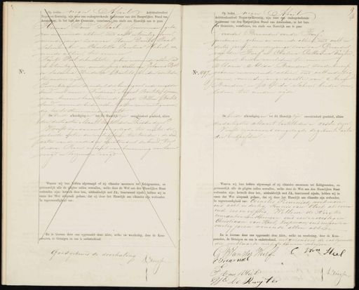 heden negen April Achttienhonderd Negen-en-Zeventig, zijn voor ons ondergeteekende Ambtenaar van den Burgerlijken Stand van Amsterdam, in het huis der Gemeente, verschenen ten einde een Huwelijk aan te gaan man David Sttaal, Sjouwerman/ gebo ren en wonende alhier, oud acht entwintig jaren, meerderjarige zoon van Harm Davids Staal Schoenmaker en Charlotta Carolina Hebert, wo nende alhier, ter eenre en Trijntje Post, dekenstikster, geboren en wonende alhier, oud een entwintig jaren, minderjarige dochter van Johannes Post en Susanma Hendrika Bartels, beiden overleden, ter andere zijde Enverklaarden de ouders des bruidegoms ende voogd der bruid, met name: Ferdinand Argust Bartels, sjouwver man, benevens haar toeziende voogd, Willem Bartels Smid, wonende beiden alhier allen voor ons tegenwoordig, toe te stemmenindesen echt De beide afkondigingen tot die Harllijk zijn onverhinderd geschied, alhier den dertigsten Maart laatstleden en Zesden dezer Voorts zijn aan ons overgelegd, ten eersten de geboorte acten der verloofden, ten tweeden: de doodacten van de ouders en grootouders derbruid, ten derden: Proces- verbaal van benoeming van haren voogd en toeziengen voogd Waarna wij hun hebben afgevraagd of zij elkander aannemen tot Echtgenooten, en getrouwelijk alle de pligten zullen vervullen, welke door de Wet aan den Vluwelijken Staat verbonden zijn: hetwelk door hen, uitdrukkelijk met JA, beantwoord zijnde, hebben wij in naam der Wet uifspraak gedaan, dat zij door het Huwelijk aan elkander zijn verbonden. In tegenwoordigheid van: En is hiervan door ons opgemaakt deze Akte, welke na voorlezing, door de Komparanten, de Getuigen en ons is onderteekend. Goedgekeurd de doorhaling Driessen No. 497 Op heden negen Ahri Achttienhonderd Negen-on-Zeventig, zijn voor ops ondergeteekende Ambtenaar van den Burgerlijken Stand van Amsterdam, in het huis der Gemeente, verschenen, ten einde een sluwelijk aan te gaan Gerardus Bernardus van der Wurf, werkman, geboren en wonende alhier, oud acht en dertig jaren, meerderjarige zoon van Gerardus van der Wurf en Clasina Catharina Kuijten Vrouwer, beiden overleden, ter eenree Maria Alida Brandon, zonder beroep, geboren en wonende alhier, oud acht endertig jaren, meerderjarige dochter van Aron Brandon en Alida Scheer, beiden over leden, ter andere zijde De beide afkondigingen tot dit Huwelijk zijn onverhinderd geschied, alhier. dendertigsten Maart laatstleden en zesden dezer Voorts zijn aan ons overgelegd, de geboorte acten der verloofden.Waarna wij hun hebben afgevraagd of zij elkander aannemen tot Echtgenooten, en getrouwelijk alle de pligten zullen vervullen, welke door de Wet aan den Huwelijken Staat verbonden zijn: hetwelk door hen, uitdrukkelijk met JA, beantwoord zijnde, hebben wij in naam der Wet uitspraak gedaan, dat zij door het Huwelijk aan elkander zijn verbonden. In tegenwoordigheid van: Cornelis Sieurniet, werkman oud acht en dertig, Teunis van Vliet als voren oud zes en vijftig, Willem de Ruijter courantenrondbrenger oud een enveertig en Christiaan van Heel, Koopman, oud negen en veertig jaren wonende allen alhier En is hiervan door ons opgemaakt deze Akte, welke na voorlezing, door de Komparanten, de Getuigen en ons is onderteekend. uitgezonderd de echtgenoote die verklaarde niet te kunnen schrijven. van Heel G B Van der Wurf E Preurniel F Van Vliet Lreessen V De Ruyter