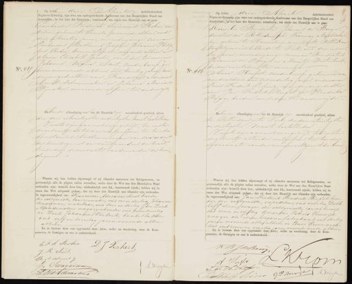 No. 487 Op heden drie April Achtienhonderd Negen-en-Zeventig, zijn voor ons ondergeteekende Ambtenaar van den Burgerlijken Stand van Amsterdam, in het huis der Gemeente, verschenen, ten einde een Huwelijk aan ter gaan Overhardus Friederich Sigismund Kobin, win„ kelier, geboren te Ermelo, wonende alhier, oud drie en twintig jaren, meerderjarige zoonvan Everhardus Bastianus Josephus Johannes Philij pus Robin, kommissionair, wonende alhier en Maria Elisabeth Jacobi, overleden, ter eenreen Johanna Maria Smit, zonder beroep, ge¬ boren en wonende alhier, oud twintig jaren, min„ derjarige dochter van Francisseus Adrianus net schoenmaker en Johanna Maria Pijnaker wonende alhier, ter andere zyden bebeide afkondiging en tot dit Huwdlijk zijn onverhinderd geschied, alhier. den drie en twintigsten en dertigsten Maart laatstleden, Voorts zijn aan ons overgelegd, ten eersten: degeboorte acten der verloofden, ten tweeden: de notariëele toestemmingen van den vader des bruidegoms en vande ouders der bruid tenderden: de doodacte van de moeder desbrui„ degoms. Waarna wij hun hebben afgevraagd of zij elkander aannemen tot Echtgenooten, en getrouwelijk alle de pligten zullen vervullen, welke door de Wet aan den Iuwelijken Staat verbonden zijn: hetwelk door hen, uitdrukkelijk met JA, beantwoord zijnde, hebben wij in naam der Wet uitspraak gedaan, dat zij door het Huwelijk aan elkander zijn verbonden. In tegenwoordigheid van: Franciscus Adrianus Smit broeder der echtgenoote, laarzenmaker, oud zes en dertig, Johannes Sagerman, makelaar, oud twee en dertig Jan Dirk Mandemakers magazynhouder oud zes entwintig en Dirk Johannes Verkerk, banketbakker oud vyf en twintig jaren wonende allen alhier. En is hiervan door ons opgemaakt deze Akte, welke na voorlezing, door de Kom- paranten, de Getuigen en ons is onderteekend E.F: S. Kobin D J Verkerk J. M. Smit G: A: Smit Jr J. Swagerma Driessen Haardemeveg No. 488 Op heden drie April Achttienhonderd Negen-en-Zeventig, zijn voor ons ondergeteekende Ambtenaar van den Burgerlijken Stand van Amsterdam, (in het huis der Gemeente, verschenen, ten einde een Huwelijk aan te gaan Kornelis Benedictus Pohannes de Bruyn. directeur der Rotterdamssche Tramway Maatschap pij, geboren te Harmelen, wonende te Rotterdam Elaatstgewoond hebbende te Tiel, oud drie en veer tig jaren, meerderjarige zoonvan Benedictus Johannes de Bruijn en Marijtje Westerbeek, beiden overleden, ter eenrein Anna Herfst, zonder beroep, geboren en wo nende alhier, oud zes endertig jaren, weduwe van Louis Fredrik Leeking, meerderjarige dochter van Jan Fredrik Herfst en Hendrika Haag, beiden overleden, ter andere zijde.- Bebeide afkondiging en tot dit Huwelijk zijn onverhinderd geschied, alhier te Rotterdam en te Tiel, den drie en twintigsten en dertigsten Maart laatstleden Voorts zijn aan ons overgelegd, ten eersten de geboorte actender verloofden, ten tweeden. de doodacte van den vorigen echtgenoot der bruit Waarna wij hun hebben afgevraagd of zij elkander aannemen tot Echtgenooten, en getrouwelijk alle de pligten zullen vervullen, welke door de Wet aan den Huwelijken Staat verbonden zijn: hetwelk door hen, uitdrukkelijk met JA, beantwoord zijnde, hebben wij in naam der Wet uitspraak gedaan, dat zij door het Huwelijk aan elkander zijn verbonden. In tegenwoordigheid van: Jan Frederik Hendrik Herfst broe der der echtgenoote, expediteur, oud veertig Deth loff Sum, zwager der echtgenoote, zonder beroep oud zeven en vijftig Gerardus Petrus Voorwijk zwager als voren sigarenfabrikant oud dertig jaren wonende allen alhier en Louis Krom archi fect oud zeven en veertig jaren wonende mede alhier En is hiervan door ons opgemaakt deze Akte, welke na voorlezing, door de Kom- paranten, de Getuigen en ons is onderteekend. K B Jde Buug Kom J Werf4. J. F.H. Berfst eror G:P: Voorwyk Driessen