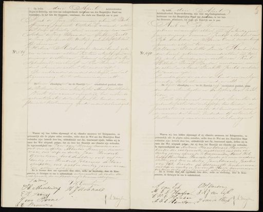 No. 481 Op heden drie April Achttienhonderd Negen-en-Zeventig, zijn voor ons ondergeteekende Ambtenaar van den Burgerlijken Stand van Amsterdam, in het huis der Gemeente, verschenen, ten einde een Huwelijk aan te gaan Derk de Jong, Stimmerman, geboren te Beet„ sterzwaag, gemeente Opsterlang, wonende alhier, oud zeven en twintig jaren, meerderjarige zoon van Siebren de Jong, tolgaarder en Siehkjen Jacobs de Jong, wonende te Hreterk gemeente Opsterland ter eenre en Helena Meschendorp, zonder beroep, gebo„ 09 ren en wonende alhier, oud twee entwintig jaren, min derjarige dochter van Johannes Samwel Me„ Schendork, machinisst en Eva Helena San„ ders, wonende alhier, ter andere zijde. En verklaarden de ouders der bruid, voor ons tegenwoordig toe te stemmen indezen echt. Debeide afkondiging en tot dit Huwdlijk zijn ouverhindend geschied, alhier den Zestienden en drie en twintigsten Maart laatstleden.- Voorts zijn aan ons overgelegd, ten eersten: de geboorte acten der verloofden/, ten tweeden: de no„ tariëele toestemming van de ouders des bruidegoms.- Waarna wij hun hebben afgevraagd of zij elkander aannemen tot Echtgenooten, en (getrouwelijk alle de pligten zullen vervullen, welke door de Wet aan den Iuwelijken Staat verbonden zijn: hetwelk door hen, uitdrukkelijk met JA, beantwoord zijnde, hebben wij in naam der Wet uitspraak gedaan, dat zij door het Huwelijk aan elkander zijn verbonden. In tegenwoordigheid van: Jan van Berne timmerman oud vier en dertig, Albertus Brouwer timmer man, oud drie en dertig, Jan Hendrik Gerritsen boekdrukker, oud vyf en dertig en Hendrik Johannes de Haas opzichter, oud acht en veertig jaren wonen de allen alhier En is hiervan door ons opgemaakt deze Akte, welke na voorlezing, door de Kom- paranten, de Getuigen en ons is onderteekend. uitgezonderd de vader der echtgenoote, die verklaarde niet te kunnen schrijven I de Jong J H Gerritsen P. Meschendap H Jochaal EH Sandon Driessor J van Berne t: Brouwer No. 490 Op heden drie April Achttienhonderd Negen-en-Zeventig, zijn voor ons ondergeteekende Ambtenaar van den Burgerlijken Stand van Amsterdam, in het huis der Gemeente, verschenen, ten einde een Dardlijk aan te gaan Aart van Lyk, Stimmerman geboren en wonende alhier, oud vijf en twintig jaren meerderjarige zoonvan Jacobus Adriannus van Eijk, overleden en Maria Ooms, zonder beroep wonende alhier, ter eenre en Maria Elisabetha Louisa Hanson, zon der beroep, geboren en wonende alhier, oud twin„ 10 tig jaren, minderjarige dochter van /Karl Wilhelm Eduari Hanson, woordraarer, wonen, de alhier en Maria Elisabetha Jacobs, overleden ter andere zijde. En verklaarde de vader der bruid voor ons tegen woordig, toe te stemmen indes en echt. De belide afkondigingen tot dit Huwelijk zijn onverhinderd geschied, alhier den drie en twintigsten en dertigsten Maart laatst leden. Voorts zijn aan ons overgelegd, ten eersten: de geboorte acten der verloofden, ten tweeden: de doodacten vanden vader des bruidegoms en van de moeder der bruid, ten derden: de notariëele toestemming van de moeder desbruidegoms Waarna wij hun hebben afgevraagd of zij elkander aannemen tot Echtgenooten, en getrouwelijk alle de pligten zullen vervullen, welke door de Wet aan den Huwelijken Staat verbonden zijn: hetwelk door hen, uitdrukkelijk met JA, beantwoord zijnde, hebben wij in naam der Wet uitspraak gedaan, dat zij door het Huwelijk aan elkander zijn verbonden. In tegenwoordigheid van: Antonie Frans Eduard Hanson, broeder der echtgenoote, machinist, oud vier en dertig jaren, wonende te Genemenden, Carel Wil„ helfm Christiaan Hanson broeder als voren machine steller, oud twee en dertig Jan Adrianus, Jacobus van Eijk, broeder des echtgenoots timmerman oud twee en veertig en Jan van de Plasse timmerman oud twee en dertig jaren wonende allen alhier En is hiervan door ous opgemaakt deze Akte, welke na voorlezing, door de Kom- paranten, de Getuigen en ons is onderteekend. CWC Janson van Eyk M E L Hassson. J A J van Eyk C W:E Hanser A. F. E. Hanson J van de Rasse Diessen
