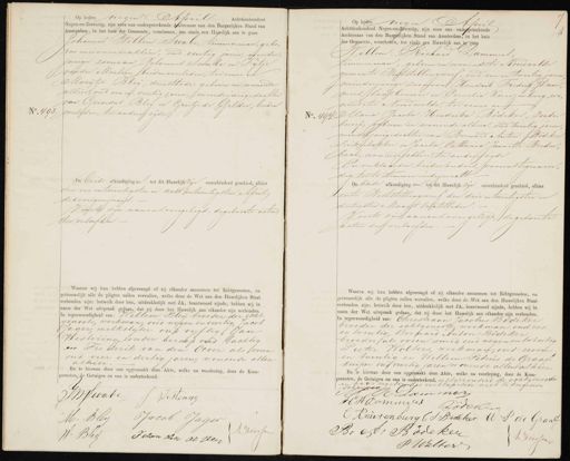 No. 493 Negen en Zeventig, zijn voor ons ondergeteekende Ambtenaar van den Burgerlijken Stand van Amsterdam, in het huis der Gemeente, verschenen, ten einde een Huwelijk aan te gaan Johannes Willem Swabe, Ttimmerman, gebo ren enwonende alhier, oud veertig jaren, meerder jarige zoonvan Johannes Swabe en Fytje vander Meulen, beiden overleden, ter eenre en Marijtje Bleij, dienstbode, geboren en wonende alhier, oud een en veertig jaren, meerderjarige dochter van Gerardus Bleij en Grietjede Gelder, beiden overleden, ter andere zijde, be beide afkondigingen tot dit Huwelijk zijn ouverhinderd geschied, alhier den een en twintigsten en acht en twintigsten April desvorigen jaarss. Voorts zijn aan onsovergelegd, de geboorte acten der verloofden Waarna wij hun hebben afgevraagd of zij elkander aannemen tot Echtgenooten, en (getrouwelijk alle de pligten zullen vervullen, welke door de Wet aan den IIuwelijken Staat verbonden zijn: hetwelk door hen, uitdrukkelijk met JA, beantwoord zijnde, hebben wij in naam der Wet uitspraak gedaan, dat zij door het Huwelijk aan elkander zijn verbonden In tegenwoordigheid van: Willem Bleij broeder der echt genoote, werkman, oud negen en veertig, Jacob Jager, melkslyter oud vyftig Jan Westering, zonder beroep oud tachtig in Frederik van den Oever als voren oud vier en dertig jaren, wonende allen alhier. En is hiervan door ons opgemaakt deze Akte, welke na voorlezing, door de Kom- paranten, de Getuigen en ons is onderteekend. JWSwabe J Westenng Jocob Jager M: Bley Driessen W: Bley Ielan den dl Veer No. 494 Op heden negen April Achttienhonderd Negen-en-Zeventig, zijn voor ons. ondergeteekende 1r Ambtenaar van den Burgerlijken Stand van Amsterdam, in het huis der Gemeente, verscheken, ten einde een Huwelijk aan te gadt Willem Richard Dammers Timmerman, geboren en wonende te Noordwolde gemeente Wegtstellingwerf, oud, een en twintig jaren minderjarige zoonvan Hendrik Fredrik Dam mers, landbouwer en Cornelia Knizenburg, wo„ nende te Noordwolde, ter eenre en Maria Jacoba Hendrika Bödeker, zonder beroep, /geboren en wonende alhier, oud twintig jaren minderjarige dochter van Bernard Anton Bödeker Suikerbakker en Jacoba Catharina Jannette Breden bach, wonende alhier, ter andere tijde En verklaarden beiden ouders, voorons tegenwoor„ dig, toe te stemmen indezen echt Debeide afkondiging en ter dit Huwelijk zijn onverhinderd geschied, alhier. ente Weststellingwerf den drie en twintigsten en dertigsten Maart laatstleden Voorts zijn aan ons overgelegd, de geboorte acten der verloofden. Waarna wij hun hebben afgevraagd of zij elkander aannemen tot Echtgenooten, en getrouwelijk alle de pligten zullen vervullen, welke door de Wet aan den Huwelijken Staat verbonden zijn: hetwelk door hen, uitdrukkelijk met JA, beantwoord zijnde, hebben wij in naam der Wet uitspraak gedaan, dat zij door het Huwelijk aan elkander zijn verbonden. In tegenwoordigheid van Christiaan Jacobus Bodeker broeder der echtgenoote, werkman oud zes en twintig, Berpard Anton Bödeker broeder / als voren smid, oud negen entwintig Pieter Wolters, werkman, oud zeven en twintig en Willem Petrus de Graaf kuiper oud veertig jaren wonende allen alhier. En is hiervan door ons opgemaakt deze Akte, welke na voorlezing, door de Kom paranten, de Getuigen en ons is onderteekend. ultgezonderd de echtgenoote en haaer moeder die verklaarden niet te kunnen schrijven J Zammer C H A Dammers Zoden C Knusenburg CS Bödeker U P de Graaf B. A: Bodekee Lriessen P Watter