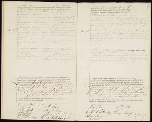 No. 8981 Op heden drie en twintig Mei Achttienhonderd Negen-en-Zeventig, zijn voor ons ondergeteekende Ambtenaar van den Burgerlijken Stand van Amsterdam, in het huig der Gemeente, verschenen ten einde een Huwelijk aan te gaan Gerrit Jacobus Molenaar, Scheepstimmerman, geboren te Rotterdam, wonende alhier, oud negen in twintig jaren, weduwwaar van Neeltje Elisabeth schrijver, meerderjarige zoon van Pieter Gerrit Molenaar, Scheepstimmerman en Johanna Jacoba Aijkens, wonende te Hellevoetsluis, ter eenrien waantje Kneijs, zonder beroep, geboren en wo¬ nende alhier, oud drie entwintig jaren, meerderja rige dochter van Willem Kneijs, scheepstimmerman en Jacoba Molenberg, wonende alhier, ter andere Zijde. En verklaarden beider ouders, voor ons tegenwoor„ dig, toe te stemmen in dezen echt,- De beide afkondiging en tot dit Huwelijk zin onverhinderd geschied, alhier den elfden en achttienden dezer Voorts zijn aan ons overgelegd, ten eersten: de geboorte acten der verloofden, ten tweeden: de dood, acte van de vorige echtgenoote des bruidegoms. Waarna wij hun hebben afgevraagd of zij elkander aannemen tot Echtgenooten, en getrouwelijk alle de pligten zullen vervullen, welke door de Wet aan den Iuwelijken Staat verbonden zijn: hetwelk door hen, uitdrukkelijk met Ja, beantwoord zijnde, hebben wij in naam der Wet uitspraak gedaan, dat vi door het Huwelijk aan elkander zijn verbonden. Es tegenwoordigheid van Jacob Hufftoen, werkman, oud even en dertig, Meen Garrelt de freese Smid oud zeven en twintig s Jotannes van Loo timmerman, oud vier endertig en Gijsbertusstofberg, als voren, oud negen en ttwintig jaren, wonende allen alhier En is hiervan door ons opgemaakt deze Akte, welke na voorlezing, door de Kom- paranten, de Getuigen en ons is onderteekend. CJ J Molenaar P. Kneijs J Guiffioen D: HHolmaa M J de Prien J P: Vykens J van Roo. Driessen W. Kneys No. 896 Op heden drie en twintig Mei 2 Achttienhonderd Negen-en-Zeventig, zijn voor ons ondergeteekende Ambtenaar van den Burgerlijken Stand van Amsterdam, in het huis der Gemeente, verschenen, ten einde een Huwelijk aan te gaan Hendrik de Rooy, winkelier, geboren en wonende alhier, oud negen en dertig jaren, laatstweduwnaar van Elisabeth Maria Helmers meerderjarige zoon van Harmanus de Rooij kleermaker en Anna Petronella Schrevelius, wo nende alhier, ter eenre en Margreta Oostendort, zonder beroep, geboren en wonende alhier, oud zeven en dertig jaren, meer derjarige dochter van Teurnes Postendorp en Margreta bertop, beiden overleden, ter ande„ rezijde Debeide afkondiging en tot dit Huwelijk zijn onverhinderd geschied, alhier den elfden en achttienden dezer Voorts zijn aan ons overgelegd ten eersten: de geboorte acten der verloofden, ten tweeden: de doodacte van de vorige echtgenoote des buurde Soms. Waarna wij hun hebben afgevraagd of zij elkander aannemen tot Echtgenooten, en getrouwelijk alle de pligten zullen vervullen, welke door de Wet aan den Huwelijken Staat verbonden zijn: hetwelk door hen, uitdrukkelijk met JA, beantwoord zijnde, hebben wij in naam der Wet uitspraak gedaan, dat zij door het Huwelijk aan elkander zijn verbonden. In tegenwoordigheid van Ken vader des echtgenoots oud even en zeventig, Gerrit Spnit Smager der echtgenoote, bediende, opd dertig, Johannes Franciscus Jutte, onderwyzer, oudzestig en Lauens van Norden timmerman Jan vyf entwintig jaren, wonende allen alhier 1En is hiervan door ons opgemaakt deze Akte, welke na voorlezing, door de Kom- paranten, de Getuigen en ons is onderteekend. J F: Jutte H de Rooij M Oostendorp L van Norders Driessen H. de Kooy