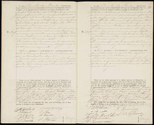 No. 231 Op heden Zes en twintig November Achttienhonderd Negen-en-Zeventig, zijn voor ons ondergeteekende Ambtenaar van den Burgerlijken Stand van Amsterdam, in het huis der Gemeente, verschenen, ten einde een Huwelijk aan te gaan Jacobus Gerbertus van Wilgenburg, warmoe„ zier, geboren alhier, wonende te Nieuwer Amstel, oud zes entwintig jaren, meerderjarige zoon van Jan van Wilgenburg Lovenier, wonend„ dete Nieuwer Amstel en Augenetha Blom, overleden, ter eenreen Marretje Volmer, zonder beroep, geboren en wonende alhier, oud een entwintig jaren minderjarige dochter van Arend/ Jan Vol„ mer barbier en Marritje Bosch, wonen„ de alhier, ter andere zyde En verklaarden de vader des bruidegoms ende deouders derbruid voor onstegenwoordig toe 17 te stemmen indezen echt- De beide afkondiging en tot dit Huwelijk zijn onverhinderd geschied, alhier ente Nieuwer Amstel den Zestienden en drie en twintigsten dezer Voorts zijn aan ons overgelegd, ten eer„ sten: de geboorte actender verloofden, ten tweedens de doodacte van de moeder desbruidegoms Waarna wij hun hebben afgevraagd of zij elkander aannemen tot Echtgenooten, en getrouwelijk alle de pligten zullen vervullen, welke door de Wet aan den Huwelijken Staat verbonden zijn: hetwelk door hen, uitdrukkelijk met JR, beantwoord zijnde, hebben wij in naam der Wet uitspraak gedaan, dat zij door het Huwelijk aan elkander zijn verbonden. In tegenwoordigheid van Jan van Bigenburg, broeder tes echtgenoots, tuinman oud veertig jaren wonende te Nieuwer Amstel, Johannes Blom„ oom des echtgenoots, zonder beroep, oud drie en zeventig, Reyer Bosch, oom de rechtge noote, schilder, oudvyftig en Pieter steensma Timmenman, oud drie entwintig jaren, wonende Allen alhier En is hiervan door ons opgemaakt deze Akte, welke na voorlezing, door de Kom- paranten, de Getuigen en ons is onderteekend. G Ge deelelin van wilgenburg WSilgenburg M VCmer J. Blom J van Wilgerburg R Bont VStmek Pis Driessen P Steensma 6 A BOs No. 23114 Op heden Zes en twintig November Achtienhonderd Negen-en-Zeventig, zijn voor ons ondergeteekende Ambtenaar van den Burgerlijken Stand van Wn Amsterdam, in het huis der Gemeente, verschenen, ten einde een Huwelijk aan te gaan Antonie Adrianus Comman, Wagenmaker milicien, geboren en wonende alhier, oud drie en twintig jaren, meerderjarige zoon van (Een„ drik P Pieter Comman en Margaretha, Cassée, beiden overleden ter eenre en Alida de Rolder, dienstbode geboren te loorn, wonende alhier, oud negen Bynen twintig jaren, meerderjarige dachter van Hendrikus de Rolder, werkman en Catharina Henning, wonende te Vloorn ter andere zyde En verklaarden de ouders derbruid, voor onttegenwoordig, toe te stemmen in dezen 6 echt. De beide afkondigingen tot dit Huwelijk zijn onverhinderd geschied, alhier den Zestienden en drie en twintigsten Noocember laatstleden. VVoorts zijn aan onsovergelegd ten eersten: de geboorte acten der verlvofden ten tweeden: de doodacten van de ouders desbruidegoms- 0 Waarna wij hun hebben afgevraagd of zij elkander aannemen tot Echtgenooten, en getrouwelijk alle de pligten zullen vervullen, welke door de Wet aan den Huwelijken Staat verbonden zijn: hetwelk door hen, uitdrukkelijk met JA, beantwoord zijnde, hebben wij in naam der Wet uitspraak gedaan, dat zij door het Huwelijk aan elkander zijn verbonden. In tegenwoordigheid van Hendrik Pieter Comman, broeder des echtgenoots, pakhuisknecht, oud vijf en dertig Hendrik Comman, broeder als voren, Jar Litter, oud zes entwintig Nicolaas Kenning oomder echtgenoote schilder, oudveertig jaren wonende allen alhier, en Dirk Aan Garden, oom als voren, beeldhouwer, oud acht en dertig jaren, wonende te Hoorn En is hiervan door ons opgemaakt deze Akte, welke na voorlezing, door de Kom- waranten, de Getuigen en ons is onderteekend, uitgezonderd demoede trechtgenoote, die verklaarde niet te kunnen S scpriven A A Costmalte Henning N a de vollen Roller vak Taral 2 E6 HS 17 Commmem Driessen J omman