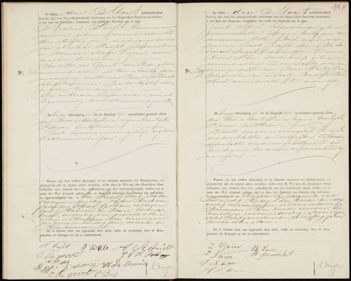 No. 3080 Op heden drie Maart Achttienhonderd Tachtig, zijn voor ons ondergeteekende Ambtenaar van den Burgerlijken Stand van Amsterdam, in het huis der Gemeente, verschenen, ten einde een Huwelijk aan te gaan Nicolaas Passet, timmerman milicien, geboren en wonende alhier, oud twee entwintig jaren minderjarige zoon van Nicolaas Passet Schoenmaker en Barendina Maria Duijvene, wonen„ de alhier, ter eenreen Charlotta de Groot, dienstbode, geboren minderjarige dochter van Cornelis de Groot 8en wonende alhier, oud twee en twintig jaren, scheepstimmerman en Jacoba Kahlé, wonen de alhier, ter andere zijde En verklaarden beiden ouders, voor ons tegenwoordig, toe te stemmen in dezen echt De beide afkondiging en tot dit Huwelijk zijn onverhinderd geschied, alhier den Twee en twintigsten en negen en twintigsten Februari laatstleden. Voorts zijn aan ons overgelegd, de geboor te aktender verloofden.— Waarna wij hun hebben afgevraagd of zij elkander aannemen tot Echtgenooten, en getrouwelijk alle de pligten zullen vervullen, welke door de Wet aan den Huwelijken Staat verbonden zijn: hetwelk door hen, uitdrukkelijk met JA, beantwoord zijnde, hebben wij in naam der Wet uitspraak gedaan, at, zij door het Huwelijk aan elkander zijn verbonden. In tegenwoordigheid van: Arie Rudolt Smit Schilder voonegen entwintig,/ Joseprus Christiaan Crederiaus Polduer, poortier, oudzes en twintig Hubertus de Bruin vierhuis houder, oudveertig jaren, wonende allen alhier en Christiaan Bies timmerman oud zeven en twintig jaren, wonende be Haarlemmermeer En is hiervan door ons opgemaakt deze Akte, welke na voorlezing, door de Kom paranten, de Getuigen en ons is onderteekend. N. Passet 3 Kale A Roniel De grool J C F Puldan F. Pesset nezeen H De Bruin Driessen Op heden drie Maart Achtienhonderd Tachtig, zijn voor ons ondergeteekende Ambtenaar van den Burgerlijken Stand van Amsterdam, in het huis der Gemeente, verschenen, ten einde een Huwelijk aan te gaan Jadok Spier, Schijvenschuurder, geboren en wonende alhier, onnegen en twintig jaren, we duwnaarvan Esther Buijs, meerderjarige zoon van Isaak Gesaijer Spier en Evasa Comons Swaap, Seiden overleden, ter eenreer Reina Lam, zonder beroep, geboren en wonende alhier oud drie en dertig jaren, meer „derjarige dochter van saac Hartog Lan schijvenschuwrder en Saartje Benedietus Ber Clouw, wonende alhier, ter andere tijd De beide afkondiging en tot dit Huwelijk zijn onverhinderd geschied alhier den twee en twintigsten en negen en twintigsten Februari laatsteden Voorts zijn aan ons overgelegd; ten eersten de geboorteakten der verloofden, ten tweede dedoodakte vande vorige echtgenoote des bruidegoms, ten derden de doodakten zy ner ouders Waarna wij hun hebben afgevraagd of zij elkander aannemen tot Echtgenooten, en getrouwelijk alle de pligten zullen vervullen, welke door de Wet aan den IIuwelijken Staat verbonden zijn: hetwelk door hen, uitdrukkelijk met JA, beantwoord zijnde, hebben wij in naam der Wet uitspraak gedaan, dat zij door het Huwelijk aan elkander zijn verbonden. In tegenwoordigheid van: den vader der echtgenoote, oud twee en zestig Hartog Zam, broeder der echtge troote, diamantslijper oudzeven entwintig Benedictus Lam, broeder als voren, dia mantslijper onovier entwintig en mozes Gou de het schijvenschuurder, ondvyftig jaren wonende allen alhier. En is hiervan door ons opgemaakt deze Akte, welke na voorlezing, door de Kom- paranten, de Getuigen en ons is onderteekend. Z Spier B Lam Sam M Goudiket J Lam DMessen