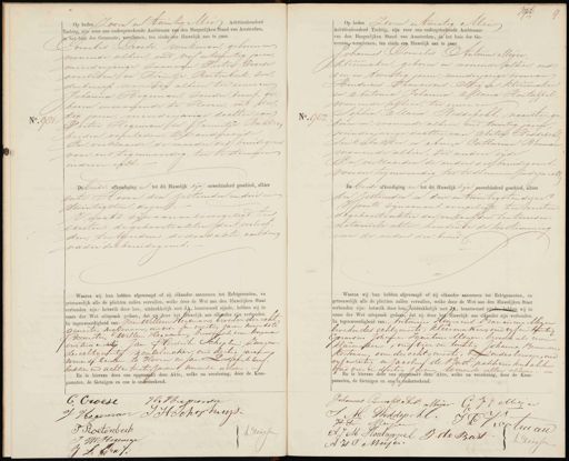 1 No. 981. Op heden Zoven en twintig Mei Achtienhonderd Tachtig, zijn voor ons ondergeteekende Ambtenaar van den Burgerlijken Stand van Amsterdam, sin het huis der Gemeente, verschenen, ten einde een Huwelijk aan te gaan Cornelis Groese, werkman, geboren en „ wonende alhier, oud vijf en twintig jaren, meerderjarige zoon van Pieter Prvese overleden en Trijntje Roetenbeek, zon„ der beroep, wonende alhier, ter eenreen Johanna egeman, zonder beroep, ge„ boren en wonende te Soorn, oud der„ tig jaren, meerderjarige dochter van Pieter Segeman en Jannetje Bakker beiden overleden, ter anderezyde En verklaarde de moeder des bruidegoms voor ons tegenwoordig, toe te stemmen in dezen echt. Debeide. afkondiging en tot dit Huwelijk zijn onverhinderd geschied, alhier en te Hoorn den zestienden en drie en twintigsten deser Voorts zijn aan onsovergelegd, ten eersten: de geboorte akten der verloop„ den, ten tweeden de doodakte van den vader desbruidegoms. „ Waarna wij hun hebben afgevraagd of zij elkander aannemen tot Echtgenooten, en getrouwelijk alle de plichten zullen vervullen, welke door de Wet aan den Huwelijken Staat verbonden zijn: hetwelk door hen, uitdrukkelijk met JA, beantwoord zijnde, hebben wij in naam der Wet uitspraak gedaan, dat zij door het Huwelijk aan elkander zijn verbonden. in tegenwoordigheid van: Jan Willem Hegeman, broeder der echt genoote, molenaar, oud vier en veertig jaren wonende te Beenister, Willem Hegeman, broeder als voren koopman oud twee en dertig, Jan Hendrik Schophuis, Zwager, de echtgenoots neubelmaker, oud dertig jaren wonende beiden te Hoorn en JanLodenyk Coras. bakker oud acht en twintig Jaren wonende alhier.— En is hiervan door ons opgemaakt deze Akte, welke na voorlezing, door de Kom- paranten, de Getuigen en ons is onderteekend. ... . . . . . e J8. Heegionsen C. Crvesi Hegeman I H Schrhuys. of T Roetenbeek Driessen No. 982 Wch Op heden Zeven en twintig Mei Achttienhonderd Tachtig, zijn voor ons ondergeteekende Ambtenaar van den Burgerlijken Stand van Amsterdam, in het huis der Ge- meente verschenen, ten einde een Huwelijk aan te gaan Johannes Cornelis Antonius Meyjer Kleermaker, geboren en wonende alhier, oud, een en twintig jaren, minderjarige zoonvan Hendricus Franciseus Meyer Kleermaker en Antonia Johanna Maria Houtappel wonende alhier, ter eenree Sophia Maria Weddepohl, naaister ge boren en wonende alhier, oud twintig jaren, minderjarige dochter van Anton Weddepohl Suikerbakker en Anna Catharina Bouman wonende alhier, ter andere zide En verklaarden de ouders des bruidegomt, voor ons tegenwoordig, toe te stemmen in dezen echt bebeide afkondiging en tot dit Huwelijk zijn onverhinderd geschied, alhier. den zestienden en drie en twintigsten dezer Voorts zijnaan ons overgelegd, ten eersten. degeboorte akten der verloofden, ten tweeden: notarisele akte houdende de toestemming van de ouders der bruid. Waarna wij hun hebben afgevraagd of zij elkander aannemen tot Echtgenooten, en getrouwelijk alle de plichten zullen vervullen, welke door de Wet aan den Huwelijken Staat verbonden zijn: hetwelk door hen, uitdrukkelijk met JA, beantwoord zijnde, hebben wij in naam der Wet uitspraak gedaan, dat zij door het Huwelijk aan elkander zijn verbonden. In tegenwoordigheid van: Antonius Henricus Franciscus Meyer broeder des echtgenoots, kleermaker, oud vyf en twintig Gerardus Johanes Ignatius Meyer, broeder als voren kleermaker, oud vier en twintig Johannes Bernerder kostman, oom des echtgenoots, zonder beroep, oud vyf enzestig en Jacobus de Bart, pakhinsknecht oud vier en dertig jaren, wonende allen alhier En is hiervan door ons opgemaakt deze Akte, welke na voorlezing, door de Kom- paranten, de Getuigen en onsis onderteekend. li ... . . . . . . . . . . . . . . . . „. Johannes Connlis An J: Mey en Meijer 11 M. Weddepohl. J F Kootraau a H Jan Meesser 1 „ A J M Houtappel J de Bart Driesson A J T Meeser