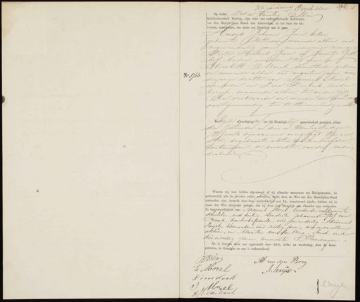 No. 966. W.F. van Densse Eerste blad Wch Op heden Zes en twintig Mei Achttienhonderd Tachtig, zijn voor ons ondergeteekende Ambtenaar van den Burgerlijken Stand van Amsterdam, in het huis der Ge- meente, verschenen, ten einde een Huwelijk aan te gaan Hendrik Johannes Gener, ellner, geboren te Rotterdam wonende alhier, oud, negen endertig jaren, meerderjarige zoon van D Pieter Hendrik Jener en Jannetje Gelt hof, beiden overleden, ter eenre en Elisabeth Morel, dienstbode geboren en wonende alhier, oud negentien jaren, min„ 1 derjarige dochter van Sammel Morel overleden en Lena Limbeek, zonder beroep; wonende alhier, ter andere zijde En verklaarde de moeder der bund, voo onstegenwoordig, toe te stemmen in desen echtt bebeide afzondiging een tot dit Hurelijk zijn ouverhindend geschied, alhier. den zestienden en drie en twintigsten deser, Voorts zijn aan ons overgelegd, ten eer„ sten: de geboorte akten der verloofden, ten tweeden: de doodakte van den vader derbruid. Waarna wij hun hebben afgevraagd of zij elkander aannemen tot Echtgenooten, en getrouwelijk alle de plichten zullen vervullen, welke door de Wet aan den Huwelijken Staat verbonden zijn: hetwelk door hen, uitdrukkelijk met JA, beantwoord zijnde, hebben wij in naam der Wet uitspraak gedaan, dat zij door het Huwelijk aan elkander zijn verbonden. In tegenwoordigheid van: Samuel Sorel, broeder der echtgenoote schilder, oud dertig, Hendrik Johannes Stet van Baak, kantoorbediende, oud een en dertig Adrianus Vuijst, kleermaker, oud zestig jaren, wonende allen alhier, en Maarten van den Berg, Smid, oud drie en veertig jaren wonende te Plaardingen. En is hiervan door ons opgemaakt deze Akte, welke na voorlezing, door de Kom- paranten, de Getuigen en ons is onderteekend. .. ...1.
