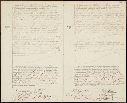 No. 975. Op heden Zes en twintig Mei Achtienhonderd Tachtig, zijn voor ons ondergeteekende Ambtenaar van den Burgerlijken Stand van Amsterdam, in het huis der Gemeente, verschenen, ten einde een Huwelijk aan te gaan Jacobus van Delft, metselaar, geboren te Rijpe, wonende te sloten, oud acht en twintig jaren, meerderjarige zoonvan Jan Hendrik van Delft, metselaar; wonen de te Sloten en Cornelia Zwaan, overleden ter eenre en Caria van Zanten, dienstbode, geboren te Vianen, wonende alhier, oud vijf en twin tig jaren, meerderjarige dochter van Jacob van zanten werkman wonende te Vianen, en Elijabeth (Heggie, overleden, ter andere zijde En verklaarden de beide vaders, voor onstegenwoordig, toe te stemmen in dezen echt De beide afkondigingen tot dit Huwelijk zin onverhinderd geschied, alhier en te Sloten den negenden en Sestienden dejer. Voorts zijn aan ons overgelegd ten eersten: de geboorte akten der verloofden ten tweeden: de doodakten van de beide moeders.Waarna wij hun hebben afgevraagd of zij elkander aannemen tot Echtgenooten, en (getrouwelijk alle de plichten zullen vervullen, welke door de Wet aan den Huwelijken Staat verbonden zijn: hetwelk door hen, uitdrukkelijk met JA, beantwoord zijnde, hebben wij i naam der Wet uitspraak gedaan, dat zij door het Huwelijk aan elkander zijn verbonden In tegenwoordigheid van: Jacob Heggie, oom der echtgenoote metselaar, oud vijf en vyftig Gerardus Kok schoenmaker, oud acht en vyftig. Dirk Yfs, logementhouder, oud acht en dertig en Ladewyk Joseph de Jong, opperman, oud vier en vyftig jaren wonende allen alhier En is hiervan door ons opgemaakt deze Akte, welke na voorlezing, door de Komparanten, de Getuigen en ons is onderteekend. .. . . . . . . .. K6 70 70 H Panzanten H Van Delft D JH J de Jong Riessen Van Zanten No. 971 W Op heden Zeven en twintig Mei Achtienhonderd Tachtig, zijn voor ons ondergeteekende Ambtenaar van den Burgerlijken Stand van Amsterdam, in het huis der Gemeente, verschenen, ten einde een Huwelijk aan te gaan Jan Jacob Eggenttein Koopman, geboren en wonende alhier, oud vier en veertig jaren, meerderjarige zoon van Willem Jacobus 8 Eggenstein en Johanna Bierman, beiden overleden, ter eenre en H Petronella Adeleida Everardina Caron zonder beroep, geboren te 's Gravenhage, wo1 nende alhier oud een en veertig jaren, meer derjarige dochter van Jozeph Eelestin Caron en Jurriana Frederika Vreedenberg, beiden overleden, ter andere zide De beide afkondiging en tot dit Huwelijk zijn ouverhijnderd geschied, alhier den achttienden en vyf en twintigsten April laatstleden. Voorts zijnaan ons overgelegd, de geboorte akten der verloofden. Waarna wij hun hebben afgevraagd of zij elkander aannemen tot Echtgenooten, en getrouwelijk alle de plichten zullen vervullen, welke door de Wet aan den Huwelijken Staa verbonden zijn: hetwelk door hen, uitdrukkelijk met JA, beantwoord zijnde, hebben wij in naam der Wet uitspraak gedaan, dat zij door het Huwelijk aan elkander zijn verbonden In tegenwoordigheid van: Petrus Josephus Cornelis Jacobus Caron broeder der echtgenoote, kleermaker, oud zes en veertig Johannes Muttus, zwager der echtgenoote grossier, oud acht en veertig jaren, / wonende beiden te 's Gravenhage Willem Jacobus Eggenstein broeder des echtgenoots koopman, oud zes en veertig, en Johan Albregt Burlage kassier oud vier en dertig jaren wonende beiden alhier. En is hiervan door ons opgemaakt deze Akte, welke na voorlezing, door de Komparanten, de Getuigen en ons is onderbeekend. Eggenstein JhMutten 16 4 NJ Eggenstun 1 aron Driessen Caro JBontare J Conn