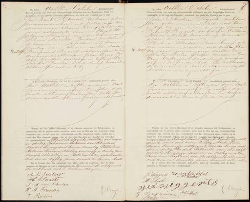 No 2146 zijn aan ons overgelegd, ten eersten: boorte aktender verloofden, ten tweeden de doodakten hunner vorige echtgenooten Waarna wij hun hebben afgevraagd of zij elkander aannemen tot Echtgenooten, en getrouwelijk ale de pichten aulen vervulen, welk door de Wet aan den Hanelijken Stug verbouden zijn: hetrelk door hen, uidroekelijk met Id, bennewoord zijnde, bebben wij uin naam der Wet uitspraak gedaar, dat zij door het Huwelijk aan elkander zijn verbonden dan tegenwoordgheid van Hendrik Swarts, schilder oud negen en dertig, Johannes Antonius van Schiedam zonder beroep oud twee en zeventig, Wilhelmus Antonius Fransen, Schilder ond negen en veertig jaren wonende allen alhier en Jakobus Pieters, schoenmaker oud een en vijftig jaren, wonende te Nieuwer- Amstel„ En is hiervan door ons opgemaakt deze Akte, welke na voorlezing, door de Kom- paranten, de Getuigen en ous is onderteekend uitgezondend de echtgenoot die verklaarde niet te kunnen schrijven A L. Jouker H. Swarts J A van Scheezam W. A. Fransen Driecker Twee-en-Tachtig, zijn voor ons ondergeteekende Ambtenaar van den Burgerlijken Stand van Amsterdam, in het huis der Gemeente verschenen, ten einde een Huwelijk aan te gaan Jan Karel Heuvers, werkman, geboren enwonende alhier, oud zestig jaren, we„ duwwaarvan Maria Koenraats, meerder jarige natuwelijke zoon van Elisabeth Maria Heuvers, overleden, te eenigen Anna Lacrctia Jonker, werkster, geboren en wonende alhier, oud zeven en veertig jaren, weduwe van Christiaan Bernardus Rudolf Schwenniker, meer derjangedachter van Johan Georg Cob Jonker overleden en Anna Su¬ Sanna Cansen, zonderberoep, wonende alhier ter ondere tijde De Oeide afkondiging en tot dit Huwelijk zijn onverhinderd geschied, alhier den Achtsten en vijftienden dezer, Voorts zijn aan ons overgelegd teneersten: de ge„ boorte aktender verloofden, ten tweeden de doodakten hunner vorige echtgenooten Waarna wij hun hebben afgevraagd of zij elkander aannemen tot Echtgenooten, en getrouwelijk ale de pichten aulen vervulen, welk door de Wet aan den Hanelijken Stug verbouden zijn: hetrelk door hen, uidroekelijk met Id, bennewoord zijnde, bebben wij uin naam der Wet uitspraak gedaar, dat zij door het Huwelijk aan elkander zijn verbonden dan tegenwoordgheid van Hendrik Swarts, schilder oud negen en dertig, Johannes Antonius van Schiedam zonder beroep oud twee en zeventig, Wilhelmus Antonius Fransen, Schilder ond negen en veertig jaren wonende allen alhier en Jakobus Pieters, schoenmaker oud een en vijftig jaren, wonende te Nieuwer- Amstel„ En is hiervan door ons opgemaakt deze Akte, welke na voorlezing, door de Kom- paranten, de Getuigen en ous is onderteekend uitgezondend de echtgenoot die verklaarde niet te kunnen schrijven A L. Jouker ts Op heden achttien October Achttienhonderd Twee-en-Tachtig, zijn voor ons ondergeteekende Ambtenaar van den Burgerlijken Stand van Amsterdam, in het huis der Gemeente, verschenen, ten einde een Huwelijk aan te gaan ohan Christiaan iggerts, meubelma„ ker, geboren en wonende alhier, oud twee en twintig jaren, minderjarige zoon van Wiggert Wiggerts overleden en Catharina Rouisa Mirck, zonder beroep, wonende, alhier ter eenre en Helena Seeder, zonder beroep, gebo ziren en wonende alhier, oud acht en stuin tig jaren, meerderjarige dochter van Marten Pieter Seeder overleden en Geer truij Verkruijsen, zonder beroep, wonende alhier ter andere zijde. En verklaarden de beide moeders, voor onstegenwoordigtoe te stemmen in dezen echt De Eerde afkondiging en tot dit Hunerje zijn onverhinderd geschied, alhier den achtsten en vijftienden dezer, Voorts zijn aan ons overgelegd ten eersten: de ge„ boorte aktender verloofden, ten tweeden. de doodakten van de beide vaders. Waarna wij hun hebben afgevraagd of zij elkander aannemen tot Echtgenooten, en getrouwelijk alle de plichten zullen vervullen, welke door de Wet aan den Huwelijken Staat verbonden zijn: hetwelk door hen, uitdrukkelijk met JA, beantwoord zijnde, hebben wij in naam der Wet uitspraak gedaan, dat zij door het Huwelijk aan elkander zijn verbonden. In tegenwoordigheid van Lodewijk Daniel Wiggerts, broeder des echt„ genoots, smid oud zes en twintig, Marten Pieter Seeder, broeder der echtgenoote, zonder beroep oud drie en dertig, Hendrik Witteveld, oom des echt„ genoots, tunman oud een en zestig en An„ tonie van Lufland, oom der echtgenoote, zilversmid oud zeven en zeventig jaren, wonende allen alhier En is hiervan door ons opgemaakt deze Akte, welke na voorlezing, door de Kom- paranten, de Getuigen en ons is onderteekend. Hltiggerk ze wette vld Mtlecder H Seeuter Heezggeris Driessen Verkruisen A Vdeslun i1