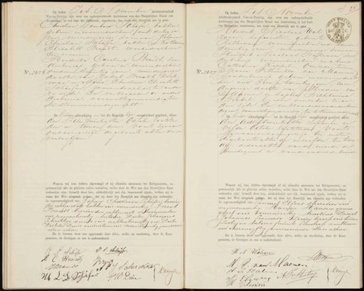 No. 2456 Op heden Zes November Achttienhonderd Vier-en-Tachtig, zijn voor ons ondergeteekende Ambtenaar van den Burgerlijken Stand van Kinsterdam in het huis der Gemeente, verschenen, ten einde en Huwelijk aan te gaan hristian Dconhard SChäfer, bakker geboren en wonende alhier, oud dertig ja ren, meerderjarige zoon van Johann Christian Schafer bakker en Katharing Elisabeth Brandt, wonende alhier ter eenree Hendrika Carolina Brands, zou derberoep, geboren en wonende alhier. 6Oudeeren twintig jaren, minderjarige dachter van akob Brands Koop man en Maria Christina Elisabeth Schässer, wonende alhier, ter ande re zijde. En verklaarden de ouders derbruid, voorons tegenwoordig toe Te stemmen in dezen echt De Oeide afkondiging en tot dit Huwelijk zijn, onverhinderd geschied, alhier den Zesen twintigsten October laatstee den en tweeden dezer Voorts zijn aan ons overgelegd, de geboorte akten der Verloofden Waarna wij hun hebben afgevraagd of zij elkander aannemen tot Echtgenooten, en getrouwelijk alle de plichten zullen vervullen, welke door de Wet aan den Huwelijken Staat verbonden zijn: hetwelk door hen, uitdrukkelijk met JA, beantwoord zijnde, hebben wij in naam der Wet uitspraak gedaan, dat zij door het Huwelijk aan elkander, zijn verbonden. In tegenwoordigheid van: Johan Christiaan Schäfer, broeder des echtgenoots bakker oud vierendertig Jacob Brands broeder der echtgenoote schoenmaker oud zevenentwintig. Antonie Pieter Johannes Schrikker smid oud achtentwintig en Pieter Wilhelm Duin conducteur oud drieentwintig jaren wonende allen alhier. En is hiervan door ons opgemaakt deze Akte, welke na voorlezing, door de Kom- paranten, de Getuigen en ons is onderteekend. J.C. Schöfer L. Schöfe H C Brands Brondt JRrands A P J Schrikker Driessen VSirfar P No. 2454 V.E. 25 Op heden Zes November Achttienhonderd Vier-en-Tachtig, zijn voor ons ondergeteekende Ambtenaar van den Burgerlijken Stand van Amsterdam, in het huis der Gemeente, verschenen, ten einde een Huwelijk aan te gaan Hendrik Nicolaas Wal raven, hofmeester, geboren te Rotterdam wonende alhier, oud tweeën twintig jaren, minderjarige zoonaan Hendrik Nicolaas Walraven Jon. der beroep wonende alhier en Anna Catharina Koppel, Overleden sereemree : Ollana Petronella van Maenen, onderberoep, geboren en wonende al hier, oud zevenen twintig jaren, meer derjarige dochter van Theodore van Olldenen en Saphia Wilhelmina Wickel, beiden overleden, teran dere zyde. En verklaarde de vader desbrui degoms vooronstegenwoordig toe te stemme in dezen ech De beide afkondigingen tot dit Hunchik zijn onverhinderd geschied, alhier den achtentwintigsten September en vijfden October laatstleden. Voorts zijn aan ons overgelegd, ten eersten de geboorte akten der verloofden, ten twee den: dedordakten vande moeder des bruidegoms en van de ondersderbruid Waarna wij hun hebben afgevraagd of zij elkander aannemen tot Echtgenooten, en getrouwelijk alle de plichten zullen vervullen, welke door de Wet aan den Huwelijken Staat verbonden zijn: hetwelk door hen, uitdrukkelijk met JA, beantwoord zijnde, hebben wij in naam der Wet uitspraak gedaan, dat zij door het Huwelijk aan elkander zijn verbonden. In tegenwoordigheid van: Samuel Elfers stucadoor oud negenenveertig. Hansje Hansen varens„ gezel oud vierendertig Arnoldus Daniel Johannes Teeman zonder beroep oud tweeën Zestig en Antonie frederik Stentrop ambtenaar oud vierenvyftig jaren wonende allen alhier. En is hiervan door ons opgemaakt deze Akte, welke na voorlezing, door de Kom- paranten, de Getuigen en ons is onderteekend. H N Waliaren LHtmen M P. van Maenen H B Walen Driessen Elver AF Stentra