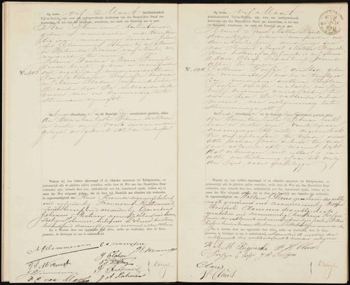 No 442 Op heden vijf Maart Achttienhonderd Vijf-en-Tachtig,zijn voor ous ondergeteekende Ambtenaar van den Burgerlijken Stand van Amsterdam, In het huis der Gemeente, verschenen, ten einde een Huwelijk aan te gaan Vrie Glimmerveen, kantoorbediende, geboren en wonende alhier, oud tweeëntwin„ tig jaren, minderjarige zoon van Johan wes Glimmerveen Schrijver bij de (Marine en Petronella Klasma van Marle, wo„ nende alhier, ter emeen Johanna Paulina Maria Teunissen Zonder beroep, geboren en wonende alhier. 405 Oud negentien jaren minderjarige dochtervan Carel Alexonder Teumssen koopman en Johanna Claban, wonende alhier Ter andere Zijde. En verklaarden beiden Ouders voor ons tegenwoordig toete stemmen in dezen echt. De beide afkondiging en tot dit Huwelijk Zijn onverhinderd geschied, alhier. den twee en twintigsten Februari laatstleden en eersten dezer Voorts zin aan ontover„ gelegd, de geboorte akten der verloofden. Waarna wij hun hebben afgevraagd of zij elkander aannemen tot Echtgenooten, en getrouwelijk alle de plichten zullen vervullen, welke door de Wet aan den Huwelijken Staat verbonden zijn: hetwelk door hen, uitdrukkelijk met JA, beantwoord zijnde, hebben wij in naam der Wet uitspraak gedaan, dat zij door het Huwelijk aan elkander zijn verbonden. In tegenwoordigheid van Rein Kramer sigarenfabrikant oud vijfendertig. Franciscus Rabbinowch zonder beroep oud vierendertig Gerardus Johannes Woutman sejaren Cabuhant oud tweeen, Zestig en Johannes Antonius Lohman kantoor, bediende oud drieenvyftig jaren wonende allen alhier En is hiervan door ons opgemaakt dete Akte, welke na voorlezing, door de Kom- paranten, de Getuigen en ons is onderteekend. C & Teuvysen AMlemmeroer R. Kzoeme J Clabor C607o S Woutman J P MTlumissen Diiessen F Rabbinaurt J. Ellimmerser NNo. 401 Op heden vif Maart Achttienhonderd Vijf-en-Tachtig, zijn voor ons ondergeteekende Ambtenaar van den Burgerlijken Stand van Amsterdam, in het huis der Gemeente, verschenen, ten einde een Huwelijk aan te gaan Heinrich August Matthias Bigincke 8 diamantslijper, geboren en wonende alhier, oud drie en twintig jaren, meerderjarige zoon van Heinnch August Matthias Biginsko Wiens bestaan of verblijf onzeker is en Johanna Maria Claus, onder beroep wonende Alhier, ter lemeen 4 Catharina Tossijn, dienstbode geboren en wonende alhier, oud een en twintig ja Een, minderjarige dochter van Christiaan Tossijn overleden en Aaltje van Bee Een, koopvrouw wonende alhier, ter andere tijde. En verklaarden de beide moeders, voor onstegenwoordig, toe te Stemmenindezen echt. De beide afkondigingeen tot dit Huwelijk zijn onverhinderd geschied, alhier. den tweeëntwintigsten Februari laatst. leden en eersten dezer, Voorts. zijn aan ons overgelegd, ter rersten: de geboorte ak ten der verloofden, ten twleden: de dood akte van den vader derbruid, ten derden Eene notarisele akte waaruit blijkt dat de bruidegom niet instaat is eene akte van toestemming of van het overlij den Zyns vaders overteleggen. Waarna wij hun hebben afgevraagd of zij elkander aannemen tot Echtgenooten, en getrouwelijk alle de plichten zullen vervullen, welke door de Wet aan den Huwelijken Staat verbonden zijn: hetwelk door hen, uitdrukkelijk met JA, beantwoord zijnde, hebben wij in naam der Wet uitspraak gedaan, dat zij door het Huwelijk aan elkander zijn verbonden In tegenwoordigheid van: Willem Claus grootvader des echtge noots goudsmid oud zevenenzeventig. Willem Hendrik Claus oom des echtgenvols winkelier oud zevenenveertig Christiaan Tossijn broeder der echtgenoote werkman ou vijfendertig en Jacobus Willem Sossijn broeder alsvoren steenhouwer oud achtentwintig jaren wonende allen alhie VEn is hiervan door ons opgemaakt deze Akte, welke na voorlezing, door de Kom- paranten, de Getuigen en ons is onderteekend, uitgezonderd de moeder der echtgenoote die verklaarde niet te kunnen schrijven H R. M Biginski W H Clawr Perfign C Sosijn J W Tossijn Driessen Caris