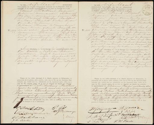 No. 391 Op heden vijf Maart Achtienhonderd Vijf-en-Tachtig, zijn voor ons ondergeteekende Ambtenaar van den Burgerlijken Stand van Amsterdam in het huisder Gemeente verschenen, ten einde een Huwelijk aan te gaan Olinrich Wackhaus, Koopman, geboren en wonende alhier, oud tweeënvijf. tig jaren, meerderjarige zoon van Joran nes Friedrich Christian Backhaus en Maria Elisabeth Kesler, beiden overleden, ter eenreen Maria Theresia Nieuwenhuizen, zonder beroep, geboren te Bergeijk, wo„ „nende alhier, oud drie en vijftig jaren, Weduwe van Harmanus Jacob Kerk„ lingh, meerderjarige dachter van Adri„ aan Nieuwenhuisen en Hendrika Ver donk, beiden overleden, ter andere zijde De beide afkondigingenn tot dit Huwelijk Zijn onverhinden geschied, alhier den Achtsten en Vijftienden Februari laatstleden, voorts zyn aan onsover gelegd, ten eersten: de geboorte ak sender verloofden, ten tweeden: de doodakte van den vougen echtgenoot der bruid.. Waarna wij hun hebben afgevraagd of zij elkander aannemen tot Echtgenooten, en getrouwelijk alle de plichten zullen vervullen, welke door de Wet aan den Huwelijken Staat verbonden zijn: hetwelk door hen, uitdrukkelijk met JA, beantwoord zijnde, hebben wij in naam der Wet uitspraak gedaan, dat zij door het Huwelijk aan elkander zijn verbonden. In tegenwoordigheid van: Dirk Christiaan Backhaus boeder zes echtenoots smid oud vijfenveertig Jan Kors Boschen neef des echtgenoots koetsier oud negenentwintig Pieter Post timmerman oud eenenzestig en Wilhelmus Hendricus Joanmas Dendavingh cinis oud drieentwintig jaren wonende allen alhier zis hiervan door ons opgemaakt deze Akte, welke na voorlezing, door de Kom- parantie, de Getuigen en ons is onderteekend No. 400 Op heden Vyf Maart Achttienhonderd Vijf-en-Tachtig, zijn voor ons ondergeteekende Ambtenaar van den Burgerlijken Stand van Amsterdam, in het huis der Gemberte, verschenen, ten hue ten Huwelijk van e illem Frederik Bivoet. Koopman, geboren en wonende te Gelder, oud tweeentwintig jaren minderjarige zoon van Willem Frederik Bijvoet en Adriana Margaretha Christina Hol appel, beiden overleden, ter eenreer Barendina Margaretha Rüfer, zonder beroep 100 geboren en wonende alhier, oud twintig jaren, minder jarige dochter van Johannes Rüfer Koopman en Johanna Elisabeth Jansp, wonende alhier, ter andere Zijde. En verklaarden de voogd des bruidegom Metname Andries Bijvoet, zonder beroep. wonen de te Helder ende ouders derbruid, haarvader mede in qualiteit van toezienden voogd des bruidegoms, allen voor onstegenwoordig toe te stemmen in desen echt. De beide afkondiging en tot dit Huwelijk zijn onverhinderd geschied, alhier den Twee en twintigsten Februari laatstleden en lersten dezer en te Helder op dezelfde data Voorts zyn aan ons overgelegd ten eersten de geboorte akten der verloofden, ten twee den: de doodakten van de Oudersen groot ouders des bruidegoms; ten derden: proces-ver baal van benoeming van zynenvoogd en toezien denvoogd Waarna wij hun hebben afgevraagd of zij elkander aannemen tot Echtgenooten, en getrouwelijk alle de plichten zullen vervullen, welke door de Wet aan den Huwelijken Staat verbonden zijn: hetwelk door hen; uitdrukkelijk met JA, beantwoord zijnde, hebben wij in naam der Wet uitspraak gedaan, dat zij door het Huwelijk aan elkander zijn verbonden. In tegenwoordigheid van: Johannes Rüfer grootvader der echtgenoote zonder beroep oud negenenzeventig Willem Petrus Brettschneider oom der echt noote pakhuismeester oud achtenvijftig Rewdoof Herman Koster stiegelfobrikant oud drieëntwintig Harel Hendrik Ringk winkelieroud drieenveertig jaren wonende allen alhier. En is hiervan door ons opgemaakt deze Akte, welke na voorlezing, door de Kom- paranten, de Getuigen en ons is onderteekend. Hf Bijvoerv J Janse 0 J Koeter B M ReuseW P Witstsehug Bognet P:H. Koster Dieit