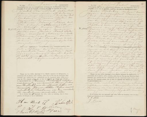 No. 1335 Op heden Een Juli Achtienhonderd Vijfen-Tachtig, zijn voor ons ondergeteekende Ambtenaar van den Burgerlijken Stand van Amsterdam, in het huis der Gemmeente, verschenen tan eude een Huwelijk aan te gaan Hendrik van Beek pakhuisknecht geboren en wonende alhier, oud dertig jaren; meerderjarige zoon van Dirk van Beek werkman en Francina Spijker, Wo„ nende alhier ter enreen Petronella Johanna Raves werk ster, geboren en laatst gewoond hebbende te Alkmaar, wonende thans alhier. oud achtentwintig jaren, meerderjarige dachter van Jacobus Raves Stuka door wonende te Alkmaar en Agatha Petronella van Drunen, overleden, ter andere zijde. Enverklaarde de vader derbruid, voor onstegenwoordig toe testem men imdegenecht De Deide afzondigingen tot dit Kuwerijk zijn ouverhindend geschied, alhier Cnte Alkmaar den Veertienden en een en twintigsten Juni laatstleden, voorts zijn aan ons overgelegd teneersten: de geboor te akten der verloofden, ten tweeden: de doodakte van de moederderbruid. Waarna wij hun hebben afgevraagd of zij elkander aannemen tot Echtgenooten, en getrouwelijk alle de plichten zullen vervullen, welke door de Wet aan den Huwelijken Staat verbonden zijn: hetwelk door hen, uitdrukkelijk met JA, beantwoord zijnde, hebben wij in naam der Wet uitspraak gedaan,dat zij door het Huwelijk aan elkander zijn verbonden. In tegenwoordigheid van: Herman Huberstok metselaar oud drieenvijftig, aren wonende te Alkmaar Joehem van Stempooort oom des echtgenoots tapper oud Zevenenviftig Johannes Abertus Plesken smidou vijfendertig en Christianus van Veen modelmaker oud zesendertig jaren wonende allen alhier En is hiervan door ous opgemaakt deze Akte, welke na voorlezing, door de Kom- paranten, de Getuigen en ons is onderteekend. H van Beek H Habarstek P: P. Pares V SJ Ehen Veen 1 Driessen MNt No. 1336 Op heden een Juli Achtienhonderd Vijf-en-Tachtig, zijn voor ons ondergeteekende Ambtenaar van den Burgerlijken Stand van Amsterdam, in het huis der Gemeente versekenen, ten einde een Huwelijk aan te gaan Jacobus Klinkenberg, werkman wonende Alhier, gehuwd geweest met Cornelia van Rees, werkster, wonende mede alhier dieaanonster inschryving in de registers van den Burgerlijken stand alhier, heeft Overgelegd een ionnis aan de Arrondissements Rechtbank alhier, gewegen den zesden Januari Asjesjaars, waarbij nadat tegende gedaagde Cornelia van Rees, verstekt wats verleend op grond van kwaadwillige verlating van de zijde van laatstgenoemde, is verklaard geworden dat het huwelijk tusschen: Jaco bus Klinkerberg en Cornelia van Rees bestaan hebbende door echtscheiding is ont bonden: welk vonnis op den dertien der Mei daaraanvolgende aanlaatstge af kondiging tot dit Huwelijk on verhinderd geschred, alhier noemde is beteekend/ Oorts heeft de Comparant aan ons overgelegd een getuig Schrift van den Heer Grifbier bij voor melde rechtbank, ten bewijze strekkende dat op zijne registers geene aanteekening van verzettegenhetzelve vonnis is gedaan En hebbenwy hiervan opgemaakt deze akte in tegenwoordigheid van: Cornelis Gijs bertus Stoele, Smid, oud Zevenentwintig en Jo„ hannes Boom, winkelier, oud drieendertig van wonende beiden alhier die met ons dezena voorle„ Waarna wij hun hebben afgevraagd of zij elkander aannemen tot Echtgenooten, en getreuwelijk alle de plichten zullen vervullen, welke door de Wet aan den Huwelijken Staat verbonden zijn: hetwelk door hen, uitdrukkelijk met JA, beantwoord zijnde, hebben wij in naam der Wet uitspraak gedaan, dat zij door het Huwelijk aan elkander zijn verbonden- In tegenwoordigheid van Zing hebben onderteekend, Verklarende de Comparant Niettekunnen schryven, tevens goedkeurende de bo Venstelling van één geschrevenwoord en de door„ haling van tweeënnegentig gedliikte woorden En ie hiervan door ons opgemaakt dezo Akte, welke vor de kom paranten de Getuigen en ons is onderteekend. C G Poele J Boom