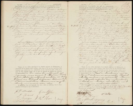 No. 1337 Achttienhonderd Op heden Een Ei Vijf-en-Tachtig, zijn voor ons ondergeteekende Ambtenaar van den Burgerlijken Stand van Amsterdam, in het huis der Gemeente verschenen, ten einde een Huwelijk aan te gaan erardus Johannes Mudde, uitdrager, geboren te Bennebroek wonende alhier, soud vifendertig jaren, weduwwaarvan Elisabeth Susanna Eijfert, meerder jarige zoon van Hendrik Mudde J:en, Cathanma Dingerdis, beiden overleden ter eenre Jakoba Brouwer, dienstbode, 3„:geboren en laatstgewoond hebbende te Bussum swwonende thans alhier, oud zesendertig ia Een, meerderjarige dochter van Jan Brouwer werkman en Gijsberta Splinter, wonende te Russum, ter andere Zijde. De beideafhondigingen tot dit Huwelijklijk onverhinderd geschied, alhier lnte Bussum den Veertienden en Eenen twintigsten Juni laatsteden, Voorts zin aan ons overgelegd ten eersten de geboorte akten der verloofden, ten tweeden: de doodakte van de vorige echtgenoote des bruidegomb, Waarna wij hun hebben afgevraagd of zij elkander aannemen tot Echtgenooten, en getrouwelijk alle de plichten zullen vervullen, welke door de Wet aan den Huwelijken Staat verbonden zijn: hetwelk door hen, uitdrukkelijk met JA, beantwoord zijnde, hebben wij in naam der Wet uitspraak gedaan, dat zij door het Huwelijk aan elkander zijn verbonden. In tegenwoordigheid van den vader der echtenoote, oud Zesenzestig jaren wonende te Bussum Leendert Mudde hoeder der echtgenoote winkelier oud dertig Gerrit van Offeren tapper oud tweeënveertig in Johannes van Hees Ttimmerman oud vijfen„ Twintig jaren wonende allen alhier En is Biervan door ons opgemaakt deze Akte, welke na voorlezing, door de Kom- paranten, de Getuigen en ons is onderteekend. G J Mudde G: van Oltelen J Brouw J. Brouwer Van Hees Driessen een No. 13.38 Waarna wij hun hebben algevraagd of zij elkander aannemen tot Echtgenooten, en getrouwelijk ale de plichten zalen vervulen, welke door de Wet aan den Htuwelijken Staat. verbouden zijn: hetwelk door hen, uitdrukkelijk met JA, beantwoord zijnde, hebben wij in naam der Wet uitspraak gedaaen dat zij door het Huwelijk aan elkander zijn verbonden. En tegenwoordigheid van Bart Monteman neef ter echtenoots werkman oud zevenenweertig Hendrik De Ru,werkman oud vijfenveertig Hermanus van Huijstee colpoiteur ou negenentwintig en Wilhermus Kellage schoenmaker ond drieenzestig jaren wonende allen alhier. Enis hiervan door ous opgemaakt deze Akte, welke na voorlezing, door de Kom- paranten, de Getuigen en ons is onderteekend, nitvezonderd de echtgenoote in hun moederdie verklaarden niet te kunnen schrijven.- J Reijgweekt WCK W Bellage Aéndrie Drissa B: Mintenhamp e H van Helg Op heden Elen Juli Achttienhonderd Vijf-en-Tachtig, zijn voor ons ondergeteekende Ambtenaar van den Burgerlijken Stand van Amsterdam, in het huiz der Gemeente, verschenen, ten einde een Huwelijk aan te gaan Jennicus Hermanus Reijg¬ Wart, Sjouwerman, geboren en wonendea hier, oud negenentwintig jaren, meerder jarige zoon van Francisens Rudolph Reygwart en Alida de Jong, beiden overleden, ter eenree Frederika Wiks,zonder beroep 30. geboren en wonende alhier, oud zes en twintig jaren, meerderjarge dochter van Frederik Benjamins Wiks Sjouwerman en Anna Maria Elisa Ceth Vlietman, wonende alhier ter andere zijde: En verklaardende Oudersder bruid, vooronstegenwoordig toete stemmenin dezen echt De beide afkondigdnngen tot dit Huwelijk zijn onverhindend geschied Alhier den eenentwintigsten en Acht en twintigsten Juni laatstleden. Voorts zijn aanonsoverge tlegd, ten eersten: de geboorte akten des verloofden ten tweeden: de doodakten van de anders derbrui degoms. En verklaarden de verloofden bij deze te erkennen twee kinderen genaamd: Hendrikus Hermanus Wiks, den Zetentwintigsten April Achttienhonderd eenentachtig en Johannes Alber tus Wiks, den tweeëntwintigsten Maart des vorigen jaars, beiden alhier geboren WV h aeefEchtgenooten, en getrouwelijk ale de plichten zalen vervulen, welke door de Wet aan den Htuwelijken Staat. verbouden zijn: hetwelk door hen, uitdrukkelijk met JA, beantwoord zijnde, hebben wij in naam der Wet uitspraak gedaaen dat zij door het Huwelijk aan elkander zijn verbonden. En tegenwoordigheid van Bart Monteman neef ter echtenoots werkman oud zevenenweertig Hendrik De Ru,werkman oud vijfenveertig Hermanus van Huijstee colpoiteur ou negenentwintig en Wilhermus Kellage schoenmaker ond drieenzestig jaren wonende allen alhier. Enis hiervan door ous opgemaakt deze Akte, welke na voorlezing, door de Kom- paranten, de Getuigen en ons is onderteekend, nitvezonderd de echtgenoote in hun moederdie verklaarden niet te kunnen schrijven.- J Reijgweekt WCK W Bellage Aéndrie D