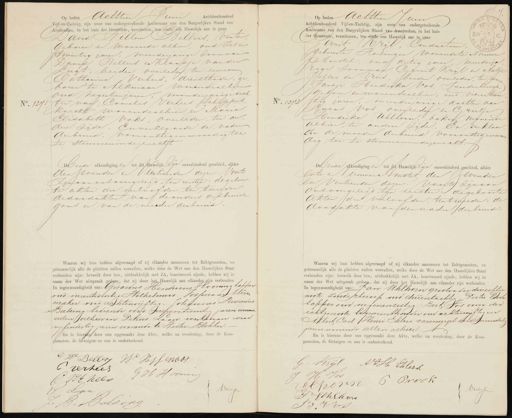 No. 1241 Waarna wij hun hebben afgevraagd of zij elkander aannemen tot Echtgenooten, en getrouwelijk alle de plichten zullen vervullen, welke door de Wet aan den Huwelijken Staat verbonden zijn: hetwelk door hen, uitdrukkelijk met JA, beantwoord zijnde, hebben wij n naamm der Wet uitspraak gedaan, dat zij door het Htuwelijk aan elkander zijn verbonden in tegenwoordigheid van Gerardus Hendricus Wooning kapper oud vierentwintig WilhelmusJossenaar kleer„ maker oud achtenvijftig Johannes Bemardu Balsing bediende old Piepen twintig jaren wonen allen alhier en Petrus Laan werkenan oud vyfendertig jaren wonende te Wester. Blokker. an is hieren door ons opgemaakt deze Ale, welke na voorlezing, door de Kon- paranten, de Getuigen-en ons is onderteekend W Beller W Vossenoof Prerties C Vernees GH Hooning Driessen J Laan alsing Op heden Achttien Juni Achttienhonderd Vijf-en-Tachtig, zijn voor ons ondergeteekende Ambtenaar van den Burgerlijken Stand van Amsterdam, in het huis der Gemechte, verscheten, ten einde oop Huwelijk aan te gaan David Willem Bellers, Ventei„ geboren en wonende alhier, oud zes en twintig jaren, meerderjarige zoon van David Bellers en Klaasje van der Lugt, beiden overleden, ter leemeen Catharna Verhees, dienstbode, ge baren te Alkmaar wonende alhier Oud negentienjaren, minderjarige doch 71 ter van Cornelis Verhies schippers. knecht wonende alhier en Maria Elisabeth voks, overledenter an„ dere zyde. En verklaarde de vader Verbrnid, vooranstegenwoordigtoe te stemmenin degenecht Deide afondigingen tot din uneljk zijn ouverhindend geschied, alier den zevenden en Veertienden dezer Voorts Zyn aan ons overgeelegd ten eersten: de geboor te akten der verloofden, ten tweeden de doodakten van de ouders desbruide doms en van de moeder derbruid Waarna wij hun hebben afgevraagd of zij elkander aannemen tot Echtgenooten, en getrouwelijk alle de plichten zullen vervullen, welke door de Wet aan den Huwelijken Staat verbonden zijn: hetwelk door hen, uitdrukkelijk met JA, beantwoord zijnde, hebben wij n naamm der Wet uitspraak gedaan, dat zij door het Htuwelijk aan elkander zijn verbonden In tegenwoordigheid van Gerardus Hendricus Hooning kopper oud vierentwintig WilhelmusJossenaar kleer„ maker oud achtenvijftig. Johannes Bemardus Balsing bediende old wierentwintig jaren wonend allen alhier en Petrus Laap werkenan oud vyfendertig jaren wonende te Wester. Blokker. an is hieren door ons opgemaakt deze Ale, welke na voorlezing, door de Kon- paranten, de Getuigen-en ons is onderteekend No. 1272 Op heden Achttien Juni Achttienhonderd Vijf-en-Tachtig, zijn voor ons ondergeteekende Ambtenaar van den Burgerlijken Stand van Amsterdam, in het huis der Gemeente, verschenen, ten cinde een Huwelijk aan te gaan CerritKrijl, Conducteur, geborente Hailingen wonende te Nieuwer Amstel, oud dertig jaren, meerderja„ Eige zoon van Gerrit Kril en Antje Gelles de Vries beiden overleden, ter een Pansje Hendrika Vas, zonder beroep, geboren en wonende alhier, oud vierentwin 1272 tig jaren, meerderjarige dochter van Ducas Vos overleden en Grietje Hendrika Uhlhorn, baker wonende alhier ter andere zijde. En verklaar de de moeder derbruid voor onstegenwoor dig, toe te stemmenin degenecht- DeVerde wondiging en tot det Kanend zijn ouerhindend geschied, alhier Cute Nieuwen Amstel den Vevenden en Veertienden dezer, Hoorts zijn aan Ons overgelegd ten eersten de geboorte Akten der verloofden, ten tweeden: de doorakte van den nader der bruid. Waarna wij hun hebben afgevraagd of zij elkander aannemen tot Echtgenooten, en getrouwelijk alle de plichten zullen vervullen, welke door de Wet aan den Huwelijken Staat verbonden zijn: hetwelk door hen, uitdrukkelijk met JA, beantwoord zijnde, hebben wij in naam der Wet uitspraak gedaan, dat zij door het Huwelijk aan elkander zijn verbonden. In tegenwoordigheid van: Jan Uhlhorn grootvader derechtge noote zonderrberoep oud drieentachtig. Pieter Dook tapper oud negenenzestig Bert Vos oom der echtgenoote logementhouder oud achtenwijftig en Albert Carl Henri Ehlers varensgezel oud drieenderti jaren wonende allen alhier. En is hiervan door ons opgemaakt deze Akte, welke na voorlezing, door de Kom- paranten, de Getuigen en ons is onderteekend. G. Krijl AH Eklers H Vos CChorn 6 Prook Driessen I Schlhor B. Vies