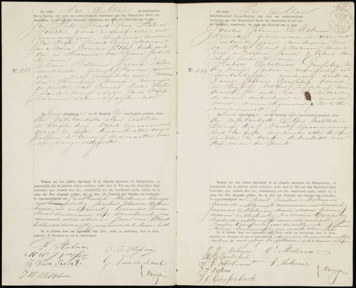 No. 865 Op heden Zes Mer Achttienhonderd Zes-en-Tachtig, zijn voor ons ondergeteekende Ambtenaar van den Burgerlijken Stand van Amsterdam, in het huig der Gemeente, vergebenen, ten einde een Huwelijk aan te an Jan Pieter Fredrik Georg Stalman. Schilder, geboren en wonende alhier, oud evenendertig jaren, meerderjarige zoon van Jan Pieter Fredrik Georg Stalman Jen Maria Cornelia Elsas, beiden overleden en Weduwnaar van Gesina Jonkers, tes eenrelv Maria Willemina uliana Visser Winkelierster, geboren te Haarlem wonende Alhier, oud zevenendertig jaren, wlduwe van Hermanus Brouwer, meerderjarige doehter van Cornelis Lübes Visser zonder beroep en Sijtje Janes Paap, wonende alhier, ter andere zide, De beide afkondiging en tot dit Huwelijk Ein onverhinderd geschied, alhier den Vijfentwintigsten April laatstleden ln tweeden dezer voorts zijn aanonsooer. gelegd, ten eersten: de geboorte akten derverHloofden, ten tweeden: de doodakten hunne vorige echtgenooten. Waarna wij hun hebben afgevraagd of zij elkander aannemen tot Echtgenooten, en getrouwelijk alle de plichten zullen vervullen, welke door de Wet aan den Huwelijken Staat verbonden zijn: hetwelk door hen, uitdrukkelijk met JA, beantwoord zijnde, hebben wij in naam der Wet uitspraak gedaan, dat zij door het Huwelijk aan elkander zijn verbonden. In tegenwoordigheid van: Jan Hendrik Holtman behanger oud tweeendertig Jacobus Johannes Hofman kruier oud achtendertig. Gerardus Heenendaal timmerman oud vierentwintig jaren wonende allen alhier en Jan van Runt bakker oud drieenvijftig jaren wonende te Nieuwer AmstelEn is hiervan door ons opgemaakt deze Akte, welke na voorlezing, door de Komparanten, de Getuigen en ons is onderteekend P No. 8156 Op heden Zes Mei Achttienhonderd Zes-en-Tachtig, zijn voor ons ondergeteekende Ambtenaar van den Burgerlijken Stand van Amsterdam; in het huis der Gemeente, verschenen, ten einde een Huwelijk aan te gaan Jacobus Johannes Molenaar 8 Kleermaker, geboren en wonende alhier, oud Zesentwintig / jaren, meerderjarige zoon van Pieter Gerrit Molenaar zonderbe roep en Johanna Jacoba Aijkens, Wo Nende Valhier, ter /eenreen uberta Geertruida Grossenbag, zoo 00: der beroep, geboren en wonende alhier oud Zes en twintig jaren, meerderjarige dochter van Daniel Johannes Grossenbag Overleden en Huijgertje Volkerszonderberoep, wonen de alhier, ter andere zyde. En verklaarden de ouders desbruidegoms en V moederder bruid, voorons tegenwoordig toe te stem men in dezenecht De beide afkondiging en tot dit Huwelijk Zijn onverhinderd geschied, alhier den vijfentwintigsten April laatstleden en Tweeden dezer voorts zijn aan ons overge legd, ten eersten de geboorte akten der ver loofden, ten tweeden: de doodakte van den vader der bruid. Waarna wij hun hebben afgevraagd of zij elkander aannemen tot Echtgenooten, en getrouwelijk alle de plichten zullen vervullen, welke door de Wet aan den Huwelijken Staat verbonden zijn: hetwelk door hen, uitdrukkelijk met JA, beantwoord zijnde, hebben wij in naam der Wet uitspraak gedaan, dat zij door het Huwelijk aan elkander zijn verbonden In tegenwoordigheid van Gerrit Jacobus Molenaar broeder des echtgenoots timmerman oud Zesendertig Jurriaan Molenaar broeder alsvoren timmer, man oud achtentwintig Jan Casper Grossenbo broeder der echtgenoote sunid ou eenendertig Cr Jan Casper Grossenbog oom der echtgenoote schtenma. beroud Zevenenzestig jaren wonende allen alhier En is hiervan door ons opgemaakt deze Akte, welke na voorlezing, door de Komparanten, de Getuigen en ons is onderteekend uitgezonderd de moeder der echtse noot en de vierde getuige die verklaarden niet te hunnen schrijven J. Molenaar GJ Molenaar HG. Goosten bach. S: G: Holenaar J. Molenaar J H Driesse J Dykens