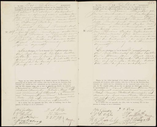 No. 867 Op heden Zes Mei Achtienhonderd Zes-en-Tachtig, zijn voor ons ondergeteekende Ambtenaar van den Burgerlijken Stand van Amsterdam, in het huis der Gemeente, verschenen, ten einde een Huwelijk aan te gaan Willem Golsteijn, bankwerker geboren en wonende alhier, oud tweeëntwin„ tig jaren, minderjarige Soonvan Wil„ Gem Golsteijn werker vanden handel en, Catharina Ruitenberg, wonende alhier, ter lenreen Elisabeth Johanna Wallard, dienst„ bode, geboren en wonende alhier, oud zes ¶ en twintig jaren, meerderjarige dochter van Jacob Wallard en Gysberta van Heesbeen, beiden overleden, ter andere Lijde. En verklaarden de ouders desbuu„ degoms, vooronstegenwoordig, toe te stem„ mpen in degenecht. Oe beidesondiging en tot dit Kunern zijn onverhinderd geschied, alhier. den, Vijfen twintigsten April laatstleden en tweeden deer Voorts Zijn aan ontvoer gelegd, ten eersten: de geboorte akten der Verloofden, ten tweeden. de doodakten van de ouders der bruid. Waarna wij hun hebben afgevraagd of zij elkander aannemen tot Echtgenooten, en getrouwelijk alle de plichten zullen vervullen, welke door de Wet aan den Huwelijken Staat verbonden zijn: hetwelk door hen, uitdrukkelijk met JA, beantwoord zijnde, hebben wij in naam der Wet uitspraak gedaan, dat zij door het Huwelijk aan elkander zijn verbonden. In tegenwoordigheid van: Johannes Golsteijn oom des echtge noots oud zesendertig Johan Adam Rilp oud vierenveertig Hendrik Harmer oud zevenendertig en Savid Leonardus Pictor Jolij oud vierenveertig jaren allen werklieden van beroep en wonende alhier En is hiervan door ons opgemaakt deze Akte, welke na voorlezing, door de Kom- paranten, de Getuigen en ons is onderteeken. hilp No. 868 SJ H & Op heden Zes Oler Achttienhonderd Zes-en-Tachtig, zijn voor ons ondergeteekende Ambtenaar van den Burgerlijken Stand van Amsterdam, in het huis der (Gemeente, verschenen, ten einde een Huwelijk aan te gaan Johannes Grader, Steendrukker, gebo Een en wonende alhier, oud Zesentwintig jaren mneerderjarige zoonvan Johannes Grader overleden en Elisabeth Hendrina Heer. holt, zonder beroep, wonende alhier, tereenu Johanna Elisabeth Engles, zonder beroep, geboren en wonende alhier, oud eenentwintig jaren, minderjarige dochter v: van Thjeodorus Engles Kantoorbediende en Johanna Jacoba Bos, wonende alhier ter andere zijde. En verklaarden de moe der des bruidegoms en de ouders derbruid Vooconstegenwoordig toe te stemmenin degenecht beide afkondiging en tot dit Kunelije Lijn ouverhindend geschied, ahier den Vijfen twintigsten Obris laatstee den en stweeden dezer. Voorts zijnaan Ons overgelegd ten eersten„ degeboorte ak ten den verloofden, ten tweeden: de dood Akte van den vader des bruidegoms. Waarna wij hun hebben afgevraagd of zij elkander aannemen tot Echtgenooten, en getrouwelijk alle de plichten zullen vervullen, welke door de Wet aan den Huwelijken Staat. verbonden zijn: hetwelk door hen, uitdrukkelijk met JA, beantwoord zijnde, hebben wij in naam der Wet uitspraak gedaan, dat zij door het Huwelijk aan elkander zijn verbonden. In tegenwoordigheid van: Karel Wilhelmus Grader, broeder des echtgenoots muziekmeester oud eenendertig Willem Cornelis Potharst tooneelspeler oud drieendertig Arend van Hilten beroep alsvoren oud vijfenveertig jaren wonende allen alhier en Albertus Lina winkelier om zevenendertig jarenwonende te Utrecht En is hiervan door ons opgemaakt deze Akte, welke na voorlezing, door de Kom- paranten, de Getuigen en ons is onderteekend. 7 7