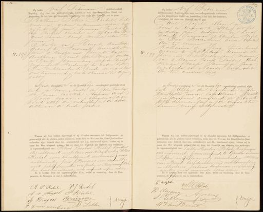 No. 198 Op heden vijf Februari Achttienhonderd Negentig, zijn voor ons ondergeteekende Ambtenaar van den Burgerlijken Stand van Amsterdam in het huis der Gemeente, verephenen, ten einde een Auwelijk aan te gaan Anthonie Petrus Riebel Zil. Versid, geboren en wonende alhier, oud vijfentwintig jaren, zoon van Jacobus Pe tris Riessels overleden en Agattia Brie goos, zonder beroep, wonende alhier, ter Jeeureen Antje van Hengel, dienstbode Geboren te Harderwijk, wonende te Nieu wer Amstel, oud Zevenentwintig jaren dochter van Gerrit Jvan Hengel overleden en Grietje Dannenberg, zonder beroep, Wonende te Harderwyk ter andere zijde En verklaarden de beide moeders, voor Ons tegenwoordig toe te stemmen in desen echt bebeiden afhondigingen tot dit Bureljk zjn onverhindend geschied alhier. Cnte Nieuwer Amstel der Zesen twintig, sten Januari laatstleden en tweeden dezer, Voorts zijn aan ons overgelegd de ge Boorte akten der verloofden en de dood Akten van de beide vaders. Waarna wij hun hebben afgevraagd of zij elkander aannemen tot Echtgenooten, en getrouwelijk alle de plichten zullen vervullen, welke door de Wet aan den Huwelijkschen Staat verbonden zijn: hetwelk door hen, uitdrukkelijk met JA, beantwoord zijnde, hebben wij in naam der Wet uitspraak gedaan, dat zij door het Huwelijk aan elkander zijn verzonden. in tegenwoordigheid van: Petrus Jacobus Riber broeder ees echtgenoots miitair oud drieentwintig Petrus Riekel oom des echtgenoots werkman oud achtendertig Jan Briegoos oom de Sechtge. noots pakhuismeester oud zestig en Benjamin Dik„ keer smid ind achtendertig jaren wonende allen alhier.- En is hiervan door ons opgemaakt/ deze Akte, welke na voorlezing, door de Com- paranten, de Getuigen en ons is onderteekend. No. 1 ag. Op heden vif Februari Achttienhonderd Negentig, zijn voor ons ondergeteekende Ambtenaar van den Burgerlijken Stand van Amsterdam, in het huis der Gemeente, verschenen, ten einde een Huwelijk aan te gaan drel Weyel, Slager, ge boren en wonende te Jutphen, oud Zes en dertig jaren, weduwnaar van Lend Dormits, zoonvan Abraham Wegel en Eva Löuenstem, beiden Overle den, ter lemveen Katharma de Gong, Zouder beroep geboren te Rotterdam, wonende al 77 hier, oud zesenveertig jaren, weduwe van Marcus Jacob Snijders, doch ter van Isaac Samnel de Jong en Alida van Noorden, beiden overle den ter andere zijde De Oerde, afkondiging en tot dit Huwelijk zijn opverhinderd geschied, alhier Ente Zuthhen den negentienden en zesen twintigsten Januari laatstleden. Voorts zijn aanons overgelegd, de geboorte akten derverloofden ende doedakten hunner vorige echtgenooten. Waarna wij hun hebben afgevraagd of zij elkander aannemen tot Echtgenooten, en getrouwelijk alle de plichten zullen vervullen, welke door de Wet aan den Huwelijkschen Staat verbonden zijn: hetwelk door hen, uitdrukkelijk met JA, beantwoord zijnde, hebben wij in naam der Wet uitspraak gedaandat zij door het Huwelijk aan elkander, zijn verbonden. In tegenwoordigheid van: Pallij Hartog Polate Koopman oud vijfenveertig jaren wonende te Gouda Salomon Telur makelaar oud vierenzestig Willem van Biene- boekdrukker oud achtenvijftig en Abraham Joehems koopman ond vieren veertig jaren wonende allen alhier. En is hiervan door ons opgemaakt deze Akte, welke na voorlezing, door de Com- paranten, de Getuigen en ons is onderteekend C. Wejel SHC Polde F deJon AJochems S Teller Driessen W Van B