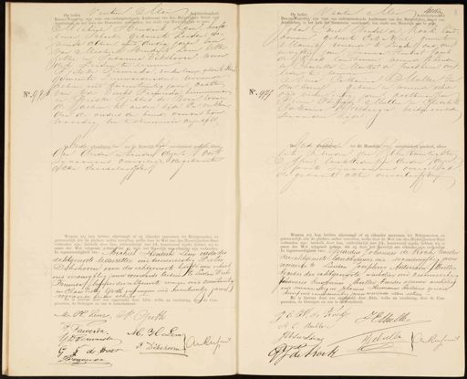 97 3 Mei Dp heden Veertien Achttienhonderd Een-en-Negentig, zijn voor ons ondergeteekende Ambtenaar van den Burgerlijken Stand v. Amsterdam, in het huis der Gemeente, verschenen, ten einde een Huwelijk aan te gaan Michiel Hendrik Lem, hoofd eener School, geboren te Leiden, wo„ nende alhier, oud dertig jaren, zoon van Michiel Hendrik Oem letter Ketter en Tusanna Dikshoorn, wonen„ J dete Leiden ter lemeen Titske Ferwerda, zonder beroep, geboren te Stiens Gemeente Leeuwarderadeel, wonende Alhier, oud tweeentwintig jaren, dochter van Ide Durks Ferverda timmerman 6 en Geiske Fjibbes de Boer, wonen de achier, ter andere zijde. En verklaar den de ouders der buud, voor ons tegen„ toe te stmmen in dezer Echt woordeg De Oeide afkondigingen tot dit Huwvelijk zijn onverhinderd geschied, alhier. J. Dten derden en tienden dezer. Oorts zy naanons overgelegd, de gebooste akten der verloofden Waarna wij hun hebben afgevraagd of zij elkander aannemen tot Echtgenooten, en getrouwelijk alle de plichten zullen vervullen, welke door de Wet aan den Huwelijkschen Staat verbonden zijn: hetwelk door hen, uitdrukkelijk met JA, beantwoord zijnde, hebben wij in naam der Wet uitspraak gedaan/dat zij door het Huwelijk aan elkander zijn verbonden. In tegenwoordigheid van: Michier Hendrik Lem vader des echtgenoots leverzetter ond tweeenzestig Pieter Dikshoorn oom des echtgenoote hpoffd eener school oud vierenvijftig jaren wonende beiden te Leiden Dirk Peerwerda broeder der echtgenoote reiniger oud zesentwintig 7 en Claas Pietter Gerth onderwijzer oud Zesentwintig jaren wonende beiden alhier En is hiervan door ons opgemaakt deze Akte, velke na voorlezing, door de Com- paranten, de Getuigen en ons is onderteekend.