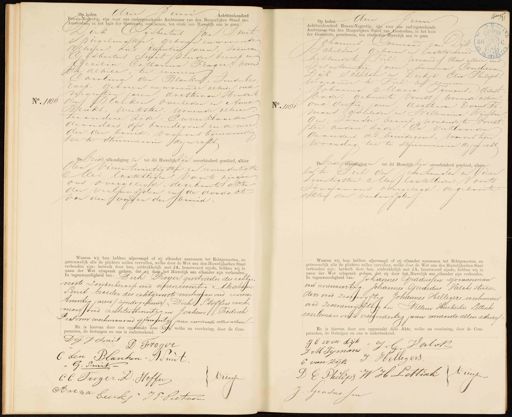 No. 1180 Dp heden drie Aun Achttienhonderd Een-en Negentig, zijn voor ons ondergeteekende Ambtenaar van den Burgerlijken Stand van Amsterdam in het huis der Gemeente verschenen, ten einde een Laverjk aan te gaan, Dirk Fysbertus Jan Smit Spiegelmaker, geboren en wonende alhier, oud twintig jaren, zoon van Gysbertus Smt zonder beroep en tecilia Catharina Froger, wonen „ de alhier ter lemreen „ Carolina den Blanken, Zonderbe roep, geboren en wonende alhier, oud negentien jaren, dochter van Hendrik den Blanken overleden en Anna Beuks, werkster, wonende alhier ter andere zijde. Enverklaarden deouders des bruidegoms en de moe„ der der bruid, voor ons tegenwoordig toe te stemmenin desen echt De Oeide afkondiging en tot dit Huwelijkzijn onverhinderd geschied, alhier den Vierentwintigsten en eenendertigsten Mei laatstleden. Voorts zijn dan ons overgelegd,de gebooste akten der verlootden inf de doodakte van denvader der ound Waarna wij hun hebben afgevraagd of zij elkander aannemen tot Echtgenooten, en getrouwelijk alle de plichten zullen vervullen, welke door de Wet aan den Huwelijkschen Staat verbonden zijn: hetwelk door hen, uitdrukkelijk met JA, beantwoord zijnde, hebben wij in naam der Wet uitspraak gedaan, dat zij door het Huwelijk aan elkander zijn verbonden. In tegenwoordigheid van: Dirk Proger grootvader des echtge„ noots zonder beroep oud vierenzeventig Abraham Smit broeder des echtgenoots werknan oud eenen„ twintig jaren / zijnde gehuwd/ Dirk Stoffers werk man oud achtentwintig en Jochem Frederik Pertoom werkmanoud vijfenveertig jaren wonende allen alhier.- En is hiervan door ons opgemaakt deze Auen welke na voorlezing, door de Com- paranten, de Getuigen en ons is onderteekend. . . . . . . . . . . . . . . . . . . . . . . . . . . . . . . . . . . . . . . . . . . . . . . . . . . . . . . . . . . . . . . . . . . . „