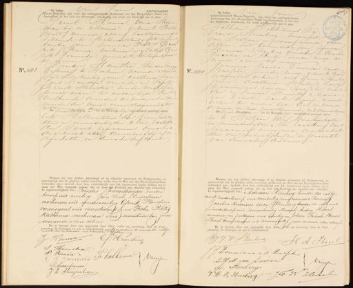 „ Hamstra — No. 1184 412 Op heden vier Juni Achttienhonderd Een-en-Negentig, zijn voor/ons ondergeteekende Ambtenaar van den Burgerlijken Stand van Amsterdam, in het huis der Gemeente, verschenen, ten einde een huwelijk aan te gaan Wilhelm Fokkelinus P. 7 9 brand, Steenbergs, burgembester N van Westjaan en aldaars wonende, geboren Alhier, oud tweeendertig jaren, zoon van Herman Steenberg overleden en Cornelia Jacoba van Klinke, zonder beroep, no¬ nende alhier, ten eenveen Joanna Jacoba Dominicus van der Bussche, zonder beroep. geboren te Goed 6 wonende alhier, oud Zeven en twintig Javen dochter van Hendrik Karel Dominicus van den Bussche, overle„ den en Louisa Henrietta Maria van Demse, zonder beroep, wonende Alhier, ter andere zijde. En verklaarde de moeder der bruid, voor ons tegenwoordig, toe te stemmenn dezerecht De beide afkondiging en tot dit Huwelijk zijn onverhinderd geschied, alhier en te Westzaan den Vierentwintigsten en eenendertigsten Mei laatstleden, Voorts zijn aan ous overgelegd, de geboorteak„ sten der verloofdensen de doodakte van den vader der bruid Waarna wij hun hebben afgevraagd of zij elkander aannemen tot Echtgenooten, en getrouwelijk alle de plichten zullen vervullen, welke door de Wet aan den Huwelijkschen Staat verbonden zijn: hetwelk door hen, uitdrukkelijk met JA, beantwoord zijnde, hebben wij in naam der Wet uitspraak gedaan, dat zij door het Huwelijk aan elkander zijn verbonden. in tegenwoordigheid van: Adriaan Steenberg broeder des echtge„ noots zonder beroep, oud zesendertig jaren wonende te Stavenisse Jacobus Hendricus onco (ftteenberg broeder des ccht envots zonder beroep oud zevenentwintig Hendrik Andries Hoxel commies des psterijen oud veertig en Johan Frederik Werner Hoxel beroep alsween oud zevenendertig jaren wonende allen alhier- En is hiervan door ons opgemaakt deze Akte, Welke na voorlezing, door de Com- paranten, de Getuigen en ons is onderteekend. .. mel W.J.W. Steenberg O Hboril H. A. J. Dominieus v.d. Bussch L H M van Deeuze Driessen H. Steenbergs J.F. „ Hozel J: H. O. Streenberg.