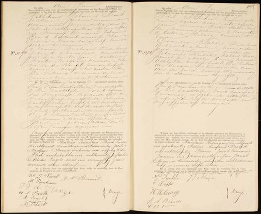 No. 1140 En Achttienhonderd Ip heden drie Een-en-Negentig, zijn voor ons ondergeteekende Ambtenaar van den Burgerlijken Stand van Amsterdam, in het huis der Gemeente, verschenen, ten einde een Huwelijk aan te aan Johannes Pronk Wilhelmus geboren en wonende Werkman negenendertig jaren, ge„ Alhier, oud scheiden echtgenoot van Helena Ma„ ria Brouwer, zoonvan Johannes - Pronk Kantoorbediende en Jobanna Gesna Maria van Niel, wonende Alhier ter eenieen Mania Biesbaar, zonderberoep 1140: Geboren te Amersfoort, wonende alhier oud zesentwintig jaren, dochter van outer Bieshaar overleden en Johan, na van den Hengel, zonder beroep wonende alhier, ter andere tijde En verklaarde de moeder derbrund. voor ons tegenwoordig toe te stemmen in dezen ec De beide aondigingen tot dit Kunelijk zijn onverhinderd geschied, alhier. den Vierentwintigsten en eenendertigsten Mei laatstleden Voorts znaan ons overgelegd, de gebooste akten der Verloofden, eene akte van scheiding van het vorige huwelijk des bruidegoms ende doodakte van den vader dersbiuid. Voorts verklaarden de verloofden bij deze te erkennen een kind, genaamd Johanna Maria Wilhelmina Biestaar, geboren alhier den Elf den Januari dezesjaars Waarna vij hun hebben algemaagd of bij elkander aannemen tot Achtgenooten, en getrouwelijk alle de plichten zullen vervullen, welke door de Wet aan den Huwelijkschen Staat verbonden zjn: hetwelk door hen, uitdrukkelijk met JA, beantwoord zijnde, hebben wij in naam der Wet uitspraak gedaan, dat zij door het Huwelijk aan elkander zijn verbonden. in tegenwoordigheid van: Wouterus Lourentius Fronk broeder des echtgenoots diamantsmijder oud tweeendertig- Jacobus Nicolaas Bezuur werkman ond veertig Pieter Flick suikerbakker ond achtenzestig in Jacobus Albertus Engels simid oud eenenvijftig jaren wonende allen alhier. - „ En is hiervan door ons opgemaakt deze Akte, velke na voorlezing, door de Com- paranten, de Getuigen en ons is onderteekend. . . . . . . . . . . . . . . . . . . . . . . . . . . . . . . . . . . . . . . . . . . . . . . . . . . . . . . . . . . . . . . .