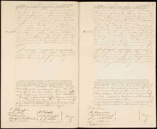 No. 15 95 stien Juli Achttienhonderd Dn heden 20 Eenen-Negentig, zijn voor ons ondergeteekende Ambtenaar van den Burgerlijken Stand van Amsterdam, in het huis der Gemeente, verschenen, ten einde een Huwelijk aan te gaan ornelis Klaassen, meubel¬ maker, geboren en wonende alhier, ond vierentwintig jaren, zoon van Cornelis Klaassen meubelmaker en Alida Cornelia Martina Sparreboer, wo„ nende alhier, ter eenrelv Jannetje Cattarina SChou zonder beroep, geboren te Leiden, uo¬ nende alhier, oud tweeentwintig jaren 40 dochtervan Johan Philip Schon 1 onderberoek en Geertruida Labordus wonende alhier, ter ondere zijde En Verklaarden beiden ouders, voor ons tegenwoordig toe te stemmen in dezen echt De Oeide afkondigingen tot dit muwelij zijn ouverhinderd geschied, alhter den vijfden en twaalfden dezer Voorts Zijnaanons overgeleyd, degeboort Akten der verloofden Waarna wij hun hebben afgevraagd of zij elkander aannemen tot Echtgenooten, en getrouwelijk alle de plichten zullen vervullen, welke door de Wet aan den Huwelijkschen Staat verbonden zijn: hetwelk door hen, uitdrukkelijk met JA, beantwoord zijnde, hebben wij in naam der Wet uitspraak (gedaan, dat zij door,het Huwelijk aan elkander zijn verbonden. In tegenwoordigheid van: Hendrik Klaassen broeder des echtgenoots meubelmaker oud derti Leendert Jacobus Schön broeder der echttge noote kuiper oud zesendertig Carl Wilhelm Heeinrich Aniestedt kantoorbediende oud dertig. en Willem Johannes van Beek reiziger oud zeventig. Jaren wonende allen alhier. En is hiervan door ons opgemaakt deze Akte, welke na voorlezing, door de Coms paranten, de Getuigen en ons is onderteekend, uitgezonderd de moeder der echtgenoote die verklaarde niet te kunnen schrijven . . . . . . . . . . . . . . . . . . . . . . . . . . . . . . . . . . . . . . . . . . . . . . . . . . . . . . . . . . . . . . . . . . . . . . . . . . . . . . . . . . . . . . . . . . . . . . C Klaassen C Schon: H. K H Kloaeen