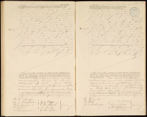 No. 2776 en November Achttienhonderd Vier en Degentig, zijn voor ons ondergeteekende Ambtenaar van den Burgerlijken Stand van Amsterdam in het huis der Gemeente, verschenen, ten einde een Huwelijk aan te gaan Arm Hendrik Anslijn Scheekstimmerman, geloven en wonen„ de actien, oud t tweeentwintig Jaren minderjarige Zooman Pieter An„ tarnie Auslyns Iverdraaier en Derkje Labrie, wonende alhier, lenrees Maria Jan Swinderen, ti „dee beroep, geboren en wonende alhier oud Zeventien Jaren, minderjari„ gedochten pan Pieter Geerts van Jinderen Krnier in Maria Helena van den Bos, wonende, Alhier, ter andere Zijde, Onver„ klaarden beiden inders voor ons te genwoordig toe testemmen in dezen echt De heide afkondigingen tot dit Huwelijk zijn onverhinderd geschied, alhierden Vier Een en elfden deser voorts hun Aan ons overgelegd/, de geboorte ak ten der Veiloofden. Waarna wij hun hebben afgevraagd of zij elkander aannemen tot Echtgenooten, en getrouwelijk alle de plichten zullen vervullen, welke door de Wet aan den Huwelijkschen Staat verbonden zijn: hetwelk door hen, uitdrukkelijk met JA, beantwoord zijnde, hebben wij in naam der Wet uitspraak gedaan, dat zij door het Huwelijk aan elkander zijn verbonden. In tegenwoordigheid van Giert Goszes Clein schipper oud vierentwintig Cornelis ter Beek stalknecht oud dertig Jacob Bok sinid oud vyfenvijftig In Gerrit van Egten werkman oud Zestig Jaren wonende allen alhier. En is hiervan door ous opgemendt deze Akte, welke na voorlezing, door de Com- paranten, de Getuigen en ons is onderteekend uitgezonderd de moeder der echtgenoote die verklaarde niet te kunnen schrijven. No. 2778 Op heden VVeertien November. Achttienhonderd Vier-en-Negentig, zijn voor ons ondergeteekende Ambtenaar van den Burgerlijken Stand van Amsterdam) in het huis der Gemeente verschenen, ten einde een Huwelijk aan te gaan Auke Tymstra Colporteur, geleente Wond gemeente Honseradeel, Wo. 30 nende alhier oud negenentwintig ja ren, meerderjarige zoavan Albe Ban kes Tymstra en Grietje Pieters Bakker, beiden opperleden ten eenree Huitje Kok, zonder beroep, J: Geboren te Joure, gemeente Sotker, land, wonende alhier, ond zese twntig Jaren, meerderjarige dochter Ean Willem Wijtzes Kok mus Werkmaker en Grietje Huites Plan„ tinga, wonende alhier, ter andere tijd On verklaarden de ouders der bruid, Voor ons tegenwoordig toe testemmen in desen echt De beide afkondigingen tot dit Huwelijk zijn onverhinderd geschied, alhier den Verden enVelfden dezer, voorts Sinaanons overgelegd de geboor te aktender verloopden ende dad Vakten roude ouders des buigegoms Waarna wij hun hebben afgevraagd of zij elkander aannemen tot Echtgenooten, en getrouwelijk alle de plichten zullen vervullen, welke door de Wet aan den Huwelijkschen Staat verbonden zijn: hetwelk door hen, uitdrukkelijk met JA, beantwoord zijnde, hebben wij in naam der Wet uitspraak gedaan, dat zij door het Huwelijk aan elkander zijn verbonden. In tegenwoordigheid van: Jan Hendrik Aalders werkman oud negenenzestig Gerardus Nicolaas Venlet winkelier oud vijfentwintig Minne Schotsman metselaar oud vijfentwintig en Wietze Kok, bakker oud achtentwintig jaren wonende allen alhier. En is hiervan door ons opgemaakt deze Akte, welke na voorlezing, door de Com- paranten, de Getuigen en ons is onderteekend, uitgezonderd de vader der echtgenoote die verklaarde niet te kunnen schrijven. B. Hijmstra 9 a J: H. Aalders b Kok G. N. Venlt. J H Plantenga Schöl M Schotsman W Kok