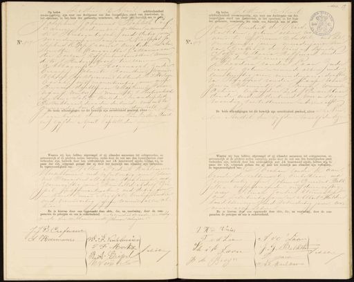 No. 917 i achttienhonderd 1. Op heden zes-en-negentig, zijn voor ons Ambtenaar van den burgerlijken stand van Amsterdam, in het overbaar, in het huis der gemeente verschenen, ten oudder van hureijk aan te gaun osephus Johannes Daptist res Cgeur,bediende, geboren en wonende te 's Vertogenbosch, end dertig jaren meerderjarige Ioon van Nicolofas Jo „ Schhus Grekcoeur overleden en An. Houetta Cllargaritha Catharna van der Doelen, koffiehuishoudster, wonen„ de te 's Hertogerbosch, ter eenreen AAllagenda Hoevenaars, zonder beroek, geboren te Ravenstein, wonende Alhier, Gaatstgeri oond hebbende te 's Herlogen Ooscht, ondnegenentwintig jaren, meen derjarige dochter van Martinus Holve naars, winkelier, wonende te 's Overtogenbosch en Anna Salet, Overleden, ter onderse zij de Pr verklaarde devader derbruid, voor ons te genwoordig toe testemmenin dezen echt De beide afkondigingen tot dit huwelijk zijn onverhinderd geschied, alhier te es Her Vogenbosch den negenentumbioster Maart en lyfden April lootstleden- Waarna wij hun hebben afgevraagd of zij elkander aannemen tot echtgenooten, en getrouwelijk al de plichten zullen vervullen, welke door de wet aan den huwelijkschen staat verbonden zijn, hetwelk door hen uitdrukkelijk met JA beantwoord zijnde, hebben wij. in naam der wet, uitspraak gedaan dat zij door het hhuwelijk aan elkander zijn verbonden. In tegenwoordigheid van Willem Frederik Kuklemeuer Vleeschhouwer, oud vyf enveertig jaren, Johan nes Franciscus Mekse, steenhuuer, oud Zevenenvyftig jaren, Reinhald Adoef Gei pel, insrumentmaker, oud dertig dien. en Karel Conrad Neijssel, bierhuishouder oud vierendertig jaren, wonende allen al„ hier. En is hiervan door ons opgemaakt deze akte, die, na voorlezing, door de com- paranten de getuigen en ons is onderteekend, uitgezonderd de vader der echtge„ noote, die verklaarde niette kunnen schrijven. No. 919 ti 37. Zestien suril achttienhonderd zes-ennegentig, zijn voor ons Ambtenaar van den burgerlijken stand van Amsterdam, in het openbaar, in het huis der gemeente, verschenen, ten einde een huwelijk aan te gaan Jan Hendrik de Vries Kastelein, geboren alhier, oon nende te Nieuwer Amstel, oud te Verentining jaren, meerderjarige zom 7 van Gerbrand de Nries en Lomsa Poffia Maria Hoffman, beiden overleden, ter eenreeuf Theodira zonder Laan, Zonder beroep, geboren en wonende alhier ond eenentwintig jaren, minderjarige dochter von Theodarus zonder Laan, behou ger en Harmyntje de Bruyn, wonende Alhier, ter ondere zijde En verklaard dende ouders der bruid, voor ons tegen woordig toe testemmen in dezen echt De beide afkondigingen tot dit huwelijk zijn onverhinderd geschied, alhier en te Nien Wer Amstel den vijfden en twaalfden dezer Waarna wij hun hebben afgevraagd of zij elkander aannemen tot echtgenooten, en getrouwelijk al de plichten zullen vervullen, welke door de wet aan den buwelijkschen staat verbonden zijn, hetwelk door hen uitdrukkelijk met JA beantwoord zijnde, hebben wij in naam der wet, uitspraak gedaan dat zij door het huwelijk aan elkander, zijn verbonden. In tegenwoordigteid van Obraham zonder L aan Vroeder der echtgenoote, bierbottelaar, oud Zevenentwintig jaren, Johannes Gerardus Balk Stra, wasschverzonder, oud drieen vijftig jaren, Ditmar Jansen, Kkleermaker 1oud Zesentwintig jaren en Albert Mulder, vandelstertigen oud zesendertig jaren, wo- nende allen alhier En is hiervan door ons opgemaakt deze akte, die, na voorlezing, door de com- paranten de getuigen en ons is onderteekend. J. J. B. Crefeveur. A Hoevenaars W. F. Kuklemeren JF Merks schoe R A: Zespel M Veipgel JJ R . teneer A Hoevenaars M v Vuk dien JF Merks schoe. R A: Zespel M Veipgel J H d Vries x A VV Laan T vd Laan 81 JG. Balksta Th vF Luun Schal J.aVI B: de CBruyn A Mulder