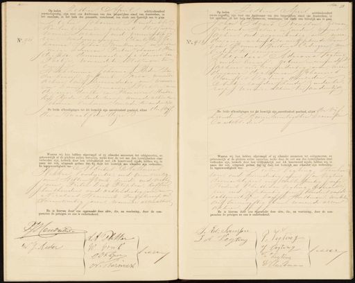 No. 921 heden Zestien vi achtttienhonderd zes-ennegentig,) zijn voor ons Ambtenaar van den burgerlijken stand van Amsterdam, in het openbaar, in het huis der gemeente, verschenen, ten einde een huwelijk aan te gaan ieter Johannes Hendrikse, Kantoorbediende, gelurente Vlissingen wonende alhier, oud vierendertig ja Een, weduwwaarvan Charlotta Co21 hanna Sokhia Brinkman, meerder arige Zoonvan Pieter Johannes Hen drikse, demwaarder en Adriana van Poelje, wonende te Wlissingen, ter in Wilhelmma Johanna Heder, zan der beroep, geboren te Breda, wonende Alhier, oud zevenendertig jaren, weduwe van Daniel Bernardus Plekkes meer derjarige dochter van Franciscus Hendri Kus Reder, zonder beroep, wonende alhier en Johanna Verhoeven, overleden, ter andere zijde De beide alkondigingen tot dit huwelijk zijn onverhinderd geschied, alhier den Vijf den en twaalfden dezer Waarna wij hun hebben afgevraagd of zij elkander aannemen tot echtgenooten, en getrouwelijk al de plichten zullen vervullen, welke door de wet aan den huwelijkschen staat verbonden zijn, hetwelk door hen uitdrukkelijk met JA beantwoord zijnde, hebben wij. in naam der wet, uitspraak gedaan dat zij door het huwelijk aan elkander zijn verbonden. ingegenwoordigeid van Albertus Nathanus Plekker, loodgieter, oud vierenVeertig Jaren, Willem Vonk, Sund, oud veertig jaren, Pieter Dirk Flipsen, koffiehuishouder, oud achtendertig jaren en Nicolaas Werwink, zonderberoep, oud tweeenveertig jaren, wonende allen alhier En is hiervan door ons opgemaakt deze akte, die, na voorlezing, door de comparanten de getuigen en ons is onderteekend. No. 926 t 38 tien April achtienhonderd Op heden zes-en-negentig, zijn voor ons Ambtenaar van den burgerlijken stand van Amsterdam, in het openbaar, in het huis der Gemeente, verschenen, ten einde een huwelijk aan te gaan Johan Edvaro Svensson, Zeeman geboren te Hosmo in weden, wonende alhier, oud negenendertig aien, meer : derjanige natuwrlijke niet erkende zom van Oruma Kristima Cedergren, oei leden, ter eenreen Theodera Adriana Vegting zonder beroep, geboren en wonende alhier, oud eenendertig jaren meer derjarige dochter van Johannes Cornelis Vegting Overleden en Antje zonder Linde, zonderbe roek wonende alhier, ter andere zijd De beide alfkondigingen tot dit buwelijk zijn onverhinderd geschred, alhier den Vijf Lienden en Twee en twintigsten December laatstleden Waarna wij hun hebben afgevraagd of zij elkander aannemen tot echtgenooten, en getrouwelijk al de plichten zullen vervullen, welke door de wet aan den buwelijkschen staat verbonden zijn, hetwelk door hen uitdrukkelijk met JA beantwoord zijnde, hebben wij. in naam der wet, uitspraak gedaan dat zij doorhet huwelijk aan elkander, zijn verbonden. in tegenwoordigheid van Pieter Vegting, steeukenwei, oud drieendertig jaren, Jan Vegting diomantslijker, ind achtentwintig jaren. Frederik Christiaan Vegting, diemonttlij per, oud vijfentwintig dien broeders vande Sechtgenoote en Dariel Horstman, winkelie oud tweeenvyftig jjaren, wonende allen Alhier. En is hiemen door ous opgeslaaht deze afte, die, na voorlezing, door de comparanten de getuigen en ons is onderteekend. J Hendrike A.A Plikker W J. Pieeter W Vont Schoe OOF lipse HWernink J. Kl Svenssen P: Veyting I A Vegting J Vegting schol D Je Keyting D Cluitman