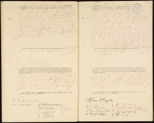 No. 93. Op heden tweeentwintig April achttienhonderd zes-en-negentig, zijn voor ons Ambtenaar van den burgerlijken stand van Amsterdam, in het openbaar, in het huis der gemeente, verschenen, ten einde een huwelijk aan te gaan Hendrik Vinkenbrink, marinier, geboEen en wonende alhier, oud veertig Jaren, meerderjarige zoon van Hendrik Winken, brink, overleden en Elisabeth Ruzou zonder beroep, wonende alhier, ter lemoe Marquerite Nannette Ooster; zonders beroep, geboren en wonende alhier oud vierenVeertig Jaren, weduwe van Hen drik Albertus Mes, mn eerderjarige doch ter van Matthijs Coster en Chustma Johanna Sallien, beiden overleden, ter andere zyde De beide afkondigingen tot dit huwelijk zijn onverhinderd geschied, alhier den twaalf den en negentienden deser, Waarna wij hun hebben afgevraagd of zij elkander aannemen tot echtgenooten, en getrouwelijk al de plichten zullen vervullen, welke door de wet aan den huwelijkschen staat verbonden zijn, hetwelk door hen uitdrukkelijk met JA beantwoord zijnde, hebben wij. in naam der wet, uitspraak gedaan dat zij door het huwelijk aan elkander zijn verbonden. In tegenwoordigheid van Frans Barend Struijken, Kamp, Werkman, oud vyftig jaren, Conrolis Boutjes, werkman, oud vyf en veertig jaren Cornelis Kleis Lanting ambtenaar, oud negenentwintig jaren en August Eduaid zahn, ambttenaar, oud drientwintig jaren wonend e allen alhier. En is hiervan door ons opgemaakt deze akte, die, na voorlezing, door de comparanten de getuigen en ons is onderteekend. E V.roh en bZ wek No. 935 eden tweeentwintig April achttienhonderd zes-en-negentig, zijn voor ons Ambtenaar van den burgerlijken stand van Amsterdam, in het penbaar, in het huis der gemeente, verschenen, ten einde een huwelijk aan te gaan Thomas Johannes van Huystee, sjigarenfabrikant, ge boren en wonende alhier, oud vijfentwintig ja ren, meerderjarige Sooman Wilhe Cuus Van Huijstee, grossier, wonende alhier en CathannaBeelen, overleden, ter lemeen Hendrika Elisabeth Haarhuis, Ionder beroep, geboren te Stad Almelo, wonende alhier oud eenentwintig jaren, minderjarige dochter van Gerarius Haarhuis en Adriana Antonesta de Boek, beiden overleden ter andere tijde, Dn verklaarden devader des bruidegoms ende voogd derbuud, metname Bernard Egberink bakker, benekens haar toeziendevoogd Willem van Huijstee, grossier, wonende beiden alhier, allen voor ons tegenwoordig/toe te sstemmen in dezen echt De beide alfkondigingen tot dit buneijk zijn onverhonderd geschred, alder den Twaalf den en negentienden dezer Waarna wij hun hebben afgevraagd of zij elkander aannemen tot echtgenooten, en getrouwelijk al de plichten zullen vervullen, welke door de wet aan den huwelijkschen staat verbonden zijn, hetwelk door hen uitdrukkelijk met JA beantwoord zijnde, hebben wij, in naam der wet, uitspraak gedaan dat zij door het huwelijk aan elkander, zijn verbonden. in tegenwwoordigheid van Albert Johannes Smeken bode, oud drieenvijftigjaren Jan Schubart bode, oud tweeenvijftig jaren, Johannet Jaco buis Mejan, bode, oud een en vyftig en Ludonicus Johannes Libert,bude, oud Veertig jaren, wonende allen alhier En is hiervan door ons opgemaakt deze akte, die, na voorlezing, door de comparanten de getuigen en ons is onderteekend. P Pirh en br ik F B: Hruijkenkomp Me N. Ooster. C Bontjes dyjsen L antung A.VZahn th J van Huister A J Inieke J Schulmt Orpenich H E Haarhuis W van Huyster J Cusen B Engberisp JJ Lulter &