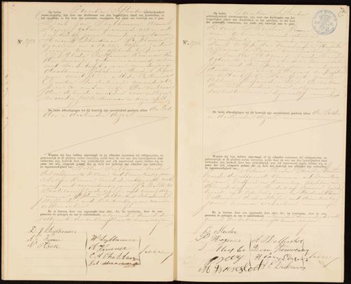 No. 2785. ten Zeventien September achtienhonderd zesen-negentig, zijn voor ons Ambtenaar van den burgerlijken stand van Amsterdam, in het openbaar, in het huis der gemeente, verschenen, ten einde een huwelijk aan te gaan Dirk Jan Seilhouwer, diamant Slijper, / geboren en wonende alhier, oud eenentwintig jaren, minderjarige zoon van Hendrik Christiaan Peyelhouwer 733. overleden en Neeltje Otsen, zonder beroep, wonende alhier, ter gemeen Alida Catharina Kemner, Pou der beroep, geboren en wonende alhier oud tweeentwintig jaren, minderjarige dochtervan JJohannes Hendrik Kem„ ner overleden en Alida Cathanna Gunter, zonderberoep, wonende al„ hier, ter andere zijde. En verklaar, den debeide moeders, voor ens tegen„ woordig toe te stemmen in dezen echt De beide afkondigingen tot dit huwelijk zijn onverhinderd geschied, alhier den Zes„ den en dertienden deser Waarna wij hun hebben afgevraagd of zij elkander aannemen tot echtgenooten, en getrouwelijk al de plichten zullen vervullen, welke door de wet aan den huwelijkschen staat verbonden zijn, hetwelk door hen uitdrukkelijk met JA beantwoord zijnde, hebben wij, in naam der wet, uitspraak gedaan dat zij door het huwelijk aan elkander zijn verbonden. In tegenwoordigheid van Willem Seijlhouwer, broeder des echtgenoots, kellver, oud Zevenentwintig jaren Anlo on Kemmer, broederder echtgenoote, werk„ man, oud negenentwintig jaren, Carel Albertus Chatelam zonderberoep, oud vierensettig jaren en Iduard Albertus Schravemade stoffeerder, oud zesentwintig jaren, wonende allen alhier En is hiervan door ons opgemaakt deze akte, die, na voorlezing, door de com- paranten de getuigen en ons is onderteekend, uitgezonderd demwederder echtgenoote, die verklaarde niette kunnen schrijven D. J Leijlhouwer W: Leylhouwers A. Hemnnn Votzen A Kemner schil C A. Op heden Zeventien Schtember achttienhonderd zes-en-negentig, zijn voor ons Ambtenaar van den burgerlijken stand van Amsterdam, in het openbaar, in het huis der gemeente, verschenen, ten einde een huwelijk aan te gaan Douis Meister, Timmer man, geboren en wonende alhier, ind Vieren twintig jaren, meerderjarige zoonvan 35, Louis Meeister, timmennan en Hendrika Maria de Paauw, wonende alhier, tereenre Pieternella Hogenes, zonder beroep geboren te Nieuwer Amstel, wonendeal, hier, oud drie entwintig jaren, meerderjarige dochtervan Jacob Hogenes, veehouder en Martintje Raveploot, wonende Alhier, ter ondere zijde. En verklaar. den beiden ouders, voor ons tegenwoordig toe testemmen in dezen echt. D De beide afkondigingen tot dit huwelijk zijn onverhinderd geschied, alhier den Zesden en dertienden dezer. Waarna wij hun hebben afgevraagd of zij elkander aannemen tot echtgenooten, en getrouwelijk al de plichten zullen vervullen, welke door de wet aan den huwelijkschen staat verbonden zijn, hetwelk door hen uitdrukkelijk met JA beantwoord zijnde, hebben wij, in„ naam der wet, uitspraak gedaan dat zij door het huwelijk aan elkander zijn verbonden In tegenwoordigheid van: Antonius Theoderus Daniel Meister Groeder des echtgenoots, timmerman, oud Zevenentuin tig jaren, Diedrisch van Kouwenberg, Winkelier, oud tweeendertigaen, Hendrik van Leeuwen, Zonder beroep, oud Zesenzestig jaren en Frrederich Eduard Diekmann, diamontslijker, oud drieentwintig Jaren, wonende allen alhier. En is hiervan door ons opgemaakt deze akte, die, na voorlezing, door de com- paranten de getuigen en ons is onderteekend, uitgezinderd de moederdes echt genoots, die verklaarde niette kunnen schrijven. L Meister P Hogenes A ID Meister ZMeer ter D. van Kouwendr JH H van L feaoe
