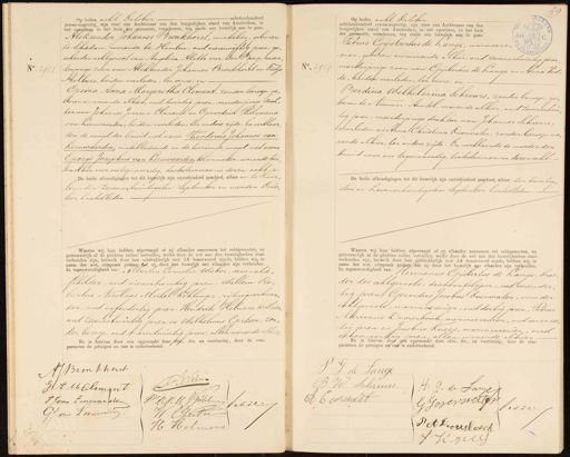 No. 2952. Op heden acht October achttienhonderd zes-en-negentig, zijn voor ons Ambtenaar van den burgerlijken stand van Amsterdam, in het openbaar in het huis der gemeente, verschenen, ten einde een huwelijk aan te gaan Aleksander Johannes Bronkhorst, winkelier, geboren te schiedam, wonende te Haarlem, oud vierenvijftig jaren, ge scheiden echtgenoot van Angelina Aletta van den Berg, meer„ derjarige zoon van Alek sander Johannes Bronkhorst en Vietje Halbers, beiden overleden, ter eenre, en Gesina Anna Margaretha Clement, zonder beroep, ge„ boren en wonende alhier, oud twintig jaren, minderjarige doch„ ter van Johannes Jurrien Clement en Gerardiia Chilomena van Leeuwaarden, beiden overleden, ter andere zijde. En verklaar den de voogd der bruid met name Theodorus Johannes van Leeuwaarden, winkelbediende en de toeziende voogd met name George Josephus van Leeuwaarden, kleermaker, wonende bei„ den alhier, voor ons tegenwoordig, toetestemmen in dezen echt De beide afkondigingen tot dit huwelijk zijn onverhinderd geschied, alhier en te Haar lem, den zevenentwintigsten September en vierden Octo ler laatstleden. Waarna wij hun hebben afgevraagd of zij elkander aannemen tot echtgenooten, en getrouwelijk al de plichten zullen vervullen, welke door de wet aan den huwelijkschen staat verbonden zijn, hetwelk door hen uitdrukkelijk met JA beantwoord zijnde, hebben wij, in naam der wet, uitspraak gedaan dat zij door het huwelijk aan elkander zijn verbonden. in tegenwoordigheid van Albertus Cornelis Weber, decoratie, schilder, oud vierentwintig jaren, Willem Ro„ bertus Nicolaas Michel Köhlinger, vijtuigverhuur„ der, oud vijfendertig jaren, Hendrik Helmers, kelloer oud zevenentwintig jaren en Wilhelmus Gertsen, zon„ der beroep, oud vierentwintig jaren, allen wonende alhier. En is hiervan door ons opgemaakt deze Jakje, die, na voorlezing, door de com- paranten de getuigen en ons is onderteekend. No. 2954 Op heden acht October achttienhonderd zes-en-negentig, zijn voor ons Ambtenaar van den burgerlijken stand van Amsterdam, in het openbaar, in het huis der gemeente, verschenen, ten einde een huwelijk aan te gaan Petrus Gijsbertus de Lange, warmoeze„ nier, geboren en wonende alhier, oud zevenentwintig jaren „: meerderjarige zoon van Gijsbertus de Lange en Anna Vod„ de, beiden overleden, ter eenre, en erdina Wilhelmina Schreurs, zonder beroep, ge boren te Nieuwer-Amstel, wonende alhier, oud zevenentwin tig jaren, meerderjarige dochter van Johannes Schreurs, overleden en Anna Christina Overwater, zonder beroep, wa„ nende alhier, ter andere zijde. En verklaarde de moeder der bruid voor ont tegenwoordig, toetestemmen in dezen echt.- De beide afkondigingen tot dit huwelijk zijn onverhinderd geschied, alhier, den twintig, sten en Zevenentwintigsten September laatstleden. Waarna wij hun hebben afgevraagd of zij elkander aannemen tot echtgenooten, en getrouwelijk al de plichten zullen vervullen, welke door de wet aan den huwelijkschen staat verbonden zijn, hetwelk door hen uitdrukkelijk met JA beantwoord zijnde, hebben wij, in naam der wet, uitspraak gedaan dat zij door het huwelijk aan elkander, zijn verhonden. In tegenwoordigheid van Hermanus Gijsbertus de Lange, broe der des echtgenoots, diamantslijper, oud eenender„ tig jaren Gerardus Jacobus Overwater, vam der echtgenoote, warmoezenier, oud dertig jaren, Februs Adrianus Doorenbosch, warmoezenier, oud eenenzes„ tig jaren en Jacobus Knees, warmoezenier, oud echenveertiig jaren, allen wonende alhier En is hiervan door ons opgemaakt deze akte, die, na voorlezing, door de com- paranten de getuigen ex ons is onderteekend. AJBrinkhout P Hon H.E M Glemment WRMe gotlen Schoe. J J van Leeuwarden G:J: van Leeuwerden W Certre H Helmers P J de Lange BW Schreuss W. J. de Samye J Joverwolr A. Egrewent 7 Schoe P A Loogbersch J Kree