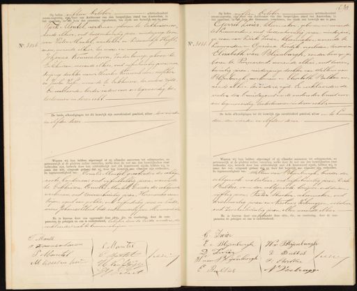 No. 3036 Op heden vijftien October achttienhonderd zes-en-negentig, zijn /voor ons Ambtenaar van den burgerlijken stand van Amsterdam, in het openbaar, in het huis der gemeente, verschenen, ten einde een huwelijk aan te gaan Tjerk Mantel, werkman, geboren te Enkhuizen, wo nende alhier, oud tweeentwintig jaren, minderjarige zoon van Pieter Mantel, winkelier en Dienwertje Hasselman, wonende alhier, ter eenre, en Johanna Kouwenhoven, zonder beroep, geboren te Enkhuizen, wonende alhier, oud vijfentwintig jaren, meerderjarige dochter van Maarten Kouwenhoven, visscher en Jacoba Visser, wonende te Enkhuizen, ter andere zijde. En verklaarden beider ouders voor ons tegenwoordig, toetestemmen in dezen echt.De beide afkondigingen tot dit huwelijk zijn onverhinderd geschied, alhier den vierden en elfden dezer. Waarna wij hun hebben afgevraagd of zij elkander aannemen tot echtgenooten, en getrouwelijk al de plichten zullen vervullen, welke door de wet aan den huwelijkschen staat verbonden zijn, hetwelk door hen uitdrukkelijk met JA beantwoord zijnde, hebben wij, in naam der wet, uitspraak gedaan dat zij door het huwelijk aan elkander zijn verbonden. In tegenwoordigheid van Cornelis Martel, grootvader des echtge noots, landman, oud vijfentachtig jaren, wonende te Enkhuizen, Cornelis Mantel, broeder der echtgenoot werkman, oud zevenentwintig jaren, Hermanns van boijen, agent van politie, oud vijfendertig jaren en kudawiens Johannes Libert, bode, oud eenenveertig jaren, allen wonende Mlie En is hiervan door ons opgemaakt deze akte die, na voorlezing, door de comparanten, de getuigen en ons is onderteekend, behalve door de veide moeders, die verklaarden niet te kunnen schrijven. Mr tol No. 3038. achttienhonderd Op heden vijftien October zes-en-negentig, zijn voor ons Ambtenaar van den burgerlijken stand van Amsterdam, in het openbaar, in het huis der Gemeente, verschenen, ten einde een huwelijk aan te gaan Gerrit Zwier, kleermaker, gebouen en wonende te Leeuwarden, oud tweeentwintig jaren, minderjari ge zoon van Dirk Zwier, kleermaker, wonende te Leeuwarden en Geziena Koedijk, overleden, tereenre, en Elisabeth van Blijenburgh, zonder beroep, ge boren te Tuimerend, wonende alhier, oud tweeentwintig jaren, minderjarige dochter van Willem van Blijenburgh, werkman en Elisabeth Bulkes, wonende alhier, ter andere zyde. En verklaarden de vader des bundegoms en de onders der bruid voor ons tegenwoordig, toetestemmen in dezen echt„De beide afkondigingen tot dit huwelijk zijn onverhinderd geschied, alhier en te Leeuwan den, den vierden en elfden dezer Waarna wij hun hebben afgevraagd of zij elkander aannemen tot echtgenooten, en getrouwelijk al de plichten zullen vervullen, welke door de wet aan den huwelijkschen staat verbonden zijn, hetwelk door hen uitdrukkelijk met JA beantwoord zijnde, hebben wij, in naam der wet, uitspraak gedaan dat zij door het huwelijk aan elkander, zijn verbonden. In tegenwoordigheid van: Willem van Blijenburgh, broeder der echtgenoote, metselaar, oud vijfentwintig jaren, Dirk Bulker, oom der echtgenoote, kuiper, oud drieenvijftig jaren, Pieter Strooker, schoenmaker, oud drienveertig jaren en Nicolaas Verbuiggen, metselaar oud zevenentwintig jaren, allen wonende alhier. En is hiervan door ons (opgemaakt deze akte, die, na voorlezing, door de comparanten de getuigen en ons is onderteekend. I Mantel J Kouwenkoren C Mantel 6 Mantel P Mantel Schie M houden Goden H. Van Coijer Ifgebeet G: Zwier W. v Blijenburgh E v Blijenburgh D Zwier D Bultes Scbol. C W van Blijenburgh : Swrooken N Verbrugge E Bultzes