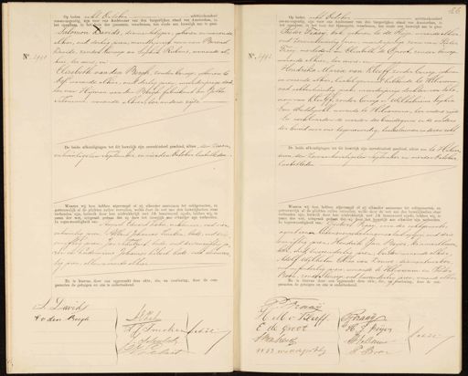 No. 2940 — achttienhonderd Op heden acht October zes-en-negentig, zijn voor ons Ambtenaar van den burgerlijken stand van Amsterdam, in het openbaar, in het huis der gemeente, verschenen, ten einde een huwelijk aan te gaan Salomon Davids, diamantslijper, geboren en wonende alhier, oud dertig jaren, meerderjarige zoon van Barend Davids, zonder beroep en Sophia Rubens, wonende al„ hier, ter eenre, en Elisabeth van den Bergh, zonder beroep, geboren te Oss. wonende alhier, oud dertig jaren, meerderjarige doch„ ter van Hijman van den Bergh, fabrikant en Jetta Salomons, wonende alhier, ter andere zijde. De beide afkondigingen tot dit huwelijk zijn onverhinderd geschied, alhier, den Zeven, en twintigsten September en vierden October laatstleden.- Waarna wij hun hebben afgevraagd of zij elkander aannemen tot echtgenooten, en getrouwelijk al de plichten zullen vervullen, welke door de wet aan den huwelijkschen staat verbonden zijn, hetwelk door hen uitdrukkelijk met JA beantwoord zijnde, hebben wij, in naam der wet, uitspraak gedaan dat zij door het huwelijk aan elkander zijn verbonden. In tegenwoordigheid van August Eduard Zahn, ambtenaar, oud vier„ en twintig jaren, Albert Johannes Smeken, bode, oud drie envijftig jaren, Jan Schubart, bode, oud drieenvijftig ja„ ren en Ludowieus Johannes Libert, bode, oud eenenveer„ tig jaren, allen wonende alhier. En is hiervan door ons opgemaakt deze akte, die, na voorlezing, door de com- paranten de getuigen en ons is onderteekend. No. 2942 achttienhonderd Op heden acht October zes-en-negentig, zijn voor ons Ambtenaar van den burgerlijken stand van Amsterdam, in het openbaar, in het huis der Gemeente, verschenen, ten einde een huwelijk aan te gaan Pieter Fraay, kok, geboren te de Rijp, wonende alhier oud zevenentwintig jaren, meerderjarige zoon van Pieter Fraaij, overleden en Elisabeth de Groot, zonder beroep wonende alhier, ter eervre, en Hendrika Maria van Kleeff zonder beroep, geboren en wonende alhier, laatst gewoond hebbende te Hilversum oud achtentwintig jaren, meerderjarige dochter van Sala mon van kleeff, zonder beroep en Wilhelmina Sophia Eva Weddepohl, wonende te Hilversum, ter andere zijde En verklaarden de moeder des bruidegoms en de ouders der bruid voor ons tegenwoordig, toetestemmen in dezen echt„ De beide afzondigingen tot dit huweljk zijn onverhinderd geschied, alhier en te Hilver sum, den Zevenentwintigsten September en vierden October laatstleden Waarna wij hun hebben afgevraagd of zij elkander aannemen tot echtgenooten, en getrouwelijk al de plichten zullen vervullen, welke door de wet aan den huwelijkschen staat verbonden zijn, hetwelk door hen uitdrukkelijk met JA beantwoord zijnde, hebben wij, in naam der wet, uitspraak gedaan dat zij door het huwelijk aan elkander, zijn verbonden. In tegenwoordigheid van: Gijsbert Fraay, oom des echtgenoots, agent eenen levensverzekeringmaatschappij, oud drie envijftig jaren, Hendrik Jan Beijer, diamantbewer ker, oud tweeendertig jaren, beiden wonende alhier Adolf Wilhelm Ellisa van Douwe, diamantwerker, oud vijfendertig jaren, wonende te Hilversum en Pieter Boon, zonder beroep, oud tweeendertig jaren, wonende alhier En is hiervan door ons opgemaakt deze akte, die, na Voorlezing, door de con- paranten de getuigen en ons is onderteekend. S. David A.E Zahn E v den Bergh. AJ. Imoken Schol Schubwt J7 Ccheet P: Braaij H. M v Kleeff. Goranij E de Groot H. J. Beijer Schoe- WVwankenss WGe Doren W de wendepote P Boon