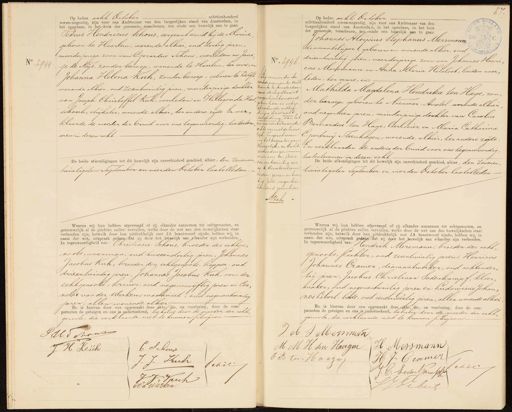 wonende alhier, oud zesentwintig jaren, meerderjarige dochter. n van Joseph Christoffel Kuh, overleden en Hillegonda Hul„ sebosch, strijkster, wonende alhier, ter andere zijde En ver„ klaarde de moeder der bruid voor ons tegenwoordig, toetestem men in dezen echt: De beide afkondigingen tot dit huwelijk zijn onverhinderd geschied, alhier, den Zevenen twintigsten September en vierden October laatstleden.— Waarna wij hun hebben afgevraagd of zij elkander aannemen tot echtgenooten, en getrouwelijk al de plichten zullen vervullen, welke door de wet aan den huwelijkschen staat verbonden zijn, hetwelk door hen uitdrukkelijk met JA beantwoord zijnde, hebben wij, in naam der wet, uitspraak gedaan dat zij door het huwelijk aan elkauder zijn verbonden. In tegenwoordigheid van Christiaan Schous, broeder des echtge„ noots, voerman, oud tweeendertig jaren, Johannes Jacobus Kuh, broeder der echtgenoote, kapper, oud drieentwintig jaren, Johannes Jacobus Kuh, vom der echtgenoote, kuner, oud negenenvijftig jaren en Cor„ nelis van der Werken, machinist, oud negenentwintig jaren, allen wonende alhier. En is hiervan door ons opgemaakt deze aktedie, na voorlezing, door de com- paranten de getuigen en ons is onderteekend, behalve door de moeder der echt, genoote, die verklaarde niet te kunnen schrijven PMS Sous C Schoud J. H. Loich PJsaal C Schoud J. H. Loich J. J. Kuh Schol Vasch bla werkn No. 2946. 2 Bijvornis der Ar. rondirsements. Recht. bank te Amsterdam, van dertig Maart enegentienhonderd zeventien is uitge- eprolen de ontben-: ding door echt scheiding van het =„in nevensstaande: akte vermelde huwe ijk. Ingeschreven: in het register van Huwelijken en Echt. scheidingen num mer een a, folio: een en twintig ven„ 60 te Amsterdam: heden, zeven en twin tig Juli negentien honderd zeventien. Azak Op heden acht October achttienhonderd zes-en-negentig, zijn voor ons Ambtenaar van den burgerlijken stand van Amsterdam, in het openbaar, in het huis der gemeente, verschenen, ten einde een huwelijk aan te gaan Johannes Hloisius Stephanus Mersmann, diamantslijper, geboren en wonende alhier, oud drieentwintig jaren, meerderjarige zoon van Johannes Henri 7/70. cus Mersmann en Anna Maria Helsloot, beiden over„ is der dr. leden, ter eenre, en ents. Recht. meterdam Mathilda Magdalena Hendrika ten Hage, zon Maart honderd der beroep, geboren te Nieuwer- Amstel, wonende alhier is uitge ontbid oud negentien jaren, minderjarige dochter van Carolus wande Bernardus ten Hage, leerlooier en Maria Catharina elde huwe dreven Geertruij Steenhagen, wonende alhier, ter andere zijde ister van en Echt: En verklaarden de onders der bruid voor ons tegenwoordig. gen num a folio toetestemmen in dezen echt.- entig ver: De beide afkondigingen tot dit huwelijk zijn onverhinderd geschied, alhier, den Zevenen terdam: twintigsten September en vierden October laatstleden. regentien evertien. 17 Waarna wij hun hebben afgevraagd of zij elkander aannemen tot echtgenooten, en getrouwelijk al de plichten zullen vervullen, welke door de wet aan den huwelijkschen staat verbonden zijn, hetwelk door hen uitdrukkelijk met JA beantwoord zijnde, hebben wij, in naam der wet, uitspraak gedaan dat zij door het huwelijk aan elkander, zijn verbonden In tegenwoordigheid van Hendrik Mersmann, broeder des echt„ genoots, slachter, oud zesentwintig jaren, Henricus Johannes Cramer, diamantwerker, oud achtender„ tig jaren, Jacobus Christiaan Sodenkampf, kleer„ maker, oud negenentwintig jaren en Ludowicus Johan, nes Libert, bode, oud eenenveertig jaren, allen wonende alhier En is hiervan door ons opgemaakt deze akte, die, na voorlezing, door de com- paranten de getuigen en ons je, onderteekend, behalve door de moeder der echt„ genoote, die verklaarde niet te kunnen schrijven. Jd J Menman H Mersmann M M H ten Haagen HJ. Cramer B ten Haag en Fchöe J: E. Loderampo