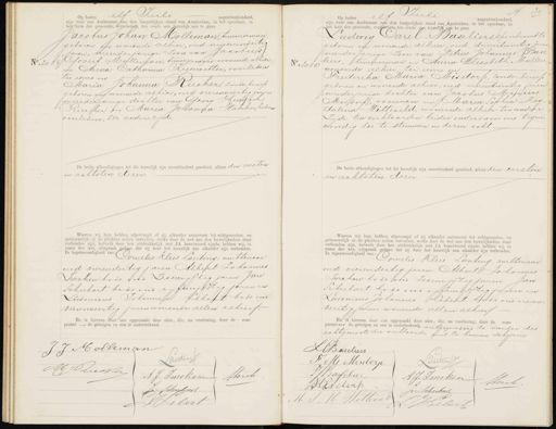 No. 20541 Op heden elf Juli negentienhonderd zijn voor ons Ambtenaar van den burgerlijken stand van Amsterdam, in het openbaar, in het huis der gemeente, verschenen, ten cinde een huwelijk aan te gaan Jacobus Johan Molleman, timmerman geboren en wonende alhier, oud negenendertig jaren, meerderjarige zoon van Jacobus : Govert Malleman, timmerman wonende alhier en Anna Catharina Riesewetter, overleden ter eenre en Maria Johanna Riecker, zonder beroep geboren en wonende alhier, oud vierenveertig jaren meerderjarige dochter van Georg Hendrik Riecker en Maria Johanna Wakker, beiden overleden, ter andere zijde De beide afkondigingen tot dit huwelijk zijn onverhinderd geschied, alhier den eersten en achtsten dezer Waarna wij hun hebben afgevraagd of zij elkander aannemen tot echtgenooten, en getrouwelijk al de plichten zullen vervullen, welke door de wet aan den huwelijkschen staat verbonden zijn, hetwelk door hen uitdrukkelijk met JA beantwoord zijnde, hebben wij, in naam der wet, uitspraak gedaan dat zij door het huwelijk aan elkander zijn verbonden. In tegenwoordigheid van Cornelis Kleis Lanting, ambtenaar oud vierendertig jaren. Albert Johannes Imcken bode oud zesenvijftig jaren Jan Schubart bode oud vijfenvijftig jaren en Ludowicus Johannes Libert bode oud vierenveertig jaren wonende allen alhier En is hiervan door ons opgemaakt deze akte, die, na voorlezing, door de - com- parant en de getuigen en ons is onderteekend. No. 2055 Op heden elf Juli negentienhonderd zijn voor ons Ambtenaar van den burgerlijken stand van Amsterdam, in het openbaar, in het huis der gemeente, versekenen, ten einde een huwetik aan te gaan Ludwig Carel Baseliers, spoorbeambte geboren en wonende alhier, oud drieentwintig jaren meerderjarige zoon van Petrus Johannes Base liers, timmerman en Anna Elisabeth Muller 8 wonende alhier ter eenre en Frederika Maria Misdorp, zonder beroep geboren en wonende alhier, oud eenentwintig jaren minderjarige dochter van Jacobus Marius Misdorp, voerman en Maria Sophia Mag„ datena Witteveld, wonende alhier, ter andere Zijde. En verklaarden beider ouders voor ons tegen„ woordig toe te stemmen in dezen echt- De beide afkondigingen tot dit huwelijk zijn onverhinderd geschied, alhier den eersten en achtsten dezer Waarna wij hun hebben afgevraagd of zij elkander aannemen tot echtgenooten, en getrouwelijk al de plichten zullen vervullen, welke door de wet aan den huwelijkschen staat verbonden zijn, hetwelk door hen uitdrukkelijk met JA beantwoord zijnde, hebben wij, in naam der wet, uitspraak gedaan dat zij door het huwelijk aan elkander zijn verbonden. In tegenwoordigtend van Cornelis Kleis Lanting, ambtenaar oud vierendertig jaren. Albert Johannes Smcken bode oud zesenvijftig jaren. Jan Schubart bode oud vijfenvijftig jaren en Ludowicus Johannes Libert bode oud vieren„ veertig jaren wonende allen alhier En is hiervan door ons opgemaakt deze akte, die, na voorlezing, door de com- paranten de getuigen en ons is onderteekend, uitgezonderd de moeder des echtgenoots die verklaarde miet te kunnen schrijven LCBaseliers Domise J J Holleman Lanstug MRrusver Aterch A J. Imeken J Schrlenss JLibert